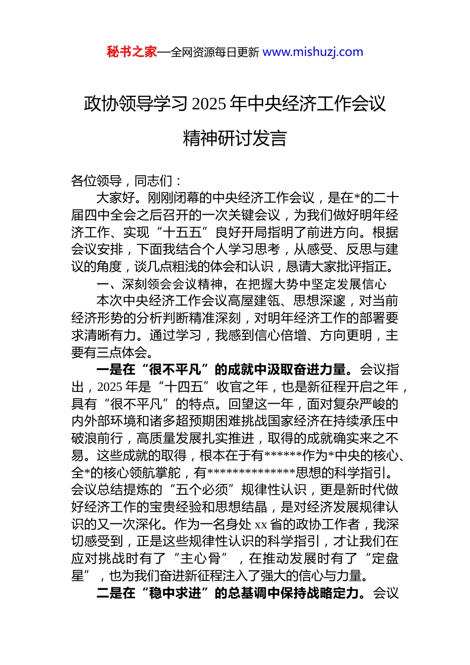 秘书之家—全网资源每日更新 www.mishuzj.com政协领导学习 2025 年中央经济工作会议精神研讨发言各位领导,同志们:大家好。刚刚闭幕的中央经济工作会议,是在*的二十届四中全会之后召开的一次关键会议,为我们做好明年经济工作、实现“十五五”良好开局指明了前进方向。根据会议安排,下面我结合个人学习思考,从感受、反思与建议的角度,谈几点粗浅的体会和认识,恳请大家批评指正。一、深刻领会会议精神,在把握大势中坚定发展信心本次中央经济工作会议高屋建瓴、思想深邃,对当前经济形势的分析判断精准深刻,对明年经济工作的部署要求清晰有力。通过学习,我感到信心倍增、方向更明,主要有三点体会。一是在“很不平凡”的成就中汲取奋进力量。会议指出,2025 年是“十四五”收官之年,也是新征程开启之年,具有“很不平凡”的特点。回望这一年,面对复杂严峻的内外部环境和诸多超预期困难挑战国家经济在持续承压中破浪前行,高质量发展扎实推进,取得的成就确实来之不易。这些成就的取得,根本在于有******作为*中央的核心、全*的核心领航掌舵,有**************思想的科学指引。会议总结提炼的“五个必须”规律性认识,更是新时代做好经济工作的宝贵经验和思想结晶,是对经济发展规律认识的又一次深化。作为一名身处 xx 省的政协工作者,我深切感受到,正是这些规律性认识的科学指引,才让我们在应对挑战时有了“主心骨”,在推动发展时有了“定盘星”,也为我们奋进新征程注入了强大的信心与力量。二是在“稳中求进”的总基调中保持战略定力。会议秘书之家—全网资源每日更新 www.mishuzj.com再次强调要坚持“稳中求进”工作总基调这体现了*中央对当前复杂形势的清醒认识和驾驭经济全局的非凡智慧。“稳”是主基调、是大局,意味着经济运行要保持在合理区间,就业和物价要基本稳定,重点领域风险要可控。但“稳”绝非停滞不前、无所作为,而是在“稳”的基础上更加奋发有为地“求进”。这个“进”,是高质量的进,是结构优化的进,是创新驱动的进。在当前经济恢复基础尚不牢固的背景下,保持这份战略定力尤为重要。它要求我们不能因为一时的指标波动而自乱阵脚,也不能为了片面的增长而搞“大水漫灌”式的强刺激,而是要保持耐心坚持一张蓝图绘到底,把发展的着力点更多地放在转方式调结构、提质量、增效益上。三是在“积极有为”的政策取向中把握发展机遇。会议释放了明确而积极的政策信号,提出要实施“更加积极有为”的财政政策和“适度宽松”的货币政策。这与之前的表述相比,在“积极”之后增加了“有为”,在“稳健”之前转向了“宽松”,蕴含着深刻的政策意图和重大的发展机遇。有权威分析预测,明年的财政赤字率可能提升至 4%左右同时将继续发行超长期特别国债和地方政府专项债券这无疑将为扩大有效投资、补齐发展短板提供宝贵的资金支持。对 xx 省而言,这意味着在争取国家重大项目、推进基础设施建设、保障和改善民生等方面,都将迎来一个重要的政策窗口期。我们必须敏锐捕捉这些机遇,提前谋划、主动对接,将中央的政策红利切实转化为推动 xx 高质量发展的强大动力。二、精准聚焦重点任务,在服务大局中找准履职坐标学习会议精神,关键在于结合实际、学以致用。作为xx 市政协的一员,我认为要自觉把政协工作置于国之大者、省之大计中去考量和谋划,找准履职的切入点和发力点,为服务中心大局贡献智慧。一是紧扣扩大内需战略基点,助力畅通经济循环。会秘书之家—全网资源每日更新 www.mishuzj.com议将扩大内需摆在明年经济工作的突出位置,强调要建设强大的国内市场。政协组织人才荟萃、联系广泛,可以在这方面大有作为。我们应当围绕如何激发消费潜能、扩大有效益的投资开展深度调研和协商。比如,聚焦大规模设备更新和消费品以旧换新的“两新”政策落地情况,深入研究如何进一步打通堵点;聚焦养老育幼、医疗健康等服务消费领域的新需求,提出优化供给的对策;聚焦优化营商环境、提振民营企业投资信心通过专题协商、提案办理等方式,推动相关政策的完善与落实,为构建以国内大循环为主体、国内国际双循环相互促进的新发展格局献计出力。二是紧...
