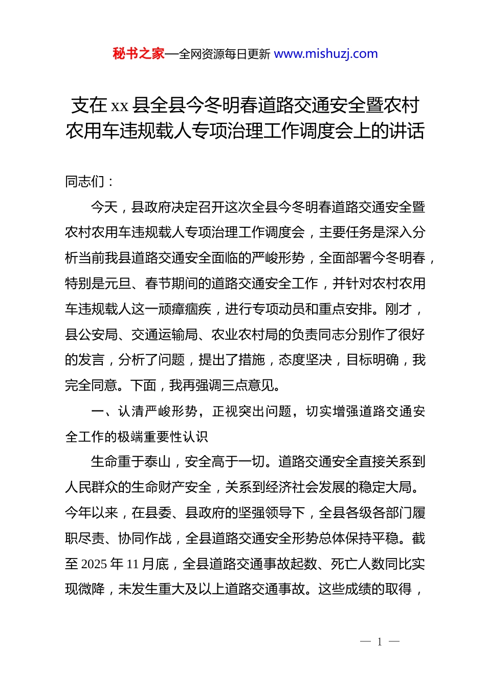 秘书之家—全网资源每日更新 www.mishuzj.com支在 xx 县全县今冬明春道路交通安全暨农村农用车违规载人专项治理工作调度会上的讲话同志们:今天,县政府决定召开这次全县今冬明春道路交通安全暨农村农用车违规载人专项治理工作调度会,主要任务是深入分析当前我县道路交通安全面临的严峻形势,全面部署今冬明春,特别是元旦、春节期间的道路交通安全工作,并针对农村农用车违规载人这一顽瘴痼疾,进行专项动员和重点安排。刚才,县公安局、交通运输局、农业农村局的负责同志分别作了很好的发言,分析了问题,提出了措施,态度坚决,目标明确,我完全同意。下面,我再强调三点意见。一、认清严峻形势,正视突出问题,切实增强道路交通安全工作的极端重要性认识生命重于泰山,安全高于一切。道路交通安全直接关系到人民群众的生命财产安全,关系到经济社会发展的稳定大局。今年以来,在县委、县政府的坚强领导下,全县各级各部门履职尽责、协同作战,全县道路交通安全形势总体保持平稳。截至 2025 年 11 月底,全县道路交通事故起数、死亡人数同比实现微降,未发生重大及以上道路交通事故。这些成绩的取得,— 1 —秘书之家—全网资源每日更新 www.mishuzj.com是全县上下共同努力的结果,值得充分肯定。但是,在肯定成绩的同时,我们必须清醒地认识到,当前我县道路交通安全领域的风险隐患依然巨大,基础仍然薄弱,形势不容乐观。特别是进入冬季,低温、雨雪、冰冻、雾霾等恶劣天气多发频发,给道路通行带来严重安全隐患。同时,随着元旦、春节两大节日的临近,人流、车流、物流将进入高峰期,交通保安全、保畅通的压力陡增。结合近期排查和日常监管情况看,几个突出问题必须引起我们的高度警觉。一是农村道路安全基础脆弱。我县是典型的山区农业大县,农村公路等级低、路况复杂,临水临崖、急弯陡坡路段多。许多“村村通”公路的安全防护设施、警示标志标线等仍有缺失,本质安全水平不高。这些先天不足,在冬季恶劣天气条件下,风险被急剧放大。二是重点车辆源头监管存在漏洞。部分运输企业安全生产主体责任落实不到位,“两客一危一货”等重点车辆的动态监控和日常管理仍有盲区。特别是农用车,包括拖拉机、三轮汽车、变型拖拉机等,其设计用途是农业生产作业,而非载人交通工具,安全性能与客运车辆有着天壤之别。然而,在广大农村地区,农用车违规载人现象屡禁不止,成为移动的“公路杀手”,一旦发生事故,极易造成群死群伤的恶性后果。— 2 —秘书之家—全网资源每日更新 www.mishuzj.com三是交通参与者安全意识普遍淡薄。无证驾驶、酒后驾车、超速超员、疲劳驾驶等严重违法行为时有发生。尤其是在农村地区,部分群众图方便、图省事,明知农用车载人危险,却抱着“没事”“就一小段路”的侥幸心理乘坐。驾驶员安全意识缺失,法律观念淡薄,视生命如儿戏,这些都是引发交通事故最直接、最主要的人为因素。四是执法管控与宣传教育的深度广度不足。当前我们的路面管控力量主要集中在城区和国省干道,向农村地区延伸不足,存在管理上的“真空地带”。宣传教育方式单一,内容陈旧,未能真正触及群众内心,特别是对老年人等重点群体的精准滴灌式宣传远远不够。同志们,问题就是命令,隐患就是事故。面对这些问题和挑战,全县上下绝不能有丝毫的麻痹和松懈。必须深刻认识到,抓好今冬明春的道路交通安全工作,既是一项严肃的政治任务,也是一项重大的民生工程。各乡镇(街道)、各部门要立刻紧张起来、行动起来,以“时时放心不下”的责任感和“事事落实到位”的执行力,坚决扛起保安全、护稳定的政治责任。二、聚焦关键环节,采取超常举措,坚决打赢今冬明春交通安全整治攻坚战今冬明春道路交通安全工作的总体要求是:紧盯“减量控— 3 —秘书之家—全网资源每日更新 www.mishuzj.com大”总目标,以防范化解重大安全风险为主线,以农村农用车违规载人专项治理为突破口,坚持系统治理、依法治理、综合治理、源头治理,全面排查整治风险隐患,严厉打击各类交通违法行为,全力确保人民群众生命财产安全。具体要做到“三个聚焦、三个到位”。第一,聚焦农用车违规载人顽...