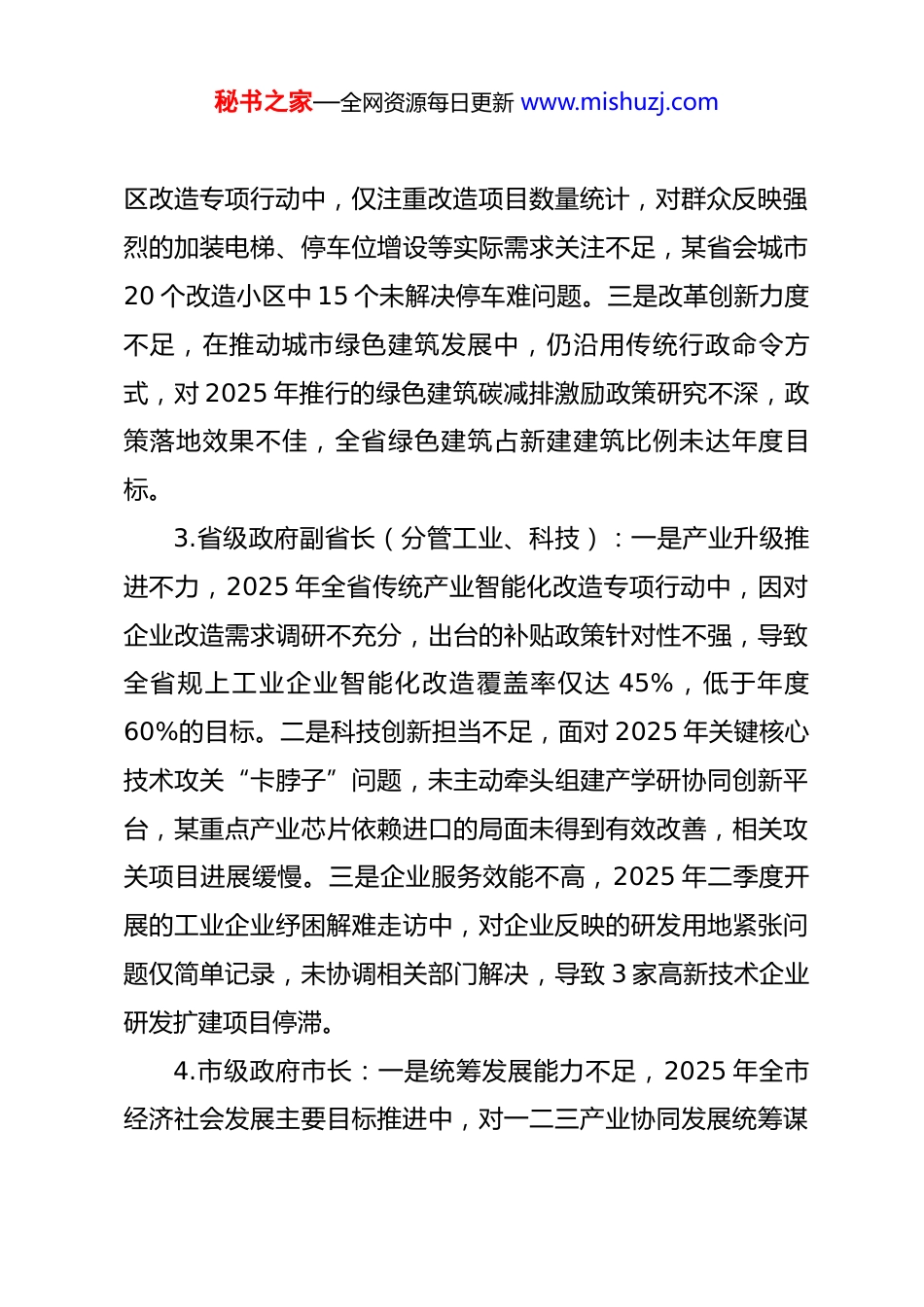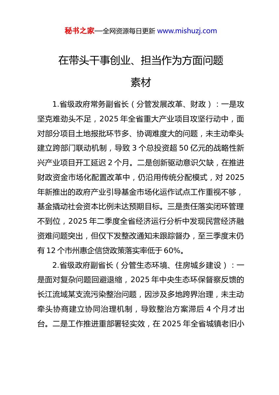 秘书之家—全网资源每日更新 www.mishuzj.com在带头干事创业、担当作为方面问题素材1.省级政府常务副省长(分管发展改革、财政):一是攻坚克难劲头不足,2025 年全省重大产业项目攻坚行动中,面对部分项目土地报批环节多、协调难度大的问题,未主动牵头建立跨部门联动机制,导致 3 个总投资超 50 亿元的战略性新兴产业项目开工延迟 2 个月。二是创新驱动意识欠缺,在推进财政资金市场化配置改革中,仍沿用传统分配模式,对 2025年新推出的政府产业引导基金市场化运作试点工作重视不够,基金撬动社会资本比例未达预期目标。三是责任落实闭环管理不到位,2025 年二季度全省经济运行分析中发现民营经济融资难问题突出,但仅下发整改通知未跟踪督办,至三季度末仍有 12 个市州惠企信贷政策落实率低于 60%。2.省级政府副省长(分管生态环境、住房城乡建设):一是面对复杂问题回避退缩,2025 年中央生态环保督察反馈的长江流域某支流污染整治问题,因涉及多地跨界治理,未主动牵头协商建立协同治理机制,导致整治方案滞后 4 个月才出台。二是工作推进重部署轻实效,在 2025 年全省城镇老旧小秘书之家—全网资源每日更新 www.mishuzj.com区改造专项行动中,仅注重改造项目数量统计,对群众反映强烈的加装电梯、停车位增设等实际需求关注不足,某省会城市20 个改造小区中 15 个未解决停车难问题。三是改革创新力度不足,在推动城市绿色建筑发展中,仍沿用传统行政命令方式,对 2025 年推行的绿色建筑碳减排激励政策研究不深,政策落地效果不佳,全省绿色建筑占新建建筑比例未达年度目标。3.省级政府副省长(分管工业、科技):一是产业升级推进不力,2025 年全省传统产业智能化改造专项行动中,因对企业改造需求调研不充分,出台的补贴政策针对性不强,导致全省规上工业企业智能化改造覆盖率仅达 45%,低于年度60%的目标。二是科技创新担当不足,面对 2025 年关键核心技术攻关“卡脖子”问题,未主动牵头组建产学研协同创新平台,某重点产业芯片依赖进口的局面未得到有效改善,相关攻关项目进展缓慢。三是企业服务效能不高,2025 年二季度开展的工业企业纾困解难走访中,对企业反映的研发用地紧张问题仅简单记录,未协调相关部门解决,导致 3 家高新技术企业研发扩建项目停滞。4.市级政府市长:一是统筹发展能力不足,2025 年全市经济社会发展主要目标推进中,对一二三产业协同发展统筹谋秘书之家—全网资源每日更新 www.mishuzj.com划不够,导致上半年服务业增加值增速低于全省平均水平 1.2个百分点。二是重大项目推进乏力,2025 年全市重点招商引资项目“百日攻坚”行动中,对 2 个总投资超 30 亿元的龙头项目,未亲自牵头对接服务,项目落地过程中因要素保障不到位延迟开工。三是民生实事落实不扎实,2025 年市政府承诺的 10 件民生实事中,农村饮水安全提升工程因前期调研不细致,部分山区管网铺设方案不合理,导致工程进度滞后 3 个月,影响 2 万余名群众饮水安全。5.市级政府常务副市长(分管财政、应急管理):一是财政保障精准性不足,2025 年全市应急管理专项资金分配中,未充分考虑各区(县)灾害风险等级差异,采取平均分配方式,导致高风险地区应急物资储备不足,在汛期洪涝灾害中出现物资短缺问题。二是应急处置担当不够,2025 年夏季全市突发极端高温天气,面对电力供应紧张局面,未及时果断出台有序用电调控方案,导致部分企业停工、居民生活受影响,处置滞后引发群众不满。三是基层减负落实不到位,2025 年仍存在变相增加基层财政工作负担的情况,要求各区(县)每月报送财政收支分析材料 15 份以上,基层财政干部疲于应付,影响核心工作推进。6.市级政府副秘书长(分管政务服务、数据管理):一是秘书之家—全网资源每日更新 www.mishuzj.com数字政府建设推进缓慢,2025 年全市“一网通办”升级改造工作中,因协调不力,各部门数据壁垒未打破,23 项高频政务服务事项仍需群众多头提交材料,未实现真正意义上的“一窗受理”。二是工作创新意识不强,在推进政务服务便民化改革中,对 2025 年新推出的“跨省通办...