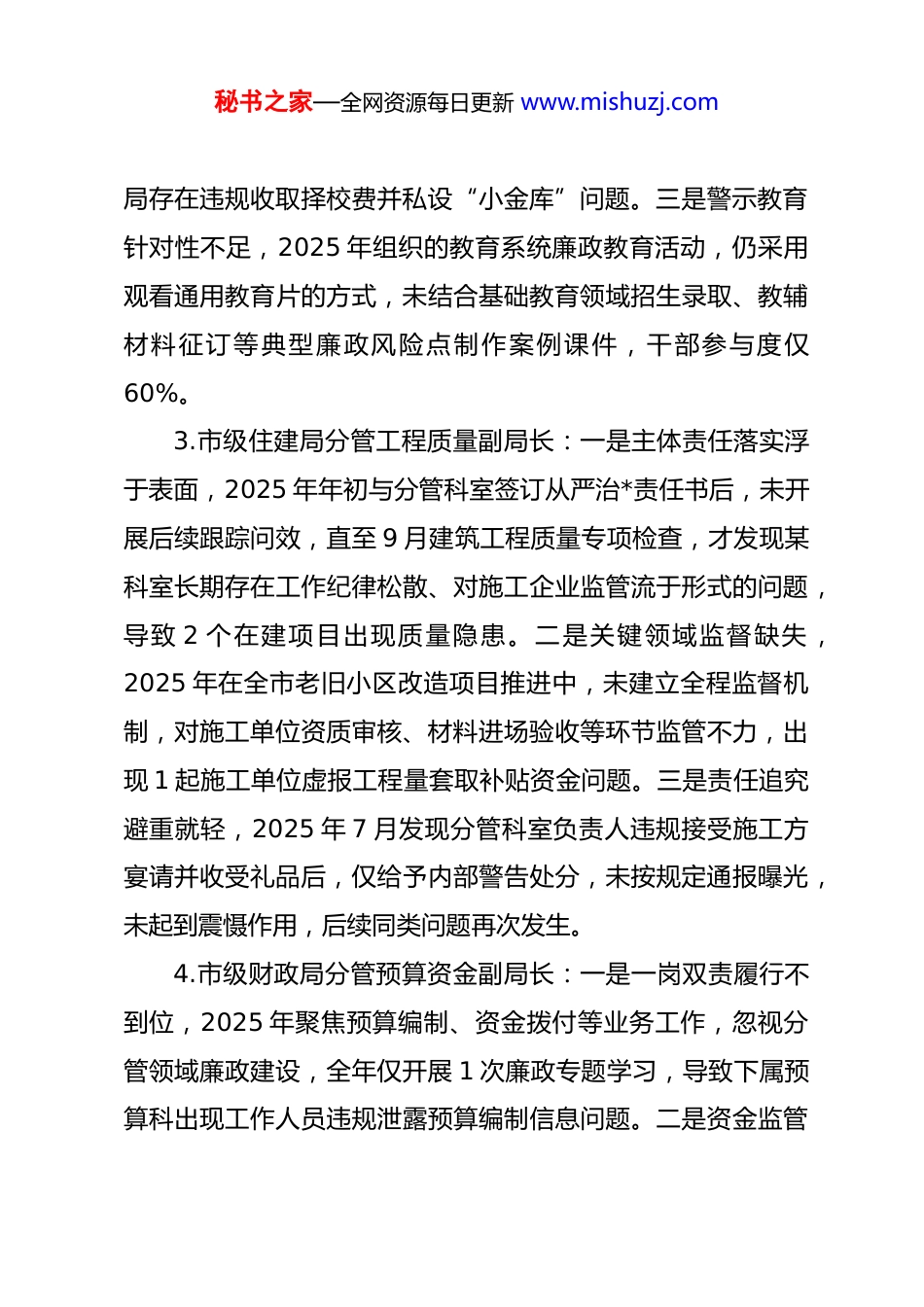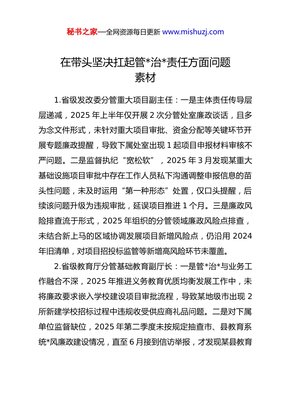 秘书之家—全网资源每日更新 www.mishuzj.com在带头坚决扛起管*治*责任方面问题素材1.省级发改委分管重大项目副主任:一是主体责任传导层层递减,2025 年上半年仅开展 2 次分管处室廉政谈话,且多为念文件形式,未针对重大项目审批、资金分配等关键环节开展专题廉政提醒,导致下属处室出现 1 起项目申报材料审核不严问题。二是监督执纪“宽松软”,2025 年 3 月发现某重大基础设施项目审批中存在工作人员私下沟通调整申报信息的苗头性问题,未及时运用“第一种形态”处置,仅口头提醒,后续该问题升级为违规审批,延误项目推进 1 个月。三是廉政风险排查流于形式,2025 年组织的分管领域廉政风险点排查,未结合新上马的区域协调发展项目新增风险点,仍沿用 2024年旧清单,对项目招投标监管等新增高风险环节未覆盖。2.省级教育厅分管基础教育副厅长:一是管*治*与业务工作融合不深,2025 年推进义务教育优质均衡发展工作中,未将廉政要求嵌入学校建设项目审批流程,导致某地级市出现 2所新建学校招标过程中违规收受供应商礼品问题。二是对下属单位监督缺位,2025 年第二季度未按规定抽查市、县教育系统*风廉政建设情况,直至 6 月接到信访举报,才发现某县教育秘书之家—全网资源每日更新 www.mishuzj.com局存在违规收取择校费并私设“小金库”问题。三是警示教育针对性不足,2025 年组织的教育系统廉政教育活动,仍采用观看通用教育片的方式,未结合基础教育领域招生录取、教辅材料征订等典型廉政风险点制作案例课件,干部参与度仅60%。3.市级住建局分管工程质量副局长:一是主体责任落实浮于表面,2025 年年初与分管科室签订从严治*责任书后,未开展后续跟踪问效,直至 9 月建筑工程质量专项检查,才发现某科室长期存在工作纪律松散、对施工企业监管流于形式的问题,导致 2 个在建项目出现质量隐患。二是关键领域监督缺失,2025 年在全市老旧小区改造项目推进中,未建立全程监督机制,对施工单位资质审核、材料进场验收等环节监管不力,出现 1 起施工单位虚报工程量套取补贴资金问题。三是责任追究避重就轻,2025 年 7 月发现分管科室负责人违规接受施工方宴请并收受礼品后,仅给予内部警告处分,未按规定通报曝光,未起到震慑作用,后续同类问题再次发生。4.市级财政局分管预算资金副局长:一是一岗双责履行不到位,2025 年聚焦预算编制、资金拨付等业务工作,忽视分管领域廉政建设,全年仅开展 1 次廉政专题学习,导致下属预算科出现工作人员违规泄露预算编制信息问题。二是资金监管秘书之家—全网资源每日更新 www.mishuzj.com存在漏洞,2025 年在直达资金拨付监管中,未建立动态跟踪机制,对某区挪用 200 万元直达资金用于非民生领域的问题发现不及时,直至年底审计才暴露。三是廉政风险防控不精准,2025 年组织的分管领域廉政风险排查,仅依赖科室自查,未深入分析预算审核、资金分配等关键环节的隐性风险,排查结果与实际风险脱节。5.区级人民政府分管文旅副区长:一是管*治*责任压得不实,2025 年在推进辖区文旅项目建设中,未将廉政建设同步部署,对项目征地拆迁、招商运营等环节的廉政风险重视不足,导致某文旅小镇项目出现村干部违规收受开发商好处费问题。二是日常监督提醒不及时,2025 年发现区文旅局工作人员存在工作日午间饮酒、服务群众态度差等问题,未及时约谈纠正,直至群众多次投诉后才开展整改,影响政府形象。三是警示教育效果不佳,2025 年组织的文旅系统廉政教育活动,未结合本领域景区管理、文物修缮等典型案例,仅传达上级文件,干部对廉政风险认知不深刻。6.省级卫健委分管医疗监管副主任:一是主体责任传导不力,2025 年未定期听取分管处室*风廉政建设工作汇报,对医疗机构监管中的廉政风险研判不足,导致某三甲医院出现药品耗材采购违规收受回扣问题。二是监督执纪不严格,2025 年 4秘书之家—全网资源每日更新 www.mishuzj.com月接到群众反映某医院医生过度诊疗的举报,未牵头组织专项核查,仅转由医院自行调查,调查结果流于形式,未追究相关管理责任。三是行业作风整治流于形式,2025 年部署的医...