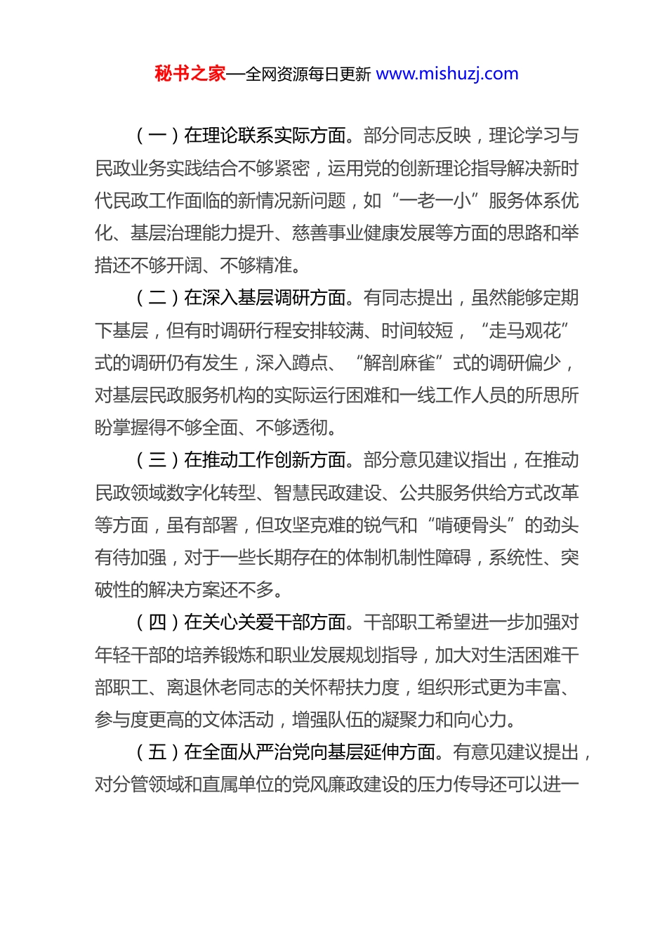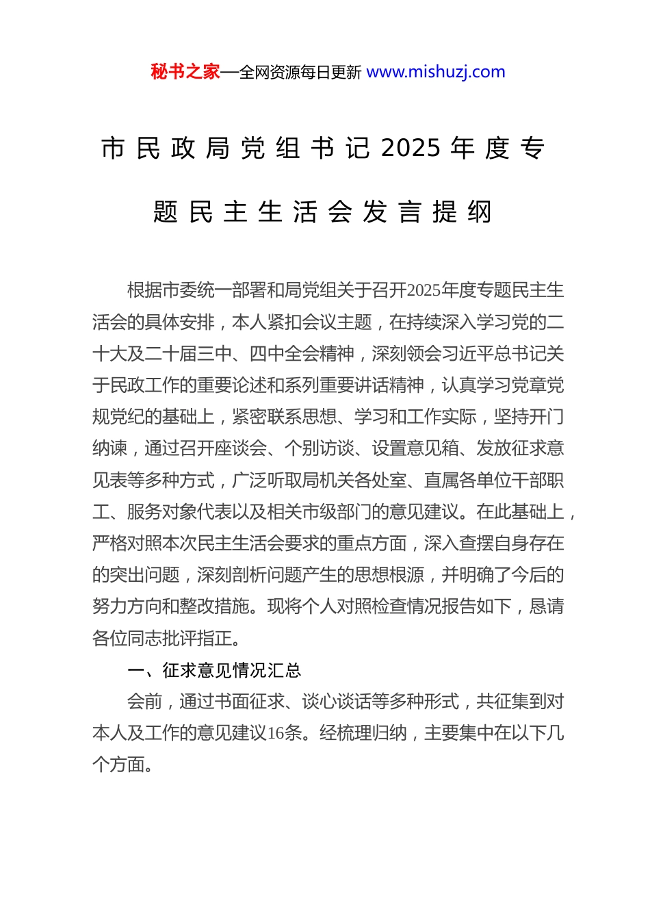秘书之家—全网资源每日更新 www.mishuzj.com市 民 政 局 党 组 书 记 2025 年 度 专题 民 主 生 活 会 发 言 提 纲根据市委统一部署和局党组关于召开2025年度专题民主生活会的具体安排,本人紧扣会议主题,在持续深入学习党的二十大及二十届三中、四中全会精神,深刻领会习近平总书记关于民政工作的重要论述和系列重要讲话精神,认真学习党章党规党纪的基础上,紧密联系思想、学习和工作实际,坚持开门纳谏,通过召开座谈会、个别访谈、设置意见箱、发放征求意见表等多种方式,广泛听取局机关各处室、直属各单位干部职工、服务对象代表以及相关市级部门的意见建议。在此基础上,严格对照本次民主生活会要求的重点方面,深入查摆自身存在的突出问题,深刻剖析问题产生的思想根源,并明确了今后的努力方向和整改措施。现将个人对照检查情况报告如下,恳请各位同志批评指正。一、征求意见情况汇总会前,通过书面征求、谈心谈话等多种形式,共征集到对本人及工作的意见建议16条。经梳理归纳,主要集中在以下几个方面。秘书之家—全网资源每日更新 www.mishuzj.com(一)在理论联系实际方面。部分同志反映,理论学习与民政业务实践结合不够紧密,运用党的创新理论指导解决新时代民政工作面临的新情况新问题,如“一老一小”服务体系优化、基层治理能力提升、慈善事业健康发展等方面的思路和举措还不够开阔、不够精准。(二)在深入基层调研方面。有同志提出,虽然能够定期下基层,但有时调研行程安排较满、时间较短,“走马观花”式的调研仍有发生,深入蹲点、“解剖麻雀”式的调研偏少,对基层民政服务机构的实际运行困难和一线工作人员的所思所盼掌握得不够全面、不够透彻。(三)在推动工作创新方面。部分意见建议指出,在推动民政领域数字化转型、智慧民政建设、公共服务供给方式改革等方面,虽有部署,但攻坚克难的锐气和“啃硬骨头”的劲头有待加强,对于一些长期存在的体制机制性障碍,系统性、突破性的解决方案还不多。(四)在关心关爱干部方面。干部职工希望进一步加强对年轻干部的培养锻炼和职业发展规划指导,加大对生活困难干部职工、离退休老同志的关怀帮扶力度,组织形式更为丰富、参与度更高的文体活动,增强队伍的凝聚力和向心力。(五)在全面从严治党向基层延伸方面。有意见建议提出,对分管领域和直属单位的党风廉政建设的压力传导还可以进一秘书之家—全网资源每日更新 www.mishuzj.com步强化,廉政风险点排查防控的精准性和日常监督的经常性有待提升,廉洁文化建设的氛围营造和载体创新需要加强。对于这些宝贵的意见建议,本人照单全收、诚恳接受,并将其作为查摆问题、撰写提纲的重要依据。二、2024年度民主生活会查摆问题整改落实情况上年度民主生活会,本人共查摆出5 个方面11个具体问题。一年来,本人始终坚持问题导向,制定了详细的整改方案和清单,逐项明确整改措施、责任时限,截至目前,所有问题均已按计划完成整改或取得阶段性明显成效。(一)在深化理论武装、把稳政治方向方面。坚持把学习习近平新时代中国特色社会主义思想作为首要政治任务,持续跟进学习习近平总书记最新重要讲话和指示批示精神,特别是关于民生保障、社会治理等方面的重要论述。通过党组理论学习中心组学习、专题研讨、个人自学等多种形式,努力在学懂弄通做实上下功夫,自觉做“两个确立”的忠诚拥护者、“两个维护”的坚定践行者。理论指导实践的能力得到增强,谋划推动工作的政治站位进一步提高。(二)在践行初心使命、增进民生福祉方面。牢固树立以人民为中心的发展思想,将更多精力投入到解决群众急难愁盼问题上。牵头推动建立了XX 项民生实事落实机制,加大对困难群体救助保障力度,养老服务体系建设、儿童福利保障、残秘书之家—全网资源每日更新 www.mishuzj.com疾人补贴发放等工作取得新进展。带头落实领导干部接访下访制度,推动化解了一批信访积案和民生领域矛盾。(三)在强化担当作为、破解发展难题方面。聚焦民政事业高质量发展目标,主动领题破题。在推动基层社会治理创新、引导社会组织健康有序发展、规范行政区划管理等方面,加强研...