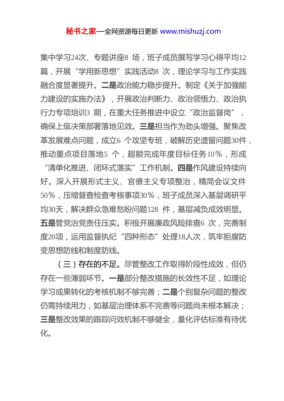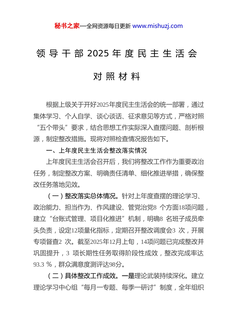 秘书之家—全网资源每日更新 www.mishuzj.com领 导 干 部 2025 年 度 民 主 生 活 会对 照 材 料根据上级关于开好2025年度民主生活会的统一部署,通过集体学习、个人自学、谈心谈话、征求意见等方式,严格对照“五个带头”要求,结合思想工作实际深入查摆问题、剖析根源,制定整改措施。现将对照检查情况报告如下。一、上年度民主生活会整改落实情况上年度民主生活会召开后,我们将整改工作作为重要政治任务,制定整改方案、明确责任清单、细化推进举措,确保整改任务落地见效。(一)整改落实总体情况。针对上年度查摆的理论学习、政治能力、担当作为、作风建设、管党治党8 个方面18项问题,建立“台账式管理、项目化推进”机制,明确8 名班子成员牵头负责,设定12项量化指标,定期召开整改调度会3 次,开展专项督查2 次。截至2025年12月上旬,14项问题已完成整改并巩固提升,3 项长期性任务取得阶段性成效,整改完成率达93.3 %,群众满意度测评达98分。(二)具体整改工作成效。一是理论武装持续深化。建立理论学习中心组“每月一专题、每季一研讨”制度,全年组织秘书之家—全网资源每日更新 www.mishuzj.com集中学习24次、专题讲座8 场,班子成员撰写学习心得平均12篇,开展“学用新思想”实践活动8 次,理论学习与工作实践融合度显著提升。二是政治能力稳步提升。制定《关于加强能力建设的实施办法》,开展政治判断力、政治领悟力、政治执行力专项培训3 期,在重大任务推进中设立“政治监督岗”,确保上级决策部署落地见效。三是担当作为劲头增强。聚焦改革发展难点问题,成立6 个攻坚专班,破解历史遗留问题30件,推动重点项目落地5 个,超额完成年度目标任务10%,形成“清单化推进、闭环式落实”工作机制。四是作风建设持续向好。深入开展形式主义、官僚主义专项整治,精简会议文件50%,压缩督查检查考核事项30%,班子成员深入基层调研平均30天,解决群众急难愁盼问题128 件,基层减负成效明显。五是管党治党责任压实。积极开展廉政风险排查6 次,完善制度20项,运用监督执纪“四种形态”处理18人次,筑牢拒腐防变思想防线和制度防线。(三)存在的不足。尽管整改工作取得阶段性成效,但仍存在一些薄弱环节。一是部分整改措施的长效性不足,如理论学习成果转化的考核机制不够完善;二是个别复杂问题的整改仍需持续用力,如基层治理体系不完善等问题尚未根本解决;三是整改效果的跟踪问效机制不够健全,量化评估标准有待优化。秘书之家—全网资源每日更新 www.mishuzj.com二、对照“五个带头”方面存在的主要问题(一)带头强化政治忠诚、提高政治能力方面。一是理论学习的系统性深度不足。虽然能够坚持集体学习制度,但存在“实用主义”倾向,对习近平新时代中国特色社会主义思想的系统性学习不够,尤其是对蕴含其中的世界观、方法论和贯穿其中的立场观点方法领悟不深。部分班子成员满足于完成“规定动作”,个人自学的主动性、计划性不强,存在“以干代学”现象,全年个人自学时间平均不足60小时。在学习全会精神时,对“推进国家治理体系和治理能力现代化”等重大部署的理解停留在表面,结合本单位实际深入研讨不够,导致学习成果转化不充分。二是“政治三力”锤炼不够扎实。对新形势下复杂问题的政治本质洞察不够敏锐,在分析经济社会发展中的风险挑战时,有时未能从政治高度审视把握。如在应对网络舆情时,对一些苗头性、倾向性问题甄别不及时,缺乏前瞻性防范意识。对上级决策部署的精神实质和实践要求理解不够透彻,在制定具体落实措施时,有时存在照搬照抄、结合实际不够紧密的问题。在推动一些长期性、基础性工作时,存在前紧后松、韧劲不足的情况,如在落实新发展理念、推动高质量发展中,部分改革举措推进缓慢,未能达到预期效果。三是贯彻落实党中央决策部署不够有力。在执行上级决策部署时,有时存在“温差”“落差”现象,对一些重大政策的落实缺乏钉钉子精神。如在推进乡村振兴、生态环境保护等工作中,虽然制秘书之家—全网资源每日更新 www.mishuzj.com定了实施方案,但在具体推进过程中,因协调力度不够、措施不够精准...