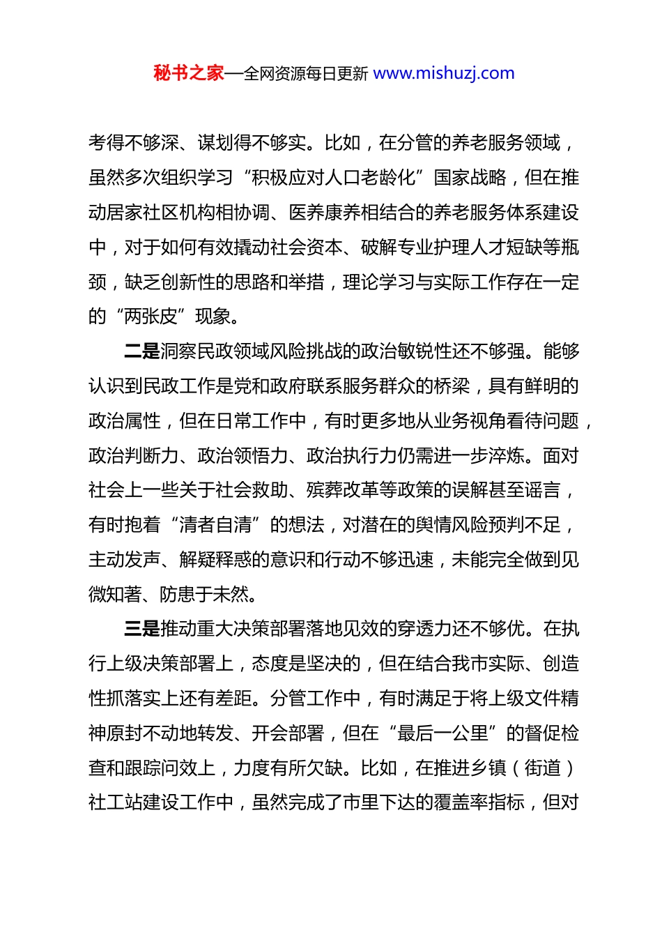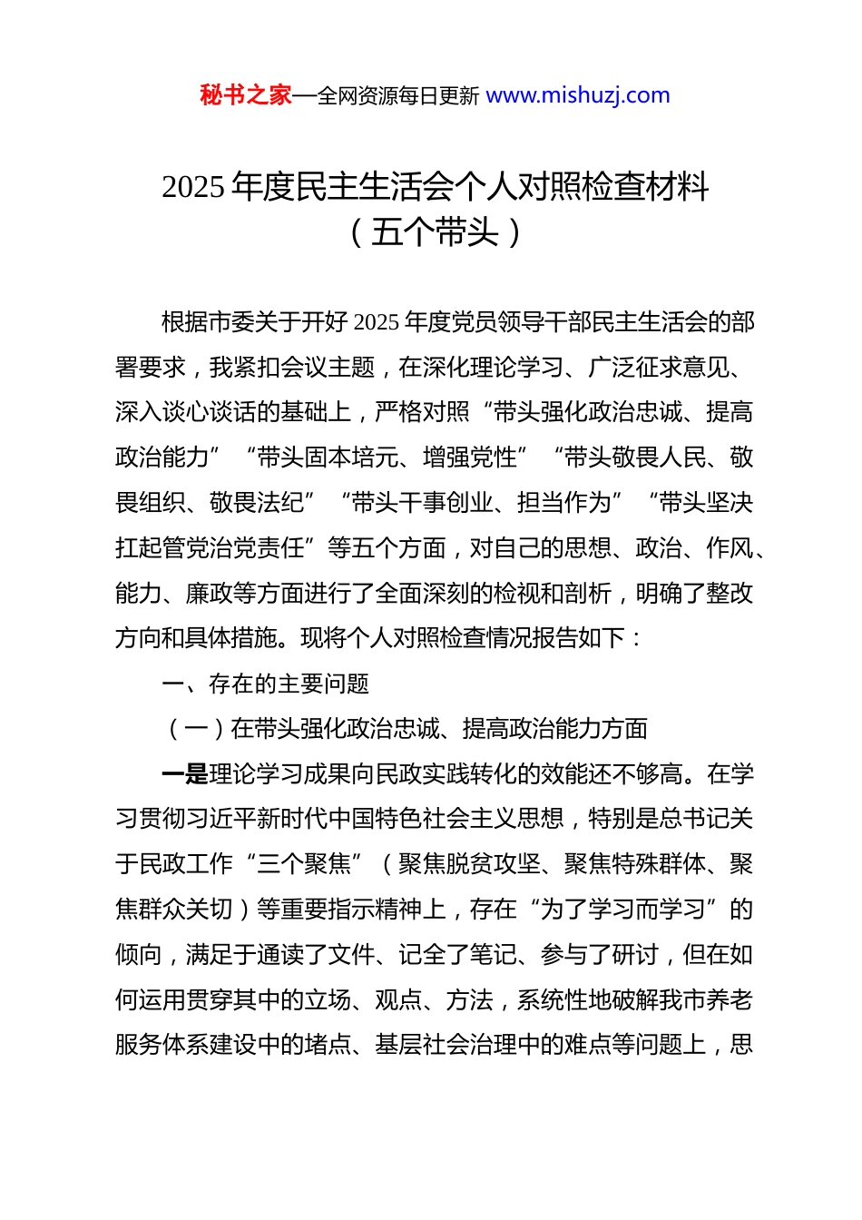秘书之家—全网资源每日更新 www.mishuzj.com2025 年度民主生活会个人对照检查材料(五个带头)根据市委关于开好 2025 年度党员领导干部民主生活会的部署要求,我紧扣会议主题,在深化理论学习、广泛征求意见、深入谈心谈话的基础上,严格对照“带头强化政治忠诚、提高政治能力”“带头固本培元、增强党性”“带头敬畏人民、敬畏组织、敬畏法纪”“带头干事创业、担当作为”“带头坚决扛起管党治党责任”等五个方面,对自己的思想、政治、作风、能力、廉政等方面进行了全面深刻的检视和剖析,明确了整改方向和具体措施。现将个人对照检查情况报告如下:一、存在的主要问题(一)在带头强化政治忠诚、提高政治能力方面一是理论学习成果向民政实践转化的效能还不够高。在学习贯彻习近平新时代中国特色社会主义思想,特别是总书记关于民政工作“三个聚焦”(聚焦脱贫攻坚、聚焦特殊群体、聚焦群众关切)等重要指示精神上,存在“为了学习而学习”的倾向,满足于通读了文件、记全了笔记、参与了研讨,但在如何运用贯穿其中的立场、观点、方法,系统性地破解我市养老服务体系建设中的堵点、基层社会治理中的难点等问题上,思秘书之家—全网资源每日更新 www.mishuzj.com考得不够深、谋划得不够实。比如,在分管的养老服务领域,虽然多次组织学习“积极应对人口老龄化”国家战略,但在推动居家社区机构相协调、医养康养相结合的养老服务体系建设中,对于如何有效撬动社会资本、破解专业护理人才短缺等瓶颈,缺乏创新性的思路和举措,理论学习与实际工作存在一定的“两张皮”现象。二是洞察民政领域风险挑战的政治敏锐性还不够强。能够认识到民政工作是党和政府联系服务群众的桥梁,具有鲜明的政治属性,但在日常工作中,有时更多地从业务视角看待问题,政治判断力、政治领悟力、政治执行力仍需进一步淬炼。面对社会上一些关于社会救助、殡葬改革等政策的误解甚至谣言,有时抱着“清者自清”的想法,对潜在的舆情风险预判不足,主动发声、解疑释惑的意识和行动不够迅速,未能完全做到见微知著、防患于未然。三是推动重大决策部署落地见效的穿透力还不够优。在执行上级决策部署上,态度是坚决的,但在结合我市实际、创造性抓落实上还有差距。分管工作中,有时满足于将上级文件精神原封不动地转发、开会部署,但在“最后一公里”的督促检查和跟踪问效上,力度有所欠缺。比如,在推进乡镇(街道)社工站建设工作中,虽然完成了市里下达的覆盖率指标,但对秘书之家—全网资源每日更新 www.mishuzj.com部分社工站“有牌子、少服务”“专业能力不强”等问题,调研不够深入,指导不够有力,导致政策的“含金量”在基层打了折扣。(二)在带头固本培元、增强党性方面一是党内政治生活的“党味”有时不够浓厚。在参加党组会、支部组织生活会时,开展自我批评有时还不够“彻底”,习惯于谈工作不足代替思想剖析,谈客观原因多于主观因素。在批评同志时,存在“好人主义”思想,怕触及矛盾、怕伤害和气,多以工作建议代替批评意见,缺乏“知无不言、言无不尽”的坦诚和“猛击一掌、大喝一声”的警醒,导致党内政治生活的政治性、战斗性有所弱化。二是对照先进典型净化思想的自觉性还不够主动。民政系统涌现出了许多像“孺子牛”王伯超、“活雷锋”周汝珍这样的先进典型,但在学习上,往往是号召分管领域的同志们学得多,自己静下心来对标反思、深挖思想根源的时候少。面对繁重琐碎的民政工作,特别是处理一些棘手的信访矛盾时,偶尔会产生懈怠、畏难的情绪,艰苦奋斗、无私奉献的革命精神有所消减,未能时时以先进典型为镜,荡涤思想尘埃,补足精神之钙。三是发挥先锋模"范作用的标杆树得还不够高。作为局党组秘书之家—全网资源每日更新 www.mishuzj.com成员、副局长,有时在思想和行动上不自觉地把自己等同于普通党员,冲锋在前、以上率下的示范作用发挥不充分。在一些急难险重的任务面前,比如去年汛期的困难群众紧急转移安置工作中,虽然也到一线进行了指挥部署,但亲力亲为和基层干部一起通宵达旦、逐户排查做得还不够,更多的是听取汇报、作出指示,未能以“跟我上”的实际行动,给分管...
