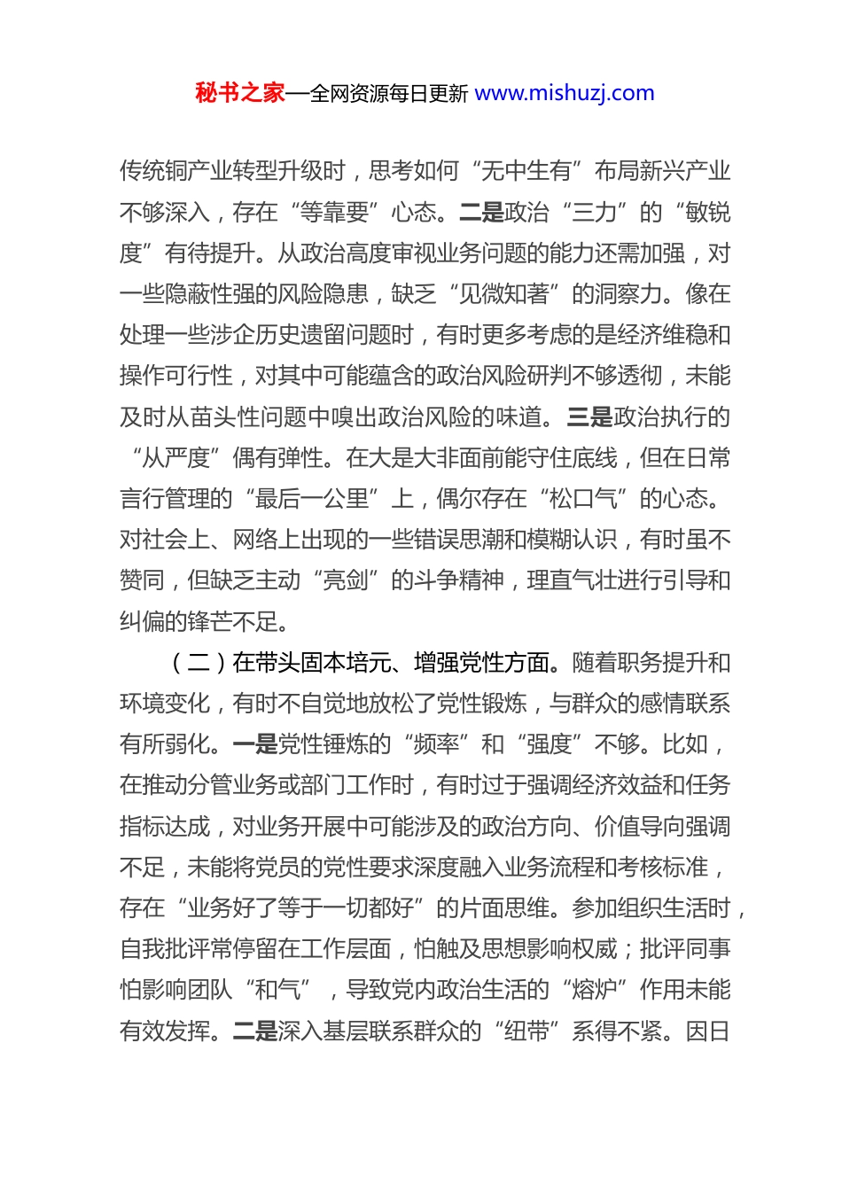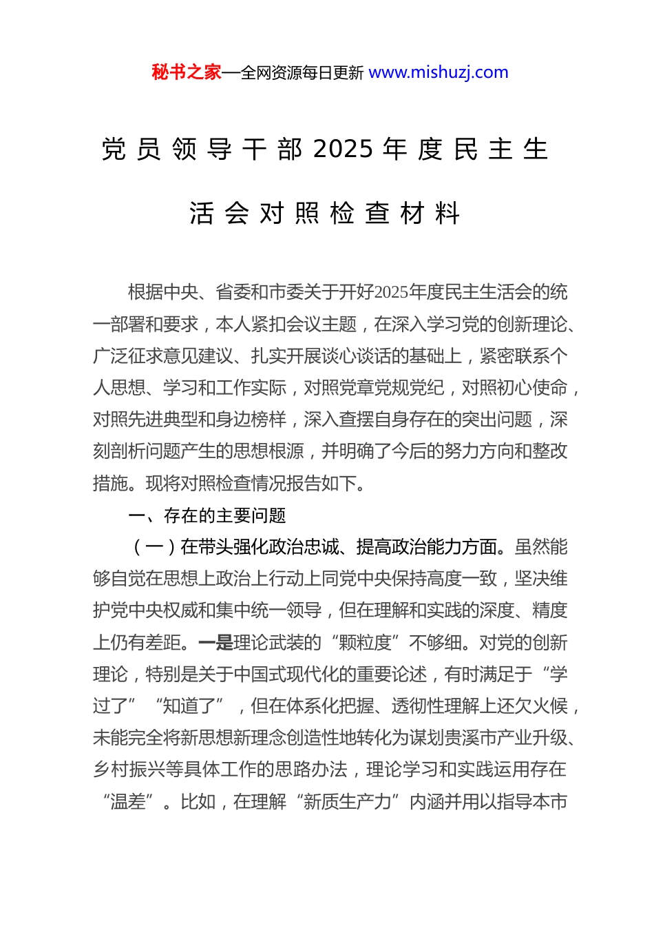 秘书之家—全网资源每日更新 www.mishuzj.com党 员 领 导 干 部 2025 年 度 民 主 生活 会 对 照 检 查 材 料根据中央、省委和市委关于开好2025年度民主生活会的统一部署和要求,本人紧扣会议主题,在深入学习党的创新理论、广泛征求意见建议、扎实开展谈心谈话的基础上,紧密联系个人思想、学习和工作实际,对照党章党规党纪,对照初心使命,对照先进典型和身边榜样,深入查摆自身存在的突出问题,深刻剖析问题产生的思想根源,并明确了今后的努力方向和整改措施。现将对照检查情况报告如下。一、存在的主要问题(一)在带头强化政治忠诚、提高政治能力方面。虽然能够自觉在思想上政治上行动上同党中央保持高度一致,坚决维护党中央权威和集中统一领导,但在理解和实践的深度、精度上仍有差距。一是理论武装的“颗粒度”不够细。对党的创新理论,特别是关于中国式现代化的重要论述,有时满足于“学过了”“知道了”,但在体系化把握、透彻性理解上还欠火候,未能完全将新思想新理念创造性地转化为谋划贵溪市产业升级、乡村振兴等具体工作的思路办法,理论学习和实践运用存在“温差”。比如,在理解“新质生产力”内涵并用以指导本市秘书之家—全网资源每日更新 www.mishuzj.com传统铜产业转型升级时,思考如何“无中生有”布局新兴产业不够深入,存在“等靠要”心态。二是政治“三力”的“敏锐度”有待提升。从政治高度审视业务问题的能力还需加强,对一些隐蔽性强的风险隐患,缺乏“见微知著”的洞察力。像在处理一些涉企历史遗留问题时,有时更多考虑的是经济维稳和操作可行性,对其中可能蕴含的政治风险研判不够透彻,未能及时从苗头性问题中嗅出政治风险的味道。三是政治执行的“从严度”偶有弹性。在大是大非面前能守住底线,但在日常言行管理的“最后一公里”上,偶尔存在“松口气”的心态。对社会上、网络上出现的一些错误思潮和模糊认识,有时虽不赞同,但缺乏主动“亮剑”的斗争精神,理直气壮进行引导和纠偏的锋芒不足。(二)在带头固本培元、增强党性方面。随着职务提升和环境变化,有时不自觉地放松了党性锻炼,与群众的感情联系有所弱化。一是党性锤炼的“频率”和“强度”不够。比如,在推动分管业务或部门工作时,有时过于强调经济效益和任务指标达成,对业务开展中可能涉及的政治方向、价值导向强调不足,未能将党员的党性要求深度融入业务流程和考核标准,存在“业务好了等于一切都好”的片面思维。参加组织生活时,自我批评常停留在工作层面,怕触及思想影响权威;批评同事怕影响团队“和气”,导致党内政治生活的“熔炉”作用未能有效发挥。二是深入基层联系群众的“纽带”系得不紧。因日秘书之家—全网资源每日更新 www.mishuzj.com常事务缠身,坐在办公室“键对键”多,走进田间地头、工厂车间“面对面”少。对群众反映的一些“老大难”问题,如个别老旧小区改造滞后、部分乡村饮水安全保障水平不高等,虽然也推动解决,但有时协调的力度和效率不够高,存在“中梗阻”现象,对群众急难愁盼的感知不够真,情感连接的“温度”有所下降。三是艰苦奋斗的“传家宝”有所遗忘。在商务接待、公务活动中,虽然能遵守规定,但追求“体面”、“档次”的想法偶有浮现,勤俭办一切事业的思想有所淡化。对比一些先进典型,如老英雄张富清、扶贫干部黄文秀等“牢记使命、为党奉献、不计私利”的精神境界,自身在保持艰苦朴素、克己奉公方面存在差距。(三)在带头敬畏人民、敬畏组织、敬畏法纪方面。能够认识到权力来自人民、属于组织,受法纪约束,但在具体实践中,敬畏之心仍需强化。一是敬畏人民方面,服务供给的“精度”有偏差。在民生实事项目的安排上,有时存在“我想给”代替“群众想要”的现象。比如,在谋划年度民生工程时,虽然投入不小,但有时未能完全精准对接群众在教育、医疗、养老等方面的个性化、多样化需求,导致部分项目群众获得感不强,“政府端菜”与“群众点菜”结合不够好。二是敬畏组织方面,执行组织决定的“刚性”有待加强。有时对组织的纪律规矩和决策部署,理解不深不透就机械执行,或者存在“路径依赖”,创造性落实不...