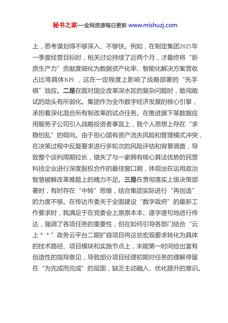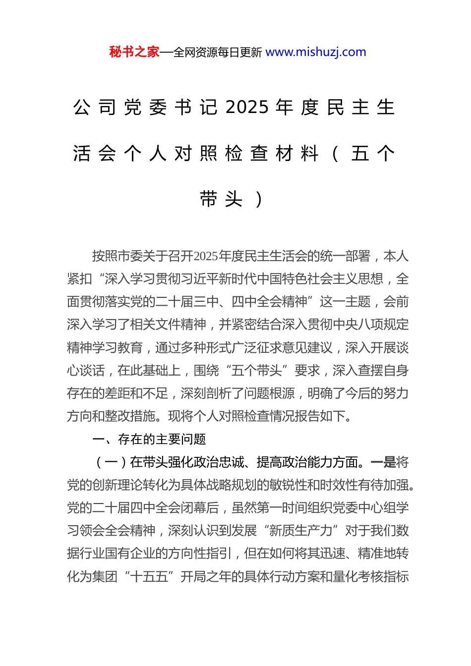 秘书之家—全网资源每日更新 www.mishuzj.com公 司 党 委 书 记 2025 年 度 民 主 生活 会 个 人 对 照 检 查 材 料 ( 五 个带 头 )按照市委关于召开2025年度民主生活会的统一部署,本人紧扣“深入学习贯彻习近平新时代中国特色社会主义思想,全面贯彻落实党的二十届三中、四中全会精神”这一主题,会前深入学习了相关文件精神,并紧密结合深入贯彻中央八项规定精神学习教育,通过多种形式广泛征求意见建议,深入开展谈心谈话,在此基础上,围绕“五个带头”要求,深入查摆自身存在的差距和不足,深刻剖析了问题根源,明确了今后的努力方向和整改措施。现将个人对照检查情况报告如下。一、存在的主要问题(一)在带头强化政治忠诚、提高政治能力方面。一是将党的创新理论转化为具体战略规划的敏锐性和时效性有待加强。党的二十届四中全会闭幕后,虽然第一时间组织党委中心组学习领会全会精神,深刻认识到发展“新质生产力”对于我们数据行业国有企业的方向性指引,但在如何将其迅速、精准地转化为集团“十五五”开局之年的具体行动方案和量化考核指标秘书之家—全网资源每日更新 www.mishuzj.com上,思考谋划得不够深入、不够快。例如,在制定集团2025年一季度经营目标时,相关讨论持续了近两个月,才最终将“新质生产力”贡献度细化为数据资产化率、智能化解决方案营收占比等具体KPI ,这在一定程度上影响了战略部署的“先手棋”效应。二是在面对国企改革深水区的复杂问题时,敢闯敢试的劲头有所弱化。集团作为全市数字经济发展的核心引擎,承担着深化混合所有制改革的试点任务。在推进旗下某数据应用服务子公司引入战略投资者事宜上,我个人思想上存在“求稳怕乱”的倾向。由于担心国有资产流失风险和管理模式冲突,在决策过程中反复要求进行多轮次的风险评估和背景调查,导致整个谈判周期拉长,错失了与一家拥有核心算法优势的民营科技企业进行深度股权合作的最佳窗口期,体现出在运用政治智慧破解改革难题上的魄力不足。三是在贯彻落实上级决策部署时,有时存在“中转”思维,结合集团实际进行“再创造”的力度不够。在传达市委关于全面建设“数字政府”的最新工作要求时,我满足于在党委会上原原本本、逐字逐句地进行传达,强调了各项任务的重要性,但在如何引导各部门结合“云上**”政务云平台二期扩容项目将这些宏观要求转化为具体的技术路径、项目模块和实施节点上,未能第一时间给出富有创造性的指导意见,导致部分项目经理初期对任务的理解停留在“为完成而完成”的层面,缺乏主动融入、优化提升的意识。秘书之家—全网资源每日更新 www.mishuzj.com(二)在带头固本培元、增强党性方面。一是理论学习与解决实际问题的结合不够紧密,存在“两张皮”现象。尽管能够坚持参加党委理论学习中心组的各项学习活动,但有时学习思考的深度不够,未能完全做到知其然、知其所以然,更知其所以用。例如,在学习习近平总书记关于网络强国的重要论述时,虽然对核心要义和精神实质有了基本把握,但在如何运用这些思想指导解决集团当前面临的数据孤岛、数据确权等现实难题上,未能组织团队展开“解剖麻雀”式的专题研讨,导致理论学习的成果没能最大限度地转化为破解业务瓶颈的“金钥匙”。二是在日常管理工作中,有时过于依赖行政手段和业绩考核,通过思想政治工作激发干部职工内生动力的精细度不足。2025年上半年,为确保市级数据中台项目按期上线,面对繁重的开发测试任务,我主要通过倒排工期、责任到人、绩效挂钩等方式来推进工作。虽然项目最终成功交付但后来反思,在这个过程中,我较少深入项目一线,与团队成员深入交流,未能及时将项目建设的重大意义——即为全市数字化治理提供坚实底座——讲清讲透,以使命感、荣誉感激发大家的奋斗热情,这种“重任务、轻思想”的倾向,影响了团队凝聚力和战斗力的深度培育。三是党性锤炼的自觉性和持续性有待提升,艰苦奋斗精神有所弱化。随着集团业务步入正轨,经营状况持续向好,潜意识里艰苦创业的劲头有所松懈。在谋划集团新的办公大楼智慧化升级方案时,面对预算方案,虽然履行了秘书之家—全网资源...