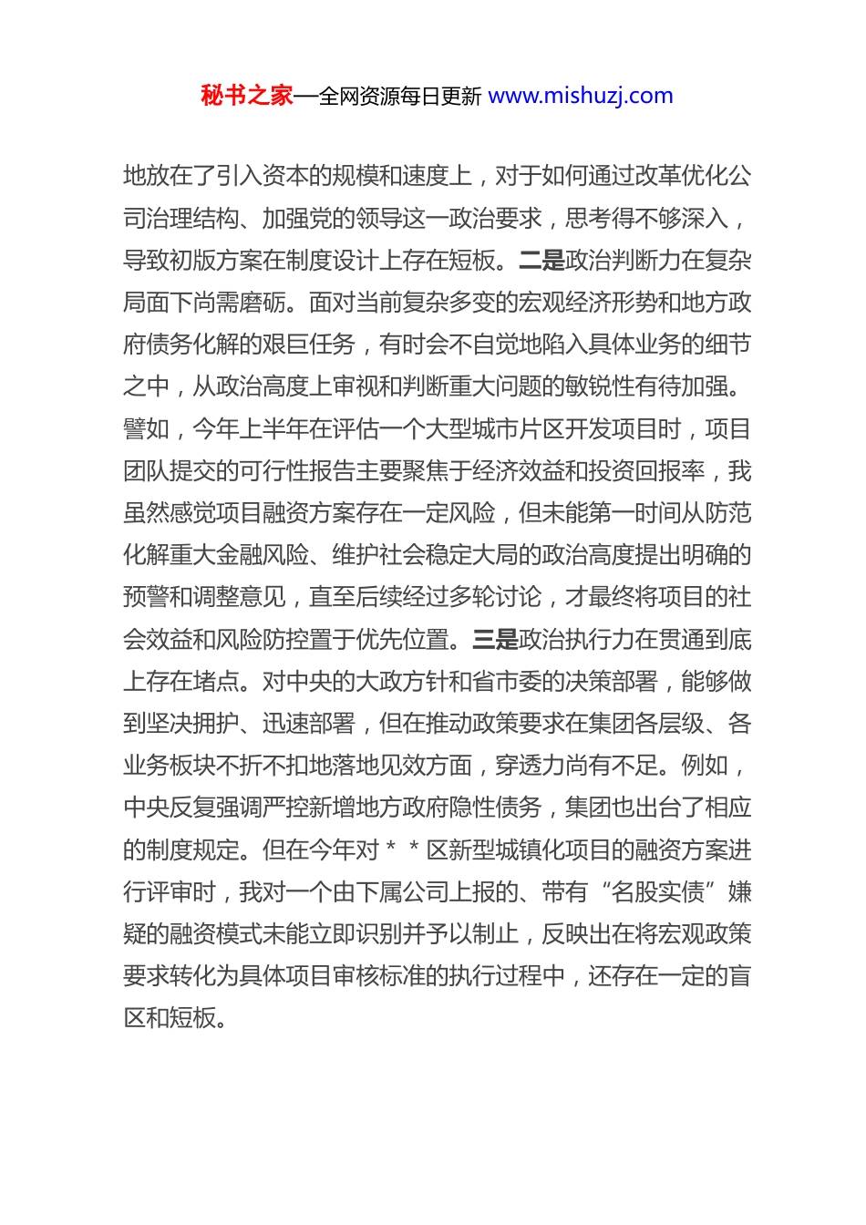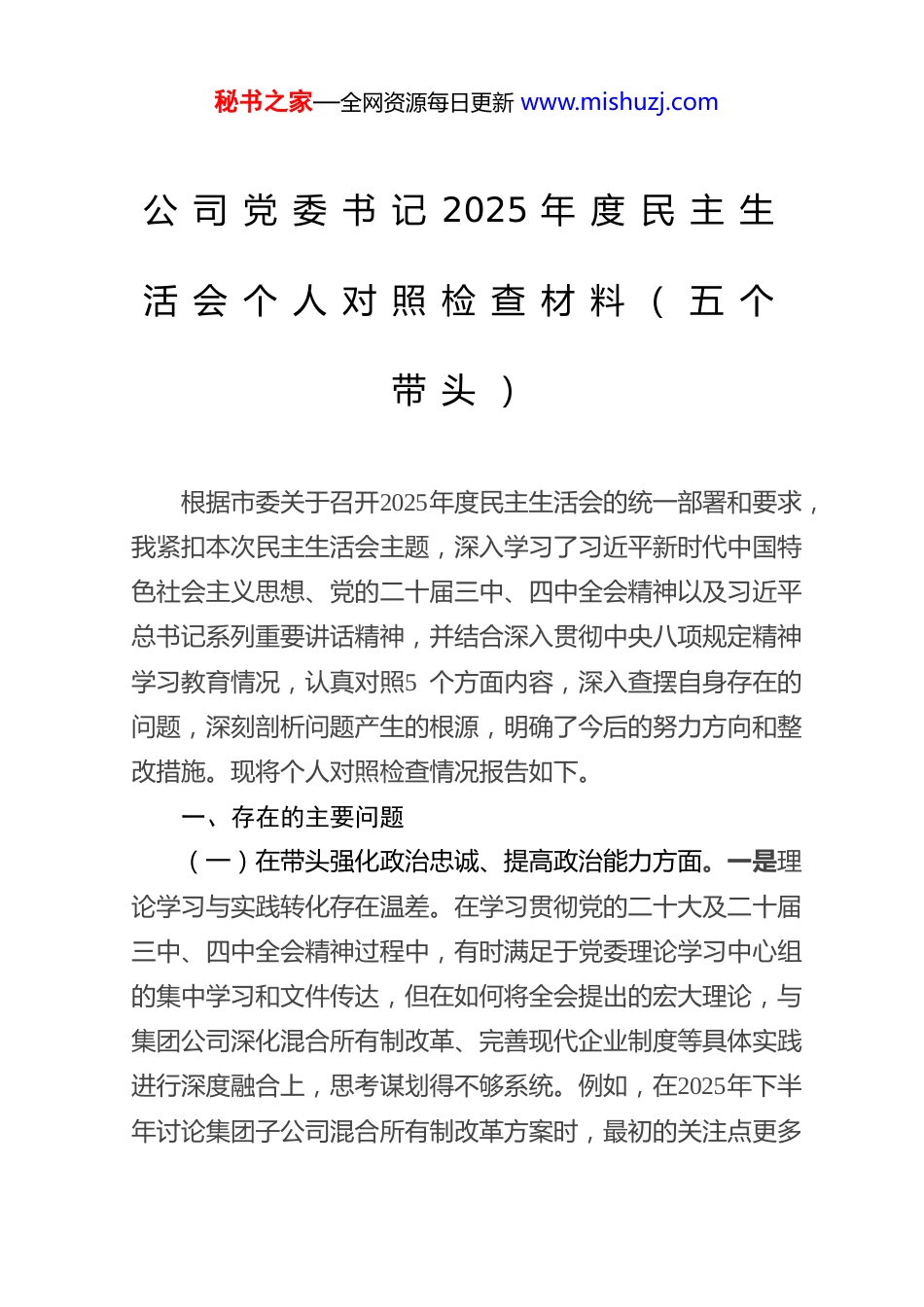 秘书之家—全网资源每日更新 www.mishuzj.com公 司 党 委 书 记 2025 年 度 民 主 生活 会 个 人 对 照 检 查 材 料 ( 五 个带 头 )根据市委关于召开2025年度民主生活会的统一部署和要求,我紧扣本次民主生活会主题,深入学习了习近平新时代中国特色社会主义思想、党的二十届三中、四中全会精神以及习近平总书记系列重要讲话精神,并结合深入贯彻中央八项规定精神学习教育情况,认真对照5 个方面内容,深入查摆自身存在的问题,深刻剖析问题产生的根源,明确了今后的努力方向和整改措施。现将个人对照检查情况报告如下。一、存在的主要问题(一)在带头强化政治忠诚、提高政治能力方面。一是理论学习与实践转化存在温差。在学习贯彻党的二十大及二十届三中、四中全会精神过程中,有时满足于党委理论学习中心组的集中学习和文件传达,但在如何将全会提出的宏大理论,与集团公司深化混合所有制改革、完善现代企业制度等具体实践进行深度融合上,思考谋划得不够系统。例如,在2025年下半年讨论集团子公司混合所有制改革方案时,最初的关注点更多秘书之家—全网资源每日更新 www.mishuzj.com地放在了引入资本的规模和速度上,对于如何通过改革优化公司治理结构、加强党的领导这一政治要求,思考得不够深入,导致初版方案在制度设计上存在短板。二是政治判断力在复杂局面下尚需磨砺。面对当前复杂多变的宏观经济形势和地方政府债务化解的艰巨任务,有时会不自觉地陷入具体业务的细节之中,从政治高度上审视和判断重大问题的敏锐性有待加强。譬如,今年上半年在评估一个大型城市片区开发项目时,项目团队提交的可行性报告主要聚焦于经济效益和投资回报率,我虽然感觉项目融资方案存在一定风险,但未能第一时间从防范化解重大金融风险、维护社会稳定大局的政治高度提出明确的预警和调整意见,直至后续经过多轮讨论,才最终将项目的社会效益和风险防控置于优先位置。三是政治执行力在贯通到底上存在堵点。对中央的大政方针和省市委的决策部署,能够做到坚决拥护、迅速部署,但在推动政策要求在集团各层级、各业务板块不折不扣地落地见效方面,穿透力尚有不足。例如,中央反复强调严控新增地方政府隐性债务,集团也出台了相应的制度规定。但在今年对**区新型城镇化项目的融资方案进行评审时,我对一个由下属公司上报的、带有“名股实债”嫌疑的融资模式未能立即识别并予以制止,反映出在将宏观政策要求转化为具体项目审核标准的执行过程中,还存在一定的盲区和短板。秘书之家—全网资源每日更新 www.mishuzj.com(二)在带头固本培元、增强党性方面。一是党性锤炼融入日常工作不够紧密。能够充分认识到加强党性修养的重要性,并积极参加各类党性教育活动。但在日常工作中,特别是在业务繁忙、任务繁重的时候,有时会不自觉地出现“重业务、轻党建”的倾向。在今年7 月1 日集团召开的全面从严治党暨警示教育大会上,我要求全体党员干部要锤炼党性,但会后为赶三季度项目进度,连续多次将原定的党支部主题党日活动时间用于召开项目调度会,无形中传递了业务工作可以冲击党建工作的信号,未能做到“两手抓、两手硬”。二是批评与自我批评的武器运用不够经常。在党内政治生活中,能够坦诚地对班子成员提出批评意见,但有时考虑到维护班子团结,批评的“辣味”还不够足,多是提出工作建议,较少触及思想根源。在自我批评方面,也存在认识不够深刻、剖析不够彻底的问题。比如,在准备本次民主生活会材料的初期,我对自身问题的查摆多是一些普遍性、浅层次的现象,对于背后深层次的思想动因挖掘不够,缺乏“向我开炮”的勇气和刀刃向内的决心。三是理想信念与岗位职责结合不够深入。作为一名受党教育多年的干部,对党的忠诚和对共产主义的信仰是坚定不移的。但在如何将这种坚定的理想信念,具体地、生动地体现在作为国有企业负责人的岗位职责上,还存在差距。在推进**片区土地资源盘活这项工作中,我多次强调要盘活存量资产、提升资产效益,但在与涉及搬迁的群众代表沟通时,谈集团发展的大道秘书之家—全网资源每日更新 www.mishuzj.com理多,对群众最关心...