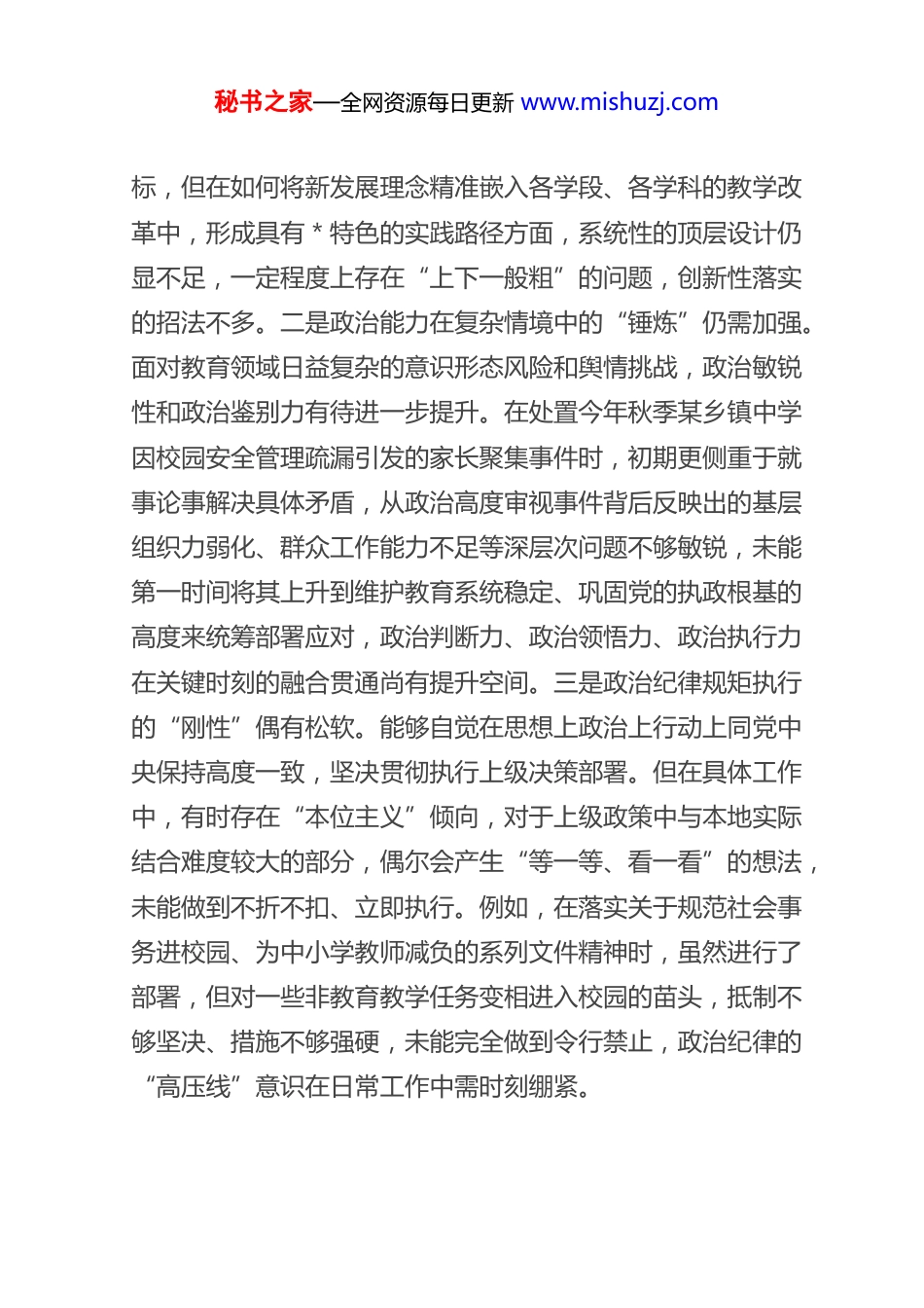 秘书之家—全网资源每日更新 www.mishuzj.com教 育 局 党 组 书 记 2025 年 度 民 主生 活 会 个 人对 照 检 查 材 料 ( 五 个 带 头 )根据本次民主生活会主题要求,本人紧扣深入学习贯彻习近平新时代中国特色社会主义思想,全面贯彻落实党的二十届三中、四中全会精神,深化中央八项规定精神学习教育这一主线,紧密结合个人思想、职责和工作实际,深入查摆问题,深刻剖析根源,明确整改方向。现将对照检查情况报告如下。一、存在的主要问题本人严格对照本次民主生活会五个方面的重点检视内容,坚持把自己摆进去、把职责摆进去、把工作摆进去,认真查摆以下问题。(一)在带头强化政治忠诚、提高政治能力方面。一是理论武装向实践转化的“深度”尚有欠缺。对党的创新理论,特别是关于教育强国建设的重要论述,能够做到及时学习,但在将其转化为推动*县教育高质量发展的具体思路和有效举措上,思考的深度、结合的紧密度还不够。例如,在谋划全县“教育质量提升三年行动”2025年度攻坚任务时,虽然提出了总体目秘书之家—全网资源每日更新 www.mishuzj.com标,但在如何将新发展理念精准嵌入各学段、各学科的教学改革中,形成具有*特色的实践路径方面,系统性的顶层设计仍显不足,一定程度上存在“上下一般粗”的问题,创新性落实的招法不多。二是政治能力在复杂情境中的“锤炼”仍需加强。面对教育领域日益复杂的意识形态风险和舆情挑战,政治敏锐性和政治鉴别力有待进一步提升。在处置今年秋季某乡镇中学因校园安全管理疏漏引发的家长聚集事件时,初期更侧重于就事论事解决具体矛盾,从政治高度审视事件背后反映出的基层组织力弱化、群众工作能力不足等深层次问题不够敏锐,未能第一时间将其上升到维护教育系统稳定、巩固党的执政根基的高度来统筹部署应对,政治判断力、政治领悟力、政治执行力在关键时刻的融合贯通尚有提升空间。三是政治纪律规矩执行的“刚性”偶有松软。能够自觉在思想上政治上行动上同党中央保持高度一致,坚决贯彻执行上级决策部署。但在具体工作中,有时存在“本位主义”倾向,对于上级政策中与本地实际结合难度较大的部分,偶尔会产生“等一等、看一看”的想法,未能做到不折不扣、立即执行。例如,在落实关于规范社会事务进校园、为中小学教师减负的系列文件精神时,虽然进行了部署,但对一些非教育教学任务变相进入校园的苗头,抵制不够坚决、措施不够强硬,未能完全做到令行禁止,政治纪律的“高压线”意识在日常工作中需时刻绷紧。秘书之家—全网资源每日更新 www.mishuzj.com(二)在带头固本培元、增强党性方面。一是理想信念的“压舱石”作用在持久考验中偶有漂移。能够坚守共产党人精神追求,但面对教育改革深水区的复杂矛盾和繁重任务,有时会产生畏难情绪和求稳心态。在推动县域内义务教育优质均衡发展,特别是针对几所薄弱学校的改造提升工程中,当遇到资金筹措难、师资调配阻力大等困难时,攻坚克难的锐气和“功成不必在我”的境界时有衰减,内心深处“总开关”的螺丝需要持续拧紧,将坚定理想信念转化为逢山开路、遇水架桥的实际行动需要更加自觉。二是宗旨意识在具体践行中的“温度”传递不够均衡。虽然深知教育工作的根本在于“为党育人、为国育才”,但在将以人民为中心的发展思想落实到每一项教育政策、每一个管理细节上,还存在温差。例如,在调研“双减”政策及课后服务落实情况时,更多关注了城区学校的典型经验和整体数据,对于偏远乡村小学课后服务资源匮乏、教师负担显著加重等具体困境,体察不够深入,推动解决的力度和速度与群众的期盼相比仍有差距,全心全意为人民服务的根本宗旨需要在“最后一公里”上持续加热。三是党性修养在自我革命中的“纯度”提纯不足。能够用党性原则约束言行,但在批评和自我批评这个武器运用上,有时“辣味”不足。在局党组理论学习中心组围绕党的二十届四中全会精神开展交流研讨时,对自己的思想剖析多停留在理论层面,结合分管领域工作暴露出的深层次问题“刀刃向内”不够彻底;在听取班子成员秘书之家—全网资源每日更新 www.mishuzj.com意见时,对于涉及自身分管...