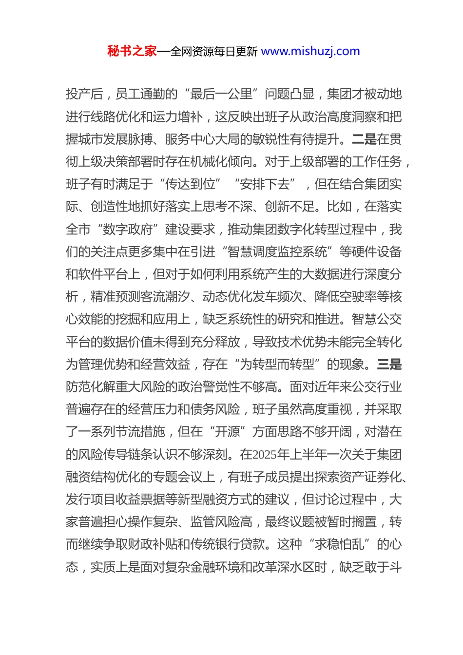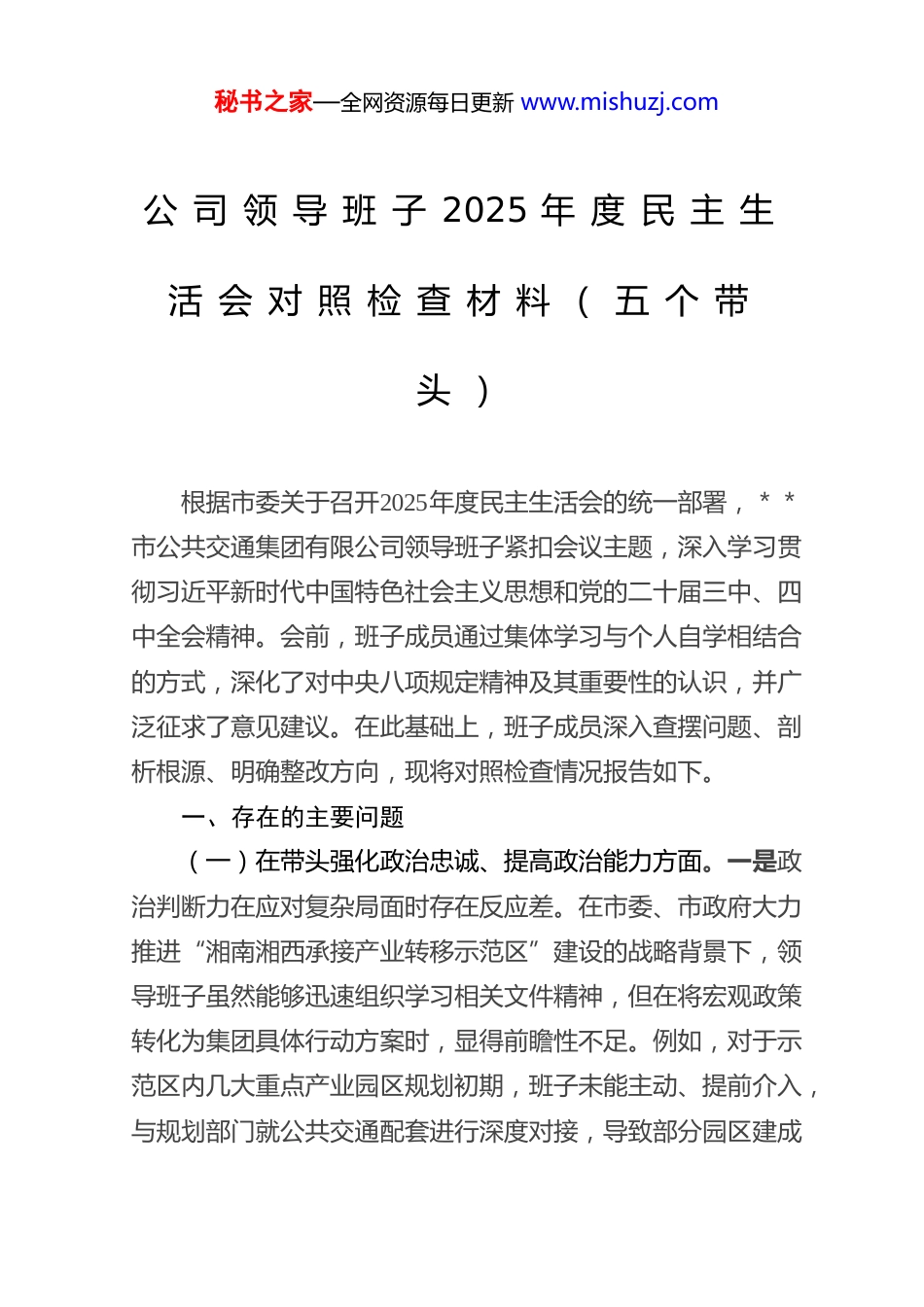秘书之家—全网资源每日更新 www.mishuzj.com公 司 领 导 班 子 2025 年 度 民 主 生活 会 对 照 检 查 材 料 ( 五 个 带头 )根据市委关于召开2025年度民主生活会的统一部署,**市公共交通集团有限公司领导班子紧扣会议主题,深入学习贯彻习近平新时代中国特色社会主义思想和党的二十届三中、四中全会精神。会前,班子成员通过集体学习与个人自学相结合的方式,深化了对中央八项规定精神及其重要性的认识,并广泛征求了意见建议。在此基础上,班子成员深入查摆问题、剖析根源、明确整改方向,现将对照检查情况报告如下。一、存在的主要问题(一)在带头强化政治忠诚、提高政治能力方面。一是政治判断力在应对复杂局面时存在反应差。在市委、市政府大力推进“湘南湘西承接产业转移示范区”建设的战略背景下,领导班子虽然能够迅速组织学习相关文件精神,但在将宏观政策转化为集团具体行动方案时,显得前瞻性不足。例如,对于示范区内几大重点产业园区规划初期,班子未能主动、提前介入,与规划部门就公共交通配套进行深度对接,导致部分园区建成秘书之家—全网资源每日更新 www.mishuzj.com投产后,员工通勤的“最后一公里”问题凸显,集团才被动地进行线路优化和运力增补,这反映出班子从政治高度洞察和把握城市发展脉搏、服务中心大局的敏锐性有待提升。二是在贯彻上级决策部署时存在机械化倾向。对于上级部署的工作任务,班子有时满足于“传达到位”“安排下去”,但在结合集团实际、创造性地抓好落实上思考不深、创新不足。比如,在落实全市“数字政府”建设要求,推动集团数字化转型过程中,我们的关注点更多集中在引进“智慧调度监控系统”等硬件设备和软件平台上,但对于如何利用系统产生的大数据进行深度分析,精准预测客流潮汐、动态优化发车频次、降低空驶率等核心效能的挖掘和应用上,缺乏系统性的研究和推进。智慧公交平台的数据价值未得到充分释放,导致技术优势未能完全转化为管理优势和经营效益,存在“为转型而转型”的现象。三是防范化解重大风险的政治警觉性不够高。面对近年来公交行业普遍存在的经营压力和债务风险,班子虽然高度重视,并采取了一系列节流措施,但在“开源”方面思路不够开阔,对潜在的风险传导链条认识不够深刻。在2025年上半年一次关于集团融资结构优化的专题会议上,有班子成员提出探索资产证券化、发行项目收益票据等新型融资方式的建议,但讨论过程中,大家普遍担心操作复杂、监管风险高,最终议题被暂时搁置,转而继续争取财政补贴和传统银行贷款。这种“求稳怕乱”的心态,实质上是面对复杂金融环境和改革深水区时,缺乏敢于斗秘书之家—全网资源每日更新 www.mishuzj.com争、善于斗争的政治担当和专业能力,未能从维护国有资产安全和城市公共服务可持续性的政治高度,去谋划更具韧性的风险应对策略。(二)在带头固本培元、增强党性方面。一是理论学习与实践结合不够紧密。班子能够坚持党委理论学习中心组学习制度,但有时学习存在“为学习而学习”的现象,把学习成果转化为推动工作的实际成效不足。在学习习近平总书记关于发展新质生产力的重要论述后,班子成员在研讨中都能谈出一些认识,但如何将新质生产力理念应用于传统公交行业,例如通过技术创新和服务升级,培育公交广告、场站商业开发、定制客运等新的增长点,却缺乏深入、具体的行动方案和项目抓手。学习和实践“两张皮”的问题依然存在,未能真正做到学思用贯通、知信行统一。二是党性锤炼在日常工作中有所弱化。在顺境和常规工作中,班子成员的党性观念和宗旨意识是坚定的。但在面对急难险重任务和复杂矛盾时,有时会不自觉地暴露出思想上的松懈。例如,在处理2025年夏季因城市内涝导致部分公交线路长时间停运的突发事件中,尽管我们启动了应急预案,但个别班子成员在指挥调度时,更多是坐在办公室通过电话了解情况,深入一线、靠前指挥不够,对滞留乘客的安抚和转运工作细节考虑不周。这反映出在关键时刻,将坚定的党性原则转化为“时时放心不下”的责任感和行动自觉方面,仍有差距。三是批评与自我批评的武器运用不够充分。在民主生活会或...