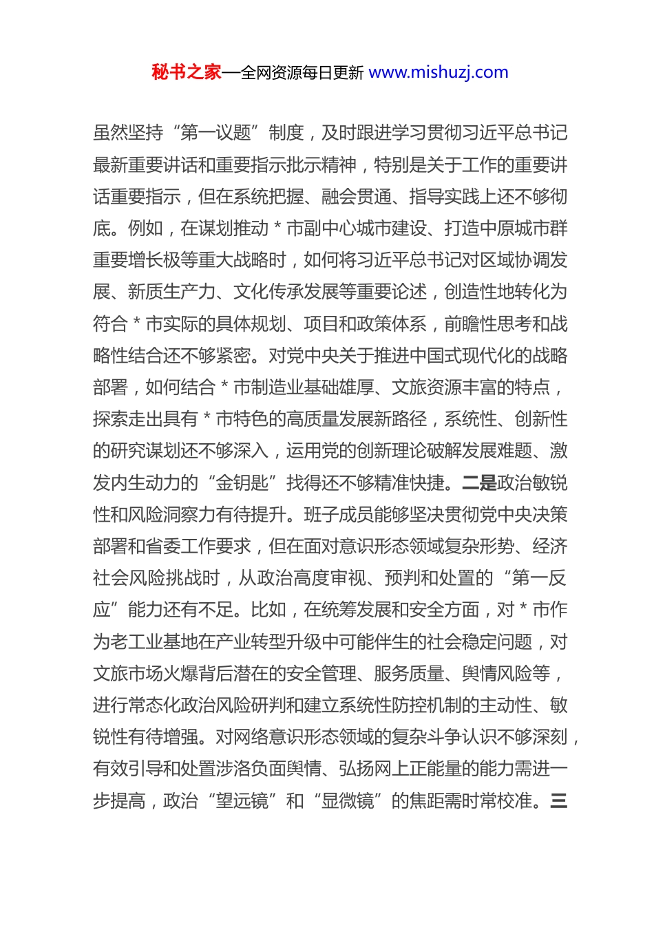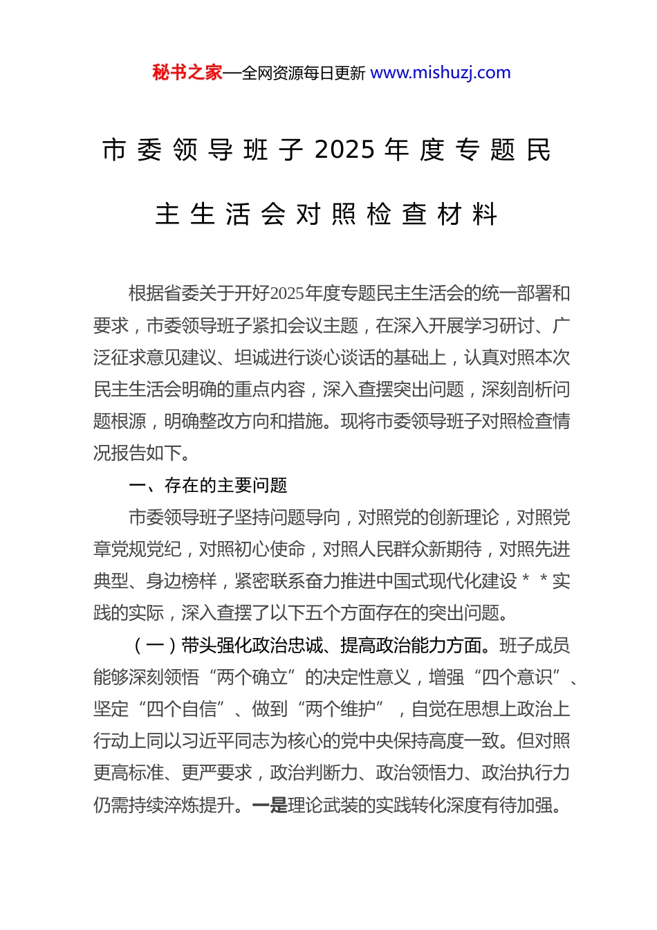 秘书之家—全网资源每日更新 www.mishuzj.com市 委 领 导 班 子 2025 年 度 专 题 民主 生 活 会 对 照 检 查 材 料根据省委关于开好2025年度专题民主生活会的统一部署和要求,市委领导班子紧扣会议主题,在深入开展学习研讨、广泛征求意见建议、坦诚进行谈心谈话的基础上,认真对照本次民主生活会明确的重点内容,深入查摆突出问题,深刻剖析问题根源,明确整改方向和措施。现将市委领导班子对照检查情况报告如下。一、存在的主要问题市委领导班子坚持问题导向,对照党的创新理论,对照党章党规党纪,对照初心使命,对照人民群众新期待,对照先进典型、身边榜样,紧密联系奋力推进中国式现代化建设**实践的实际,深入查摆了以下五个方面存在的突出问题。(一)带头强化政治忠诚、提高政治能力方面。班子成员能够深刻领悟“两个确立”的决定性意义,增强“四个意识”、坚定“四个自信”、做到“两个维护”,自觉在思想上政治上行动上同以习近平同志为核心的党中央保持高度一致。但对照更高标准、更严要求,政治判断力、政治领悟力、政治执行力仍需持续淬炼提升。一是理论武装的实践转化深度有待加强。秘书之家—全网资源每日更新 www.mishuzj.com虽然坚持“第一议题”制度,及时跟进学习贯彻习近平总书记最新重要讲话和重要指示批示精神,特别是关于工作的重要讲话重要指示,但在系统把握、融会贯通、指导实践上还不够彻底。例如,在谋划推动*市副中心城市建设、打造中原城市群重要增长极等重大战略时,如何将习近平总书记对区域协调发展、新质生产力、文化传承发展等重要论述,创造性地转化为符合*市实际的具体规划、项目和政策体系,前瞻性思考和战略性结合还不够紧密。对党中央关于推进中国式现代化的战略部署,如何结合*市制造业基础雄厚、文旅资源丰富的特点,探索走出具有*市特色的高质量发展新路径,系统性、创新性的研究谋划还不够深入,运用党的创新理论破解发展难题、激发内生动力的“金钥匙”找得还不够精准快捷。二是政治敏锐性和风险洞察力有待提升。班子成员能够坚决贯彻党中央决策部署和省委工作要求,但在面对意识形态领域复杂形势、经济社会风险挑战时,从政治高度审视、预判和处置的“第一反应”能力还有不足。比如,在统筹发展和安全方面,对*市作为老工业基地在产业转型升级中可能伴生的社会稳定问题,对文旅市场火爆背后潜在的安全管理、服务质量、舆情风险等,进行常态化政治风险研判和建立系统性防控机制的主动性、敏锐性有待增强。对网络意识形态领域的复杂斗争认识不够深刻,有效引导和处置涉洛负面舆情、弘扬网上正能量的能力需进一步提高,政治“望远镜”和“显微镜”的焦距需时常校准。三秘书之家—全网资源每日更新 www.mishuzj.com是贯彻执行决策部署的力度均衡性有待优化。对于党中央和省委明确的“硬指标”“硬任务”,如黄河流域生态保护和高质量发展、南水北调后续工程高质量发展、耕地保护、安全生产等,能够不折不扣推进落实。但对于一些需要久久为功、绵绵用力的“软任务”,有时存在压力传导逐级递减、工作标准逐层放松的现象。例如,在落实“双碳”目标、推动发展方式绿色转型方面,虽然制定了相关规划,但在推动传统产业绿色化改造、培育绿色新兴产业、倡导全社会绿色生活方式等方面,缺乏更具刚性约束和激励作用的细化措施,一抓到底的狠劲和韧劲有待加强。在推动乡村全面振兴中,对如何将巩固拓展脱贫攻坚成果同乡村振兴有效衔接的政治要求,转化为每个村庄可持续的发展蓝图和农民可感知的实惠,精准滴灌、末端见效的功夫下得还不够深,存在政策落地“最后一公里”不够通畅的问题。(二)带头固本培元、增强党性方面。班子成员能够不断加强党性锻炼,努力提升党性修养,但在理想信念的持续筑牢、党性原则的严格坚守、道德品行的高标准践行上,仍有提升空间。一是理想信念的根基在复杂实践中偶有松动。面对*市改革发展稳定的繁重任务和深层次矛盾挑战,有时班子成员不自觉地陷入具体事务,静下心来从马克思主义立场观点方法、从共产党人初心使命的高度进行反思和内省不够经常。比如,在处理一些历史遗留...
