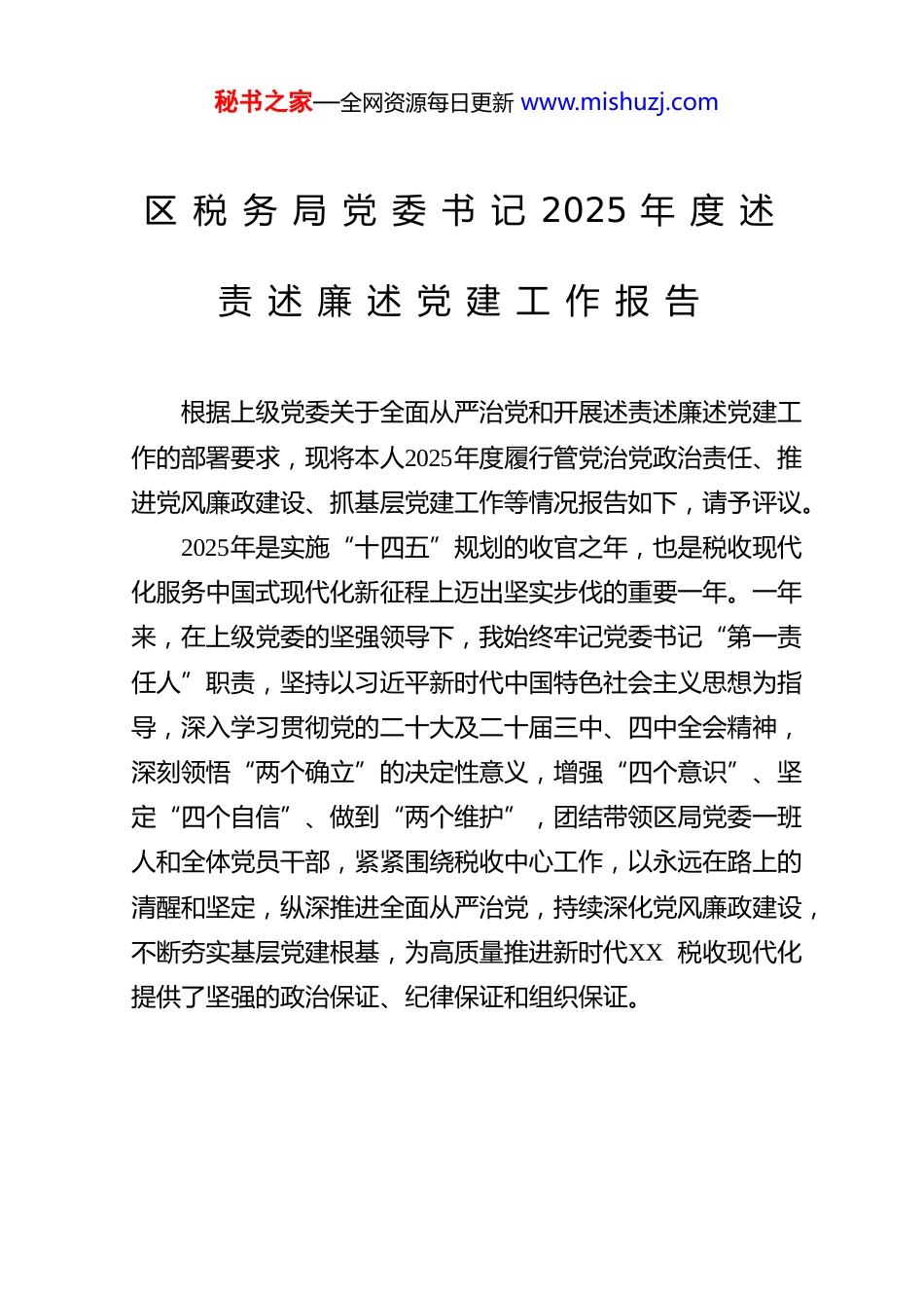 秘书之家—全网资源每日更新 www.mishuzj.com区 税 务 局 党 委 书 记 2025 年 度 述责 述 廉 述 党 建 工 作 报 告根据上级党委关于全面从严治党和开展述责述廉述党建工作的部署要求,现将本人2025年度履行管党治党政治责任、推进党风廉政建设、抓基层党建工作等情况报告如下,请予评议。2025年是实施“十四五”规划的收官之年,也是税收现代化服务中国式现代化新征程上迈出坚实步伐的重要一年。一年来,在上级党委的坚强领导下,我始终牢记党委书记“第一责任人”职责,坚持以习近平新时代中国特色社会主义思想为指导,深入学习贯彻党的二十大及二十届三中、四中全会精神,深刻领悟“两个确立”的决定性意义,增强“四个意识”、坚定“四个自信”、做到“两个维护”,团结带领区局党委一班人和全体党员干部,紧紧围绕税收中心工作,以永远在路上的清醒和坚定,纵深推进全面从严治党,持续深化党风廉政建设,不断夯实基层党建根基,为高质量推进新时代XX 税收现代化提供了坚强的政治保证、纪律保证和组织保证。秘书之家—全网资源每日更新 www.mishuzj.com一、聚焦政治建设“铸魂”,在把稳方向、筑牢忠诚上展现新担当始终将党的政治建设摆在首位,坚持用党的创新理论武装头脑、指导实践、推动工作,确保税收工作始终沿着正确政治方向前进。(一)持续强化理论武装,提升政治“三力”。一是严格落实“第一议题”制度。主持召开党委会议X 次、党委理论学习中心组学习共X 次,第一时间传达学习习近平总书记最新重要讲话、重要指示批示精神和党中央重大决策部署,特别是关于经济工作、税收工作的重要论述,做到学思用贯通、知信行统一。带头撰写学习心得、调研报告X 篇,在《XX 税务》等刊物发表理论文章X 篇。二是扎实开展主题教育常态化长效化工作。巩固拓展主题教育成果,将学习贯彻党的创新理论作为党员干部教育培训的首课、主课、必修课。依托“学习强国”、“学习兴税”等平台,组织线上学习测试X 次,参与率、合格率均达100 %。举办“书记讲堂”、“青年理论沙龙”X 期,覆盖党员干部X 人次。通过持续深入的学习,引导全局党员干部不断提高政治判断力、政治领悟力、政治执行力,自觉在思想上政治上行动上同党中央保持高度一致。三是严明政治纪律和政治规矩。带头并教育引导党员干部严格遵守党章党规党纪,严格执行重大事项请示报告制度,全年向上级党委请示报告重要工作、重大事项X 次。深入开展政治机关意识教育,引导干秘书之家—全网资源每日更新 www.mishuzj.com部深刻认识税务机关首先是政治机关,牢记“为国聚财、为民收税”的神圣使命,确保党中央、国务院关于税收工作的各项决策部署在XX 区局不折不扣落地生根。(二)坚决扛起政治责任,抓实意识形态。一是严格落实意识形态工作责任制。主持召开党委专题研究意识形态工作会议X 次,分析研判意识形态领域风险点X 个,制定并落实防范化解措施。将意识形态工作纳入党建工作责任制、领导班子和领导干部目标管理,与业务工作同部署、同落实、同检查、同考核。二是守牢意识形态主阵地。加强对区局门户网站、微信公众号、内部刊物、宣传栏等阵地的建设管理,严格信息发布审核。密切关注涉税舆情,全年稳妥处置涉税舆情X 起,未发生重大负面舆情。三是强化思想政治引领。结合庆祝建党105周年、新中国成立77周年等重要节点,组织开展“传承红色基因、践行税务初心”等主题教育活动X 场。广泛开展先进典型选树宣传,X 名同志获评“全省税务系统先进工作者”,营造了崇尚先进、学习先进、争当先进的浓厚氛围。(三)严肃党内政治生活,净化政治生态。一是严格执行民主集中制。带头遵守党委工作规则和议事决策程序,凡属“三重一大”事项均经党委集体研究决定。全年召开党委会研究重大事项X 项,均实现科学决策、民主决策、依法决策。班子成员自觉维护班子团结,相互支持、密切配合。二是高质量开好民主生活会和组织生活会。带头深入学习研讨,广泛征求秘书之家—全网资源每日更新 www.mishuzj.com意见建议,深入开展谈心谈话,深刻查摆自身问题。在年度民主生活会和专题民主生活会上...