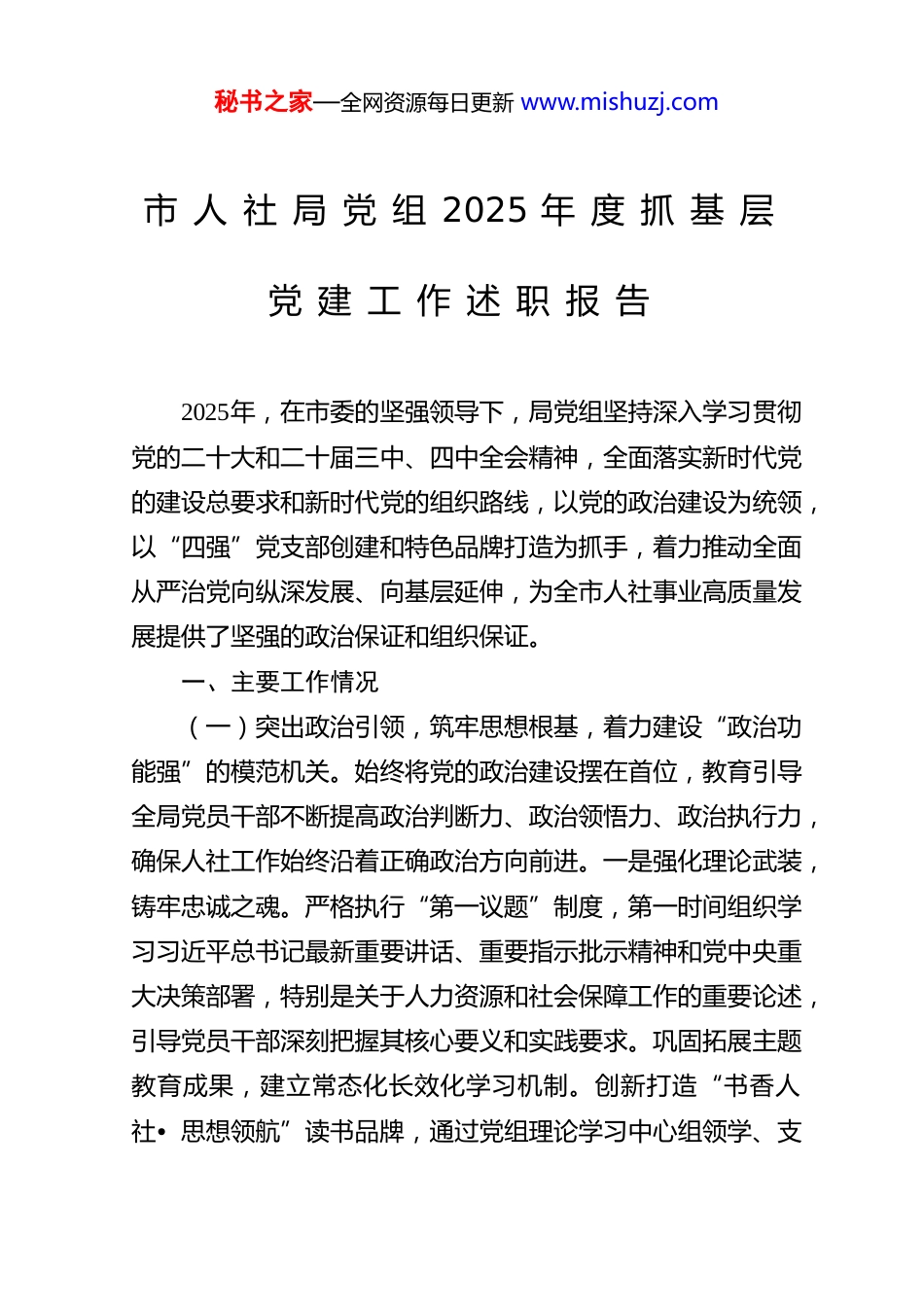 秘书之家—全网资源每日更新 www.mishuzj.com市 人 社 局 党 组 2025 年 度 抓 基 层党 建 工 作 述 职 报 告2025年,在市委的坚强领导下,局党组坚持深入学习贯彻党的二十大和二十届三中、四中全会精神,全面落实新时代党的建设总要求和新时代党的组织路线,以党的政治建设为统领,以“四强”党支部创建和特色品牌打造为抓手,着力推动全面从严治党向纵深发展、向基层延伸,为全市人社事业高质量发展提供了坚强的政治保证和组织保证。一、主要工作情况(一)突出政治引领,筑牢思想根基,着力建设“政治功能强”的模范机关。始终将党的政治建设摆在首位,教育引导全局党员干部不断提高政治判断力、政治领悟力、政治执行力,确保人社工作始终沿着正确政治方向前进。一是强化理论武装,铸牢忠诚之魂。严格执行“第一议题”制度,第一时间组织学习习近平总书记最新重要讲话、重要指示批示精神和党中央重大决策部署,特别是关于人力资源和社会保障工作的重要论述,引导党员干部深刻把握其核心要义和实践要求。巩固拓展主题教育成果,建立常态化长效化学习机制。创新打造“书香人社• 思想领航”读书品牌,通过党组理论学习中心组领学、支秘书之家—全网资源每日更新 www.mishuzj.com部集中研学、青年理论学习小组深学、党员个人自学“四学联动”,举办“人社大讲堂”、专题读书班、研讨交流会等20余场次,推动党的创新理论入脑入心、指导实践。扎实开展深入贯彻中央八项规定精神学习教育,组织原原本本学习新修订的《中国共产党纪律处分条例》,开展警示教育月活动,引导党员干部学纪、知纪、明纪、守纪。二是严肃政治生活,淬炼党性修养。严格落实《关于新形势下党内政治生活的若干准则》,严格执行“三会一课”、民主生活会、组织生活会、民主评议党员、谈心谈话等制度。局党组成员带头以普通党员身份参加所在支部组织生活,带头讲授专题党课。创新主题党日活动形式,结合人社工作实际,组织开展“追寻红色足迹、传承革命精神”、“优化营商环境、党员争当先锋”、“重温入党誓词、坚守初心使命”等特色主题党日活动30余次。运用好本地红色资源和党性教育基地,加强党史、新中国史、改革开放史、社会主义发展史学习教育,引导党员干部传承红色基因,赓续红色血脉。三是压实政治责任,确保政令畅通。牢固树立“抓好党建是本职、不抓党建是失职、抓不好党建是不称职”的理念,制定《局党组及其成员落实全面从严治党责任清单》,层层签订党建工作责任书,构建起党组负总责、书记带头抓、班子成员分工抓、机关党委专职抓、党支部具体抓的“五级责任体系”。建立党建工作季度督查、半年评估、年度述职评议考核机制,将党建考核结果与干部评先评优、选拔任用硬挂钩。坚秘书之家—全网资源每日更新 www.mishuzj.com决贯彻落实党中央决策部署和省委、市委工作要求,确保就业优先政策、社会保障制度改革、人才人事工作、和谐劳动关系构建等重点任务不折不扣落到实处,以服务大局的实际成效彰显政治担当。(二)建强战斗堡垒,提升履职能力,着力锻造“支部班子强”的骨干力量。坚持抓基层、打基础,以提升组织力为重点,突出政治功能,把局属各党支部建设成为宣传党的主张、贯彻党的决定、领导基层治理、团结动员群众、推动改革发展的坚强战斗堡垒。一是选优配强“领头雁”。结合党支部换届和调整,注重选拔政治强、业务精、作风好、善协调的优秀党员干部担任党支部书记和委员。举办党支部书记和党务干部培训班,围绕党建理论、实务操作、品牌创建等内容进行专题辅导,全年培训80余人次,有效提升了支部班子的履职能力。严格落实党支部书记抓基层党建工作述职评议考核制度,推动支部书记切实履行第一责任人职责。二是提升班子整体效能。完善支部委员会议事规则和决策程序,凡属重要事项均经集体研究决定。定期召开支委会,研究工作、交流思想、解决问题,形成工作合力。班子成员分工负责、团结协作,在推进“放管服”改革、应对突发事件、完成重大任务等工作中,主动担当、密切配合,展现了较强的凝聚力和战斗力。注重加强对支部工作的指导,局党组成员每人联系1 -2...