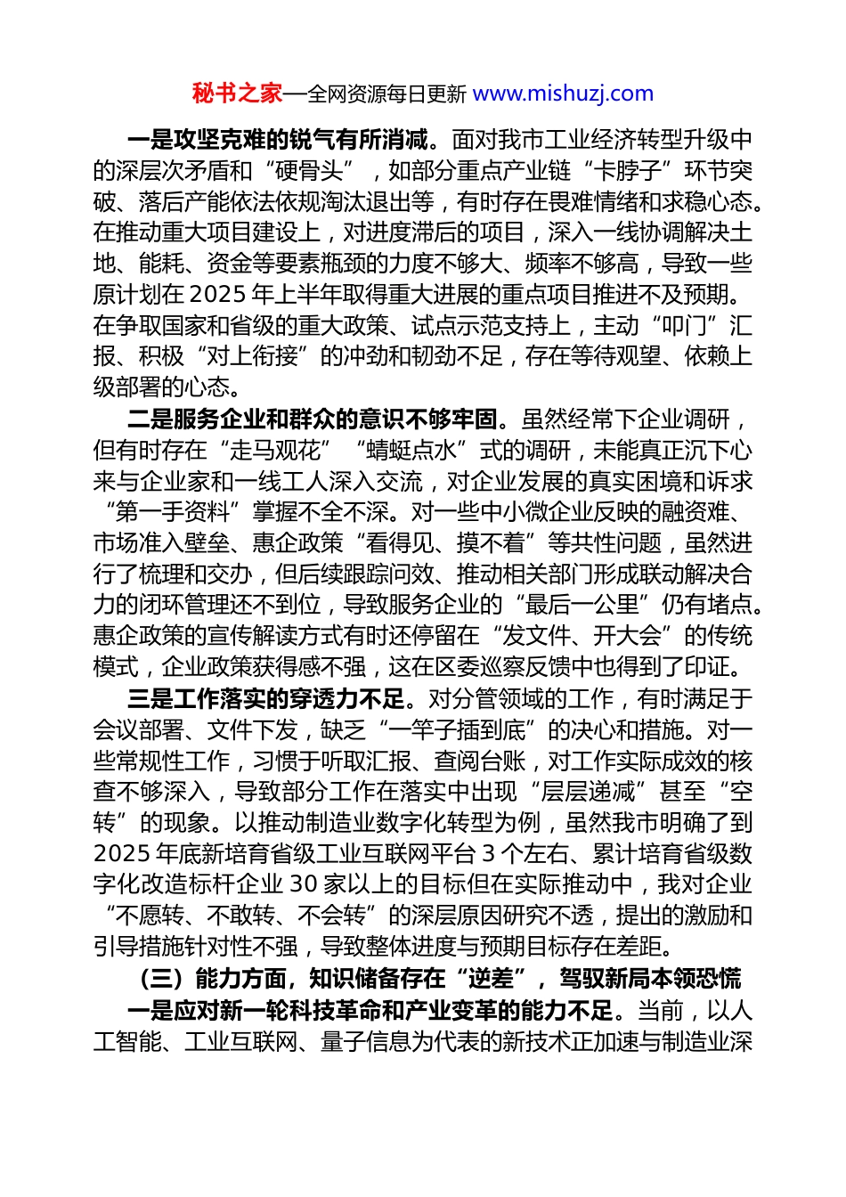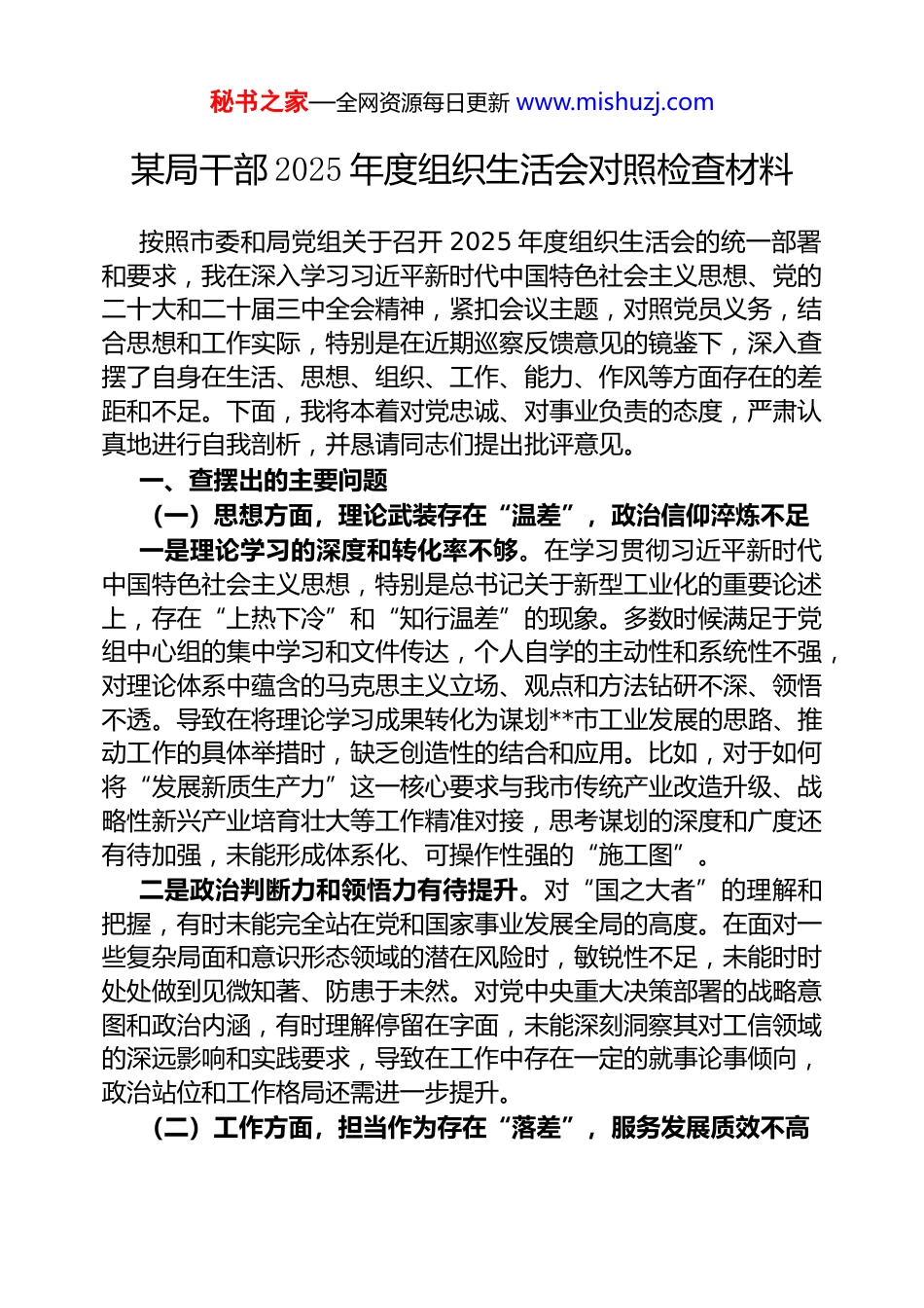 秘书之家—全网资源每日更新 www.mishuzj.com某局干部 2025 年度组织生活会对照检查材料按照市委和局党组关于召开 2025 年度组织生活会的统一部署和要求,我在深入学习习近平新时代中国特色社会主义思想、党的二十大和二十届三中全会精神,紧扣会议主题,对照党员义务,结合思想和工作实际,特别是在近期巡察反馈意见的镜鉴下,深入查摆了自身在生活、思想、组织、工作、能力、作风等方面存在的差距和不足。下面,我将本着对党忠诚、对事业负责的态度,严肃认真地进行自我剖析,并恳请同志们提出批评意见。一、查摆出的主要问题(一)思想方面,理论武装存在“温差”,政治信仰淬炼不足一是理论学习的深度和转化率不够。在学习贯彻习近平新时代中国特色社会主义思想,特别是总书记关于新型工业化的重要论述上,存在“上热下冷”和“知行温差”的现象。多数时候满足于党组中心组的集中学习和文件传达,个人自学的主动性和系统性不强,对理论体系中蕴含的马克思主义立场、观点和方法钻研不深、领悟不透。导致在将理论学习成果转化为谋划**市工业发展的思路、推动工作的具体举措时,缺乏创造性的结合和应用。比如,对于如何将“发展新质生产力”这一核心要求与我市传统产业改造升级、战略性新兴产业培育壮大等工作精准对接,思考谋划的深度和广度还有待加强,未能形成体系化、可操作性强的“施工图”。二是政治判断力和领悟力有待提升。对“国之大者”的理解和把握,有时未能完全站在党和国家事业发展全局的高度。在面对一些复杂局面和意识形态领域的潜在风险时,敏锐性不足,未能时时处处做到见微知著、防患于未然。对党中央重大决策部署的战略意图和政治内涵,有时理解停留在字面,未能深刻洞察其对工信领域的深远影响和实践要求,导致在工作中存在一定的就事论事倾向,政治站位和工作格局还需进一步提升。(二)工作方面,担当作为存在“落差”,服务发展质效不高秘书之家—全网资源每日更新 www.mishuzj.com一是攻坚克难的锐气有所消减。面对我市工业经济转型升级中的深层次矛盾和“硬骨头”,如部分重点产业链“卡脖子”环节突破、落后产能依法依规淘汰退出等,有时存在畏难情绪和求稳心态。在推动重大项目建设上,对进度滞后的项目,深入一线协调解决土地、能耗、资金等要素瓶颈的力度不够大、频率不够高,导致一些原计划在 2025 年上半年取得重大进展的重点项目推进不及预期。在争取国家和省级的重大政策、试点示范支持上,主动“叩门”汇报、积极“对上衔接”的冲劲和韧劲不足,存在等待观望、依赖上级部署的心态。二是服务企业和群众的意识不够牢固。虽然经常下企业调研,但有时存在“走马观花”“蜻蜓点水”式的调研,未能真正沉下心来与企业家和一线工人深入交流,对企业发展的真实困境和诉求“第一手资料”掌握不全不深。对一些中小微企业反映的融资难、市场准入壁垒、惠企政策“看得见、摸不着”等共性问题,虽然进行了梳理和交办,但后续跟踪问效、推动相关部门形成联动解决合力的闭环管理还不到位,导致服务企业的“最后一公里”仍有堵点。惠企政策的宣传解读方式有时还停留在“发文件、开大会”的传统模式,企业政策获得感不强,这在区委巡察反馈中也得到了印证。三是工作落实的穿透力不足。对分管领域的工作,有时满足于会议部署、文件下发,缺乏“一竿子插到底”的决心和措施。对一些常规性工作,习惯于听取汇报、查阅台账,对工作实际成效的核查不够深入,导致部分工作在落实中出现“层层递减”甚至“空转”的现象。以推动制造业数字化转型为例,虽然我市明确了到2025 年底新培育省级工业互联网平台 3 个左右、累计培育省级数字化改造标杆企业 30 家以上的目标但在实际推动中,我对企业“不愿转、不敢转、不会转”的深层原因研究不透,提出的激励和引导措施针对性不强,导致整体进度与预期目标存在差距。(三)能力方面,知识储备存在“逆差”,驾驭新局本领恐慌一是应对新一轮科技革命和产业变革的能力不足。当前,以人工智能、工业互联网、量子信息为代表的新技术正加速与制造业深秘书之家—全网资源每日更新 www.mishuzj.com度融合,但我个人在这...