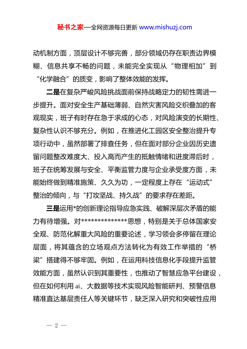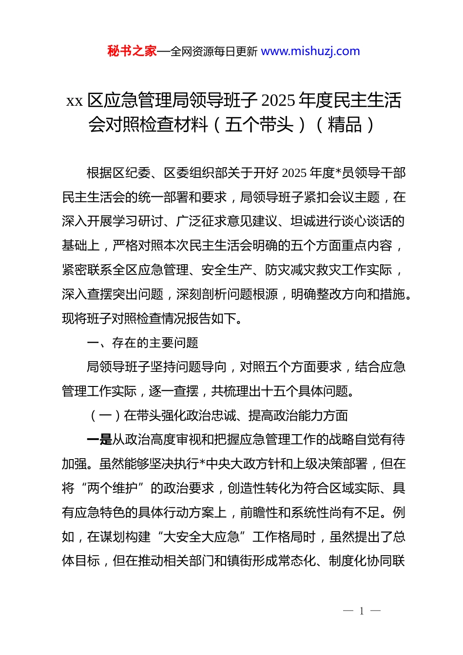 秘书之家—全网资源每日更新 www.mishuzj.comxx 区应急管理局领导班子 2025 年度民主生活会对照检查材料(五个带头)(精品)根据区纪委、区委组织部关于开好 2025 年度*员领导干部民主生活会的统一部署和要求,局领导班子紧扣会议主题,在深入开展学习研讨、广泛征求意见建议、坦诚进行谈心谈话的基础上,严格对照本次民主生活会明确的五个方面重点内容,紧密联系全区应急管理、安全生产、防灾减灾救灾工作实际,深入查摆突出问题,深刻剖析问题根源,明确整改方向和措施。现将班子对照检查情况报告如下。一、存在的主要问题局领导班子坚持问题导向,对照五个方面要求,结合应急管理工作实际,逐一查摆,共梳理出十五个具体问题。(一)在带头强化政治忠诚、提高政治能力方面一是从政治高度审视和把握应急管理工作的战略自觉有待加强。虽然能够坚决执行*中央大政方针和上级决策部署,但在将“两个维护”的政治要求,创造性转化为符合区域实际、具有应急特色的具体行动方案上,前瞻性和系统性尚有不足。例如,在谋划构建“大安全大应急”工作格局时,虽然提出了总体目标,但在推动相关部门和镇街形成常态化、制度化协同联— 1 —秘书之家—全网资源每日更新 www.mishuzj.com动机制方面,顶层设计不够完善,部分领域仍存在职责边界模糊、信息共享不畅的问题,未能完全实现从“物理相加”到“化学融合”的质变,影响了整体效能的发挥。二是在复杂严峻风险挑战面前保持战略定力的韧性需进一步提升。面对安全生产基础薄弱、自然灾害风险交织叠加的客观现实,班子有时存在急于求成的心态,对风险演变的长期性、复杂性认识不够充分。例如,在推进化工园区安全整治提升专项行动中,虽然部署了排查任务,但在面对部分企业因历史遗留问题整改难度大、投入高而产生的抵触情绪和进度滞后时,班子在统筹发展与安全、平衡监管力度与企业承受度方面,未能始终做到精准施策、久久为功,一定程度上存在“运动式”整治的倾向,与“打攻坚战、持久战”的要求存在差距。三是运用*的创新理论指导应急实践、破解深层次矛盾的能力有待增强。对**************思想,特别是关于总体国家安全观、防范化解重大风险的重要论述,学习领会多停留在理论层面,将其蕴含的立场观点方法转化为有效工作举措的“桥梁”搭建得不够牢固。例如,在运用科技信息化手段提升监管效能方面,虽然认识到其重要性,也推动了智慧应急平台建设,但在如何利用 ai、大数据等技术实现风险智能研判、预警信息精准直达基层责任人等关键环节,缺乏深入研究和突破性应用— 2 —秘书之家—全网资源每日更新 www.mishuzj.com方案,导致部分工作仍依赖于传统人海战术,前瞻性风险防控能力不足。(二)在带头固本培元、增强*性方面一是理论武装的深度与转化效率有待提高。班子集体学习能够按时开展,但在读原著、学原文、悟原理上下的功夫还不够深,满足于“已学习”,在“真领会”、“善运用”上存在短板。学习内容与应急管理主责主业结合不够紧密,未能完全将学习成果系统性地转化为提升*性修养、指导工作实践的强大动力。例如,在组织学习*的二十届四中全会精神时,更多关注了宏观部署,对于如何将其精神实质具体化为完善我区应急管理体系、提升依法应急能力的可操作路径,研讨不够深入,形成的指导性意见较为原则。二是*性锻炼的主动性和常态化机制有待健全。班子成员能够以普通*员身份参加组织生活,但在运用批评和自我批评武器打扫思想灰尘、增强政治免疫力方面,有时存在“好人主义”思想,辣味不足。班子成员之间工作交流多,思想交锋少;谈具体业务多,触及灵魂深处的*性分析少。例如,在年度述职或专题组织生活会上,自我批评往往谈工作问题多、谈思想根源少,相互批评也多以工作建议代替思想帮助,未能真正达到红脸出汗、排毒治病的效果,影响了*性修养的持续锤炼。— 3 —秘书之家—全网资源每日更新 www.mishuzj.com三是在弘扬共产*人精神追求、筑牢信仰之基上示范引领作用有待强化。班子能够坚守廉洁底线,但在以自身过硬*性引领全局*员干部筑牢世界观、人生观、价值观“总开关”方面,载体和抓手不够丰富。应急...