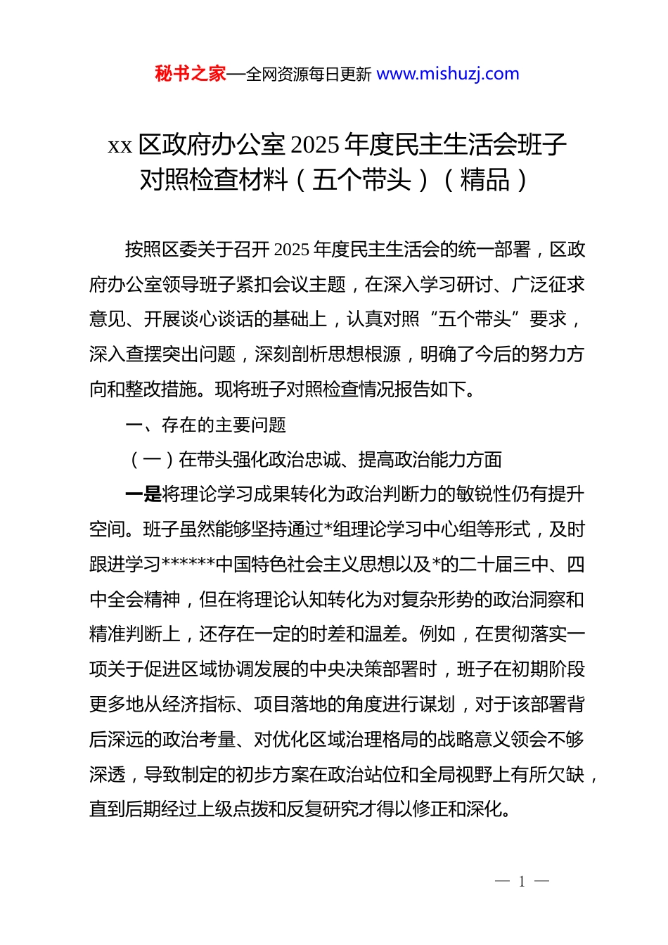 秘书之家—全网资源每日更新 www.mishuzj.comxx 区政府办公室 2025 年度民主生活会班子对照检查材料(五个带头)(精品)按照区委关于召开 2025 年度民主生活会的统一部署,区政府办公室领导班子紧扣会议主题,在深入学习研讨、广泛征求意见、开展谈心谈话的基础上,认真对照“五个带头”要求,深入查摆突出问题,深刻剖析思想根源,明确了今后的努力方向和整改措施。现将班子对照检查情况报告如下。一、存在的主要问题(一)在带头强化政治忠诚、提高政治能力方面一是将理论学习成果转化为政治判断力的敏锐性仍有提升空间。班子虽然能够坚持通过*组理论学习中心组等形式,及时跟进学习******中国特色社会主义思想以及*的二十届三中、四中全会精神,但在将理论认知转化为对复杂形势的政治洞察和精准判断上,还存在一定的时差和温差。例如,在贯彻落实一项关于促进区域协调发展的中央决策部署时,班子在初期阶段更多地从经济指标、项目落地的角度进行谋划,对于该部署背后深远的政治考量、对优化区域治理格局的战略意义领会不够深透,导致制定的初步方案在政治站位和全局视野上有所欠缺,直到后期经过上级点拨和反复研究才得以修正和深化。— 1 —秘书之家—全网资源每日更新 www.mishuzj.com二是在贯彻落实上级决策部署的能动性和创造性上尚有不足。班子始终在思想上政治上行动上同以***同志为核心的*中央保持高度一致,但在执行具体工作指令时,有时存在着一种惯性思维,即严格按照文件指令“照方抓药”,缺乏结合 xx 区实际进行创造性转化的主动意识。比如,在推进某项全区性的数字化治理改革工作中,班子严格遵循了上级下发的指导框架和技术标准,确保了工作的规范性和统一性。然而,在如何利用这一契机,同步解决长期困扰我区基层治理的一些特有“堵点”和“痛点”问题上,未能主动思考、系统谋划,错失了“一子落而全盘活”的机会,使得改革的综合效能未能完全释放。三是运用政治眼光观察和分析问题的能力需持续加强。面对当前意识形态领域的复杂斗争,班子成员的政治警觉性和鉴别力总体是强的,但有时在处理一些涉及民生的热点敏感问题时,仍存在就事论事的倾向。在 2025 年上半年处理一起因老旧小区改造引发的群众集体反映事件中,办公室在协调相关部门处置时,初期工作重点主要放在了解释政策、平息舆论上,对事件背后可能存在的、由网络负面叙事所煽动的不良社会情绪未能给予足够的政治重视和前瞻性研判,导致应对工作一度陷入被动,这反映出从政治高度审视和把握社会动态的能力仍需— 2 —秘书之家—全网资源每日更新 www.mishuzj.com在实践中不断锤炼。(二)在带头固本培元、增强*性方面一是*性修养的锤炼未能完全融入日常工作的全过程。班子成员能够自觉加强*性锻炼,但在工作实践中,偶尔会出现事务主义倾向,将*性修养与业务工作割裂开来。在推动年度重点项目建设过程中,班子将主要精力投入到抓进度、保节点、促投资等具体事务上,对项目推进过程中*员干部的思想动态、作风状态关注不够,未能将项目一线作为锤炼*性、考验干部的主阵地。这种重业务、轻思想的倾向,使得*性修养的巩固缺乏鲜活的实践载体,容易流于形式。二是在开展批评与自我批评中,“辣味”仍显不足。尽管在民主生活会和组织生活会中,班子能够坦诚相见,但有时批评意见仍存在“隔靴搔痒”的现象,出于维护班子团结的良好初衷,对一些非原则性的苗头性、倾向性问题点到为止,未能深挖根源、一针见血。比如,在一次内部工作复盘会上,针对某项工作效率不高的问题,批评意见多集中于外部协调难度大、客观条件限制多,而对班子内部统筹不力、责任压得不实等主观问题触及不深,影响了批评与自我批评这一锐利武器的战斗力。三是在坚守共产*人精神追求与应对现实考验的结合上存在— 3 —秘书之家—全网资源每日更新 www.mishuzj.com差距。班子成员理想信念坚定,但在面对一些长期性、历史性遗留难题时,偶尔会滋生畏难情绪和“求稳”心态。以我区某历史遗留的产权纠纷问题为例,该问题时间跨度长、涉及面广、处理难度极大。班子虽然多次组织专题研究,但考虑到其复杂性和潜在的维稳...