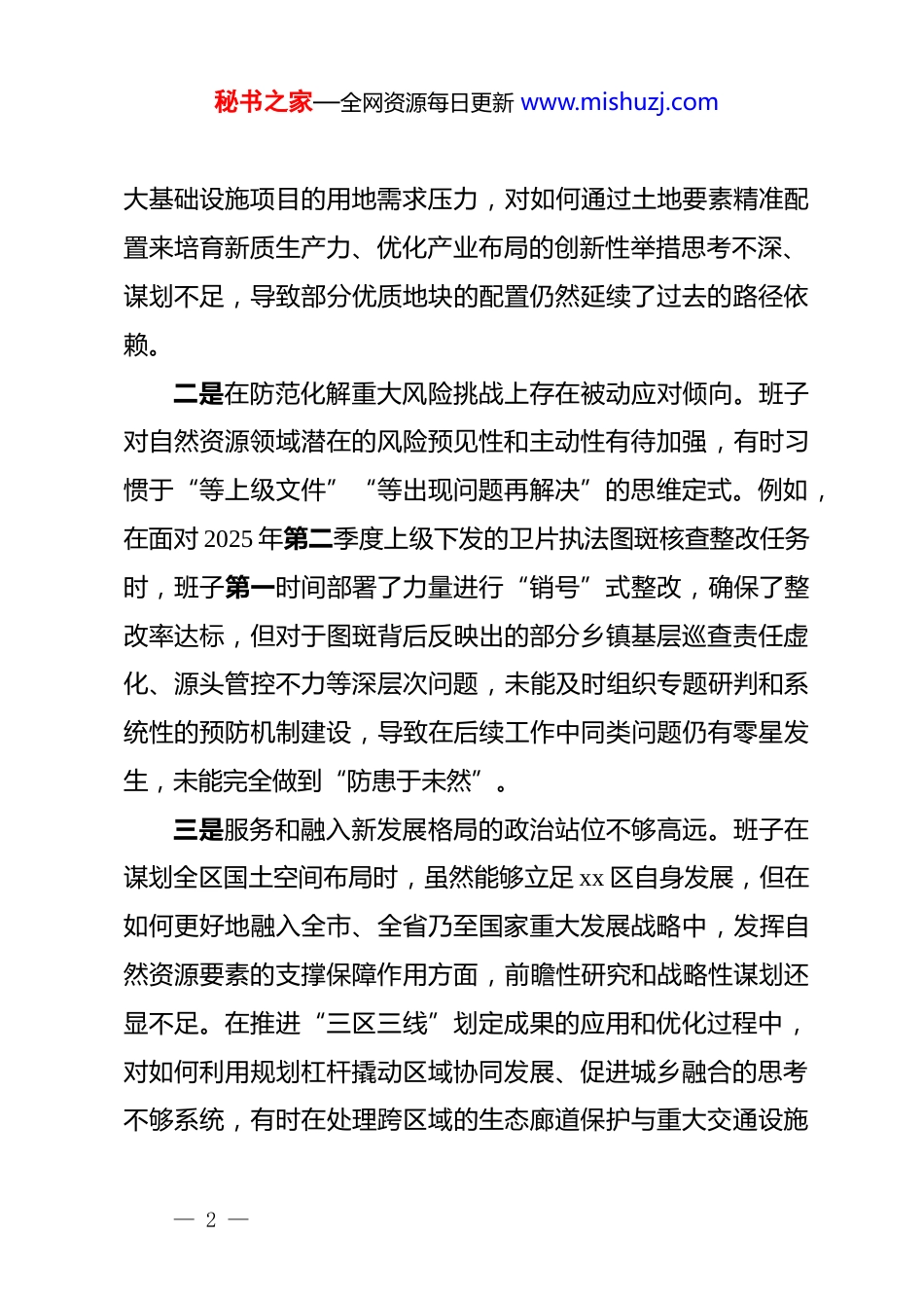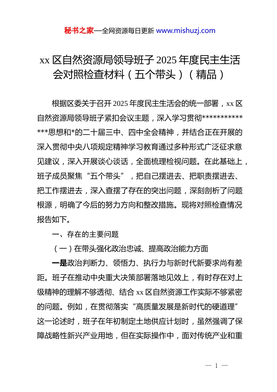 秘书之家—全网资源每日更新 www.mishuzj.comxx 区自然资源局领导班子 2025 年度民主生活会对照检查材料(五个带头)(精品)根据区委关于召开 2025 年度民主生活会的统一部署,xx 区自然资源局领导班子紧扣会议主题,深入学习贯彻**************思想和*的二十届三中、四中全会精神,并结合正在开展的深入贯彻中央八项规定精神学习教育通过多种形式广泛征求意见建议,深入开展谈心谈话,全面梳理检视问题。在此基础上,班子成员聚焦“五个带头”,把自己摆进去、把职责摆进去、把工作摆进去,深入查摆了存在的突出问题,深刻剖析了问题根源,明确了今后的努力方向和整改措施。现将对照检查情况报告如下。一、存在的主要问题(一)在带头强化政治忠诚、提高政治能力方面一是政治判断力、领悟力、执行力与新时代新要求尚有差距。班子在推动中央重大决策部署落地见效上,有时存在对上级精神的理解不够透彻、结合 xx 区自然资源工作实际不够紧密的问题。例如,在贯彻落实“高质量发展是新时代的硬道理”这一论述时,班子在年初制定土地供应计划时,虽然强调了保障战略性新兴产业用地,但在实际操作中,面对传统产业和重— 1 —秘书之家—全网资源每日更新 www.mishuzj.com大基础设施项目的用地需求压力,对如何通过土地要素精准配置来培育新质生产力、优化产业布局的创新性举措思考不深、谋划不足,导致部分优质地块的配置仍然延续了过去的路径依赖。二是在防范化解重大风险挑战上存在被动应对倾向。班子对自然资源领域潜在的风险预见性和主动性有待加强,有时习惯于“等上级文件”“等出现问题再解决”的思维定式。例如,在面对 2025 年第二季度上级下发的卫片执法图斑核查整改任务时,班子第一时间部署了力量进行“销号”式整改,确保了整改率达标,但对于图斑背后反映出的部分乡镇基层巡查责任虚化、源头管控不力等深层次问题,未能及时组织专题研判和系统性的预防机制建设,导致在后续工作中同类问题仍有零星发生,未能完全做到“防患于未然”。三是服务和融入新发展格局的政治站位不够高远。班子在谋划全区国土空间布局时,虽然能够立足 xx 区自身发展,但在如何更好地融入全市、全省乃至国家重大发展战略中,发挥自然资源要素的支撑保障作用方面,前瞻性研究和战略性谋划还显不足。在推进“三区三线”划定成果的应用和优化过程中,对如何利用规划杠杆撬动区域协同发展、促进城乡融合的思考不够系统,有时在处理跨区域的生态廊道保护与重大交通设施— 2 —秘书之家—全网资源每日更新 www.mishuzj.com建设的矛盾时,更多是就事论事地解决具体项目冲突,缺乏从更高层面、更宽视野上进行统筹规划的战略考量。(二)在带头固本培元、增强*性方面一是理论学习与实践转化存在“两张皮”现象。班子虽然严格执行了*组理论学习中心组学习制度,定期组织学习**************思想和*中央最新精神,但在将学习成果转化为解决实际问题的具体思路和有效办法上,衔接不够紧密。例如,在组织学习了*的二十十届四中全会精神后,班子成员在研讨中谈了很多深刻体会,但在随后修订《xx 区国有建设用地使用权出让管理办法》时,对于如何将“治理能力现代化”的要求体现到流程再造、信息公开、公众参与等具体制度设计中,讨论不深、创新不多,修订后的文件在根本性制度创新上突破不大。二是从严开展*内政治生活的“辣味”有所减弱。在民主生活会和组织生活会上,班子成员之间开展批评与自我批评时,有时存在“重工作建议、轻思想交锋”的现象,顾及情面、委婉含蓄的“和风细雨”多,一针见血、触及灵魂的“疾风骤雨”少。比如,在对某位班子成员分管的耕地保护工作出现短板进行批评时,提出的意见多集中于“要加强对基层的督促指导”“人员力量要配足”等客观因素,而对其是否存在攻坚克难精神不足、工作抓得不够实不够细等主观思想层面的问题,— 3 —秘书之家—全网资源每日更新 www.mishuzj.com则点到为止,未能真正起到“红脸出汗、排毒治病”的效果。三是*性锤炼的自觉性和主动性有待持续提升。班子成员大多能够积极参加集体组织的*性教育活动,但在个人自学和常态化自我净...