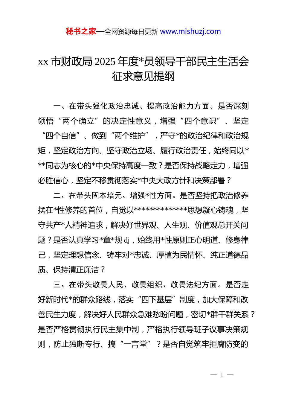 秘书之家—全网资源每日更新 www.mishuzj.comxx 市财政局 2025 年度*员领导干部民主生活会征求意见提纲一、在带头强化政治忠诚、提高政治能力方面。是否深刻领悟“两个确立”的决定性意义,增强“四个意识”、坚定“四个自信”、做到“两个维护”,严守*的政治纪律和政治规矩,坚定政治方向、坚守政治立场、履行政治责任,始终同以***同志为核心的*中央保持高度一致?是否保持战略定力,增强必胜信心,坚定不移贯彻落实*中央大政方针和决策部署?二、在带头固本培元、增强*性方面。是否坚持把政治修养摆在*性修养的首位,自觉以**************思想凝心铸魂,坚守共产*人精神追求,解决好世界观、人生观、价值观总开关问题?是否认真学习*章*规 dj,始终用*性原则正心明道、修身律己,坚定理想信念、铸牢对*忠诚、厚植为民情怀、纯正道德品质、保持清正廉洁?三、在带头敬畏人民、敬畏组织、敬畏法纪方面。是否走好新时代*的群众路线,落实“四下基层”制度,加大保障和改善民生力度,解决好人民群众急难愁盼问题,密切*群干群关系?是否严格贯彻执行民主集中制,严格执行领导班子议事决策规则,防止独断专行、搞“一言堂”?是否自觉筑牢拒腐防变的— 1 —秘书之家—全网资源每日更新 www.mishuzj.com思想堤坝,规范权力运行,防止特权思想、特权现象,防止随意用权、任性用权?四、在带头干事创业、担当作为方面。是否树立和践行正确政绩观,完整准确全面贯彻新发展理念,统筹推进经济建设和各领域工作?是否坚持干字当头,积极识变应变求变,正确把握形势,增强忧患意识,坚持底线思维,用好发展机遇、潜力和优势,敢于斗争、善于斗争,以历史主动精神克难关、战风险、迎挑战,在推动高质量发展、加强基层治理、完成急难险重任务中担当作为,为实现“十五五”良好开局打牢基础?五、在带头坚决扛起管*治*责任方面。是否严于律己、严负其责、严管所辖,以永远在路上的坚韧和执着,持之以恒推进全面从严治*,扎实推进贯彻落实中央八项规定精神,常态化开展作风教育,扎牢作风建设制度笼子,强化监督执纪,深入推进风腐同查同治,坚决把*的自我革命要求落实到位?是否落实整治形式主义为基层减负长效机制,坚决整治公文抄袭和调研考察、横向交流中的形式主义问题?是否树好选人用人风向标,注重考察干部的忠诚度廉洁度?是否规范*员干部网络空间言行,引导发挥积极作用?六、对市财政局领导班子今后的工作分别有什么意见和建议?— 2 —