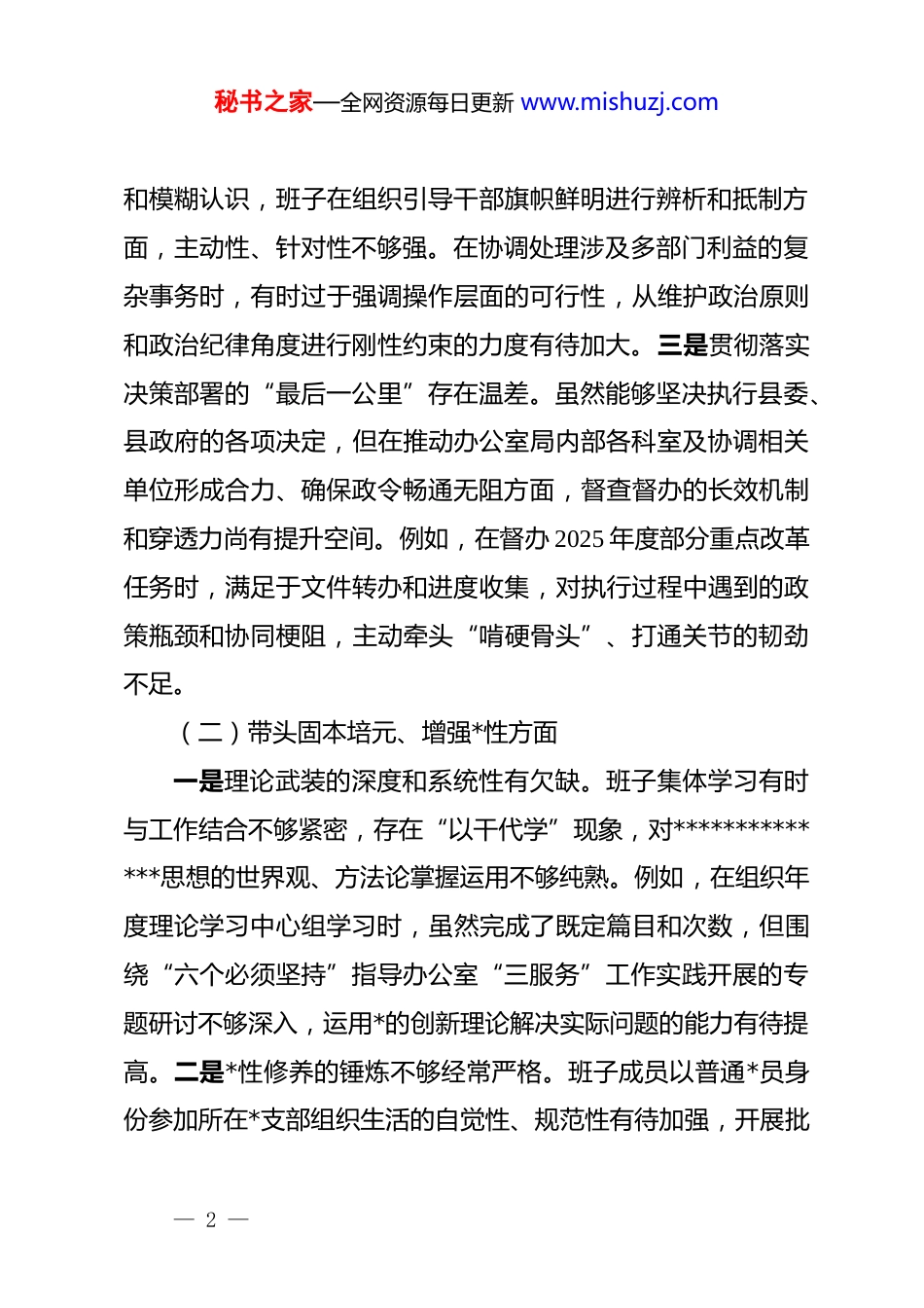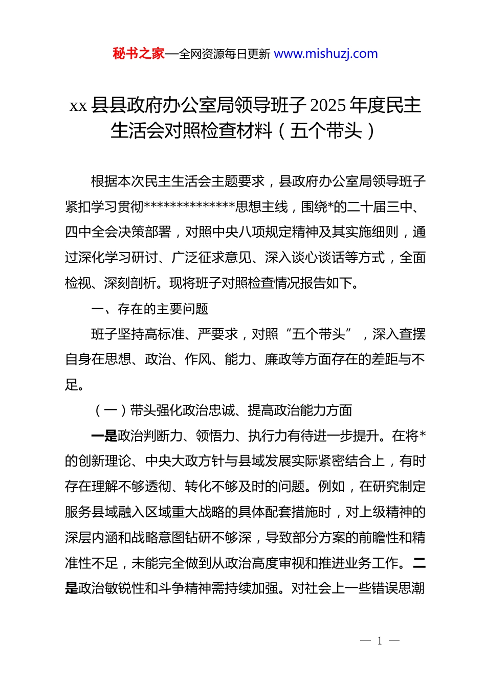 秘书之家—全网资源每日更新 www.mishuzj.comxx 县县政府办公室局领导班子 2025 年度民主生活会对照检查材料(五个带头)根据本次民主生活会主题要求,县政府办公室局领导班子紧扣学习贯彻**************思想主线,围绕*的二十届三中、四中全会决策部署,对照中央八项规定精神及其实施细则,通过深化学习研讨、广泛征求意见、深入谈心谈话等方式,全面检视、深刻剖析。现将班子对照检查情况报告如下。一、存在的主要问题班子坚持高标准、严要求,对照“五个带头”,深入查摆自身在思想、政治、作风、能力、廉政等方面存在的差距与不足。(一)带头强化政治忠诚、提高政治能力方面一是政治判断力、领悟力、执行力有待进一步提升。在将*的创新理论、中央大政方针与县域发展实际紧密结合上,有时存在理解不够透彻、转化不够及时的问题。例如,在研究制定服务县域融入区域重大战略的具体配套措施时,对上级精神的深层内涵和战略意图钻研不够深,导致部分方案的前瞻性和精准性不足,未能完全做到从政治高度审视和推进业务工作。二是政治敏锐性和斗争精神需持续加强。对社会上一些错误思潮— 1 —秘书之家—全网资源每日更新 www.mishuzj.com和模糊认识,班子在组织引导干部旗帜鲜明进行辨析和抵制方面,主动性、针对性不够强。在协调处理涉及多部门利益的复杂事务时,有时过于强调操作层面的可行性,从维护政治原则和政治纪律角度进行刚性约束的力度有待加大。三是贯彻落实决策部署的“最后一公里”存在温差。虽然能够坚决执行县委、县政府的各项决定,但在推动办公室局内部各科室及协调相关单位形成合力、确保政令畅通无阻方面,督查督办的长效机制和穿透力尚有提升空间。例如,在督办 2025 年度部分重点改革任务时,满足于文件转办和进度收集,对执行过程中遇到的政策瓶颈和协同梗阻,主动牵头“啃硬骨头”、打通关节的韧劲不足。(二)带头固本培元、增强*性方面一是理论武装的深度和系统性有欠缺。班子集体学习有时与工作结合不够紧密,存在“以干代学”现象,对**************思想的世界观、方法论掌握运用不够纯熟。例如,在组织年度理论学习中心组学习时,虽然完成了既定篇目和次数,但围绕“六个必须坚持”指导办公室“三服务”工作实践开展的专题研讨不够深入,运用*的创新理论解决实际问题的能力有待提高。二是*性修养的锤炼不够经常严格。班子成员以普通*员身份参加所在*支部组织生活的自觉性、规范性有待加强,开展批— 2 —秘书之家—全网资源每日更新 www.mishuzj.com评与自我批评有时“辣味”不足。在传承红色基因、弘扬优良传统方面,组织形式的创新性不够,教育感染力有待提升。例如,在策划开展革命传统教育时,多采用参观学习等传统方式,如何引导*员干部将感悟内化为坚定理想信念、筑牢信仰之基的自觉行动,方法措施不够丰富有效。三是理想信念教育融入日常管理不够紧密。对*员干部的思想动态跟踪分析不够及时全面,谈心谈话多侧重于工作交流,在深入了解干部世界观、人生观、价值观状况,针对性加强引导方面做得不够。例如,对于年轻干部在职业发展、工作压力等方面的思想困惑,班子集体研究进行系统性疏导和价值观引领的机制不够健全。(三)带头敬畏人民、敬畏组织、敬畏法纪方面一是践行群众路线不够深入扎实。“四下基层”制度落实中,存在“身入”基层多、“心到”基层少的情况。调研安排有时考虑基层实际不够,提前打招呼、按设定路线走的情况仍有发生,难以全面掌握原汁原味的民情民意。例如,在协调推进 2025 年“丰富开放式全民健身空间”民生实事项目前期,虽然组织了现场调研,但对不同社区、不同年龄段居民差异化需求的摸排不够细致,导致部分点位规划与群众实际使用习惯存在偏差,后期进行了调整。二是民主集中制执行质量有待提高。班子议事决策程序虽然规范,但在一些非重大事项上,会前酝— 3 —秘书之家—全网资源每日更新 www.mishuzj.com酿沟通有时不够充分,会上听取不同意见的耐心和包容性可以更强。例如,在研究办公室内部信息化建设方案时,由于前期技术论证和意见征求范围不够广,会上对部分技术路线的争议较大,影响了决...