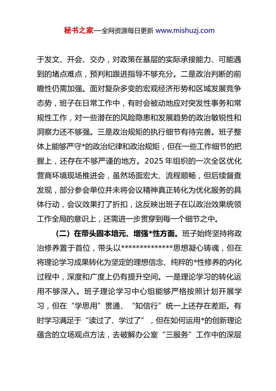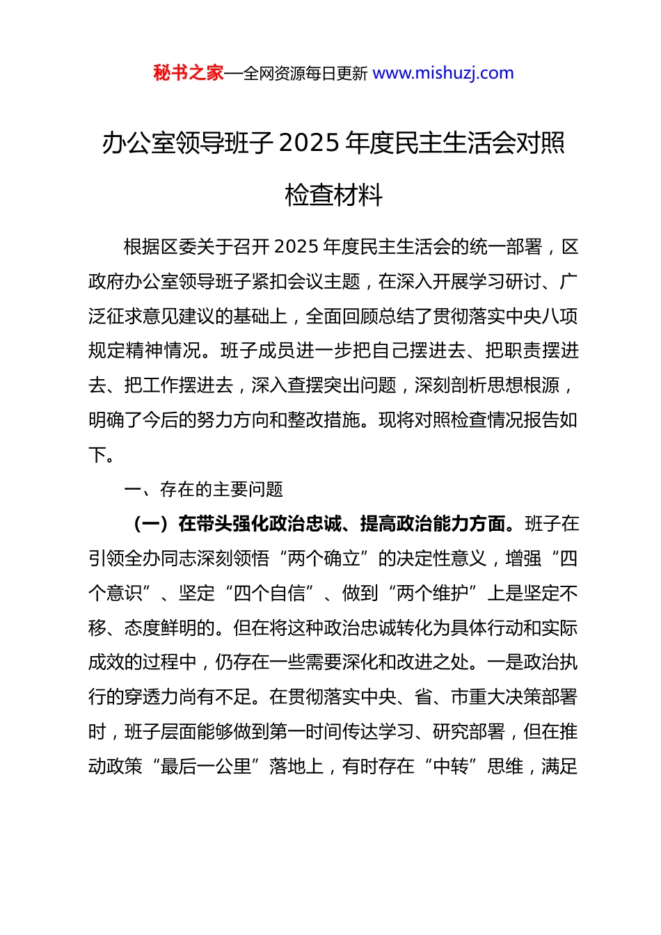 秘书之家—全网资源每日更新 www.mishuzj.com办公室领导班子 2025 年度民主生活会对照检查材料根据区委关于召开 2025 年度民主生活会的统一部署,区政府办公室领导班子紧扣会议主题,在深入开展学习研讨、广泛征求意见建议的基础上,全面回顾总结了贯彻落实中央八项规定精神情况。班子成员进一步把自己摆进去、把职责摆进去、把工作摆进去,深入查摆突出问题,深刻剖析思想根源,明确了今后的努力方向和整改措施。现将对照检查情况报告如下。一、存在的主要问题(一)在带头强化政治忠诚、提高政治能力方面。班子在引领全办同志深刻领悟“两个确立”的决定性意义,增强“四个意识”、坚定“四个自信”、做到“两个维护”上是坚定不移、态度鲜明的。但在将这种政治忠诚转化为具体行动和实际成效的过程中,仍存在一些需要深化和改进之处。一是政治执行的穿透力尚有不足。在贯彻落实中央、省、市重大决策部署时,班子层面能够做到第一时间传达学习、研究部署,但在推动政策“最后一公里”落地上,有时存在“中转”思维,满足秘书之家—全网资源每日更新 www.mishuzj.com于发文、开会、交办,对政策在基层的实际承接能力、可能遇到的堵点难点,预判和跟进指导不够充分。二是政治判断的前瞻性仍需加强。面对复杂多变的宏观经济形势和区域发展竞争态势,班子在日常工作中,有时会被动地应对突发性事务和常规性工作,对一些潜在的风险隐患和发展趋势的政治敏锐性和洞察力还不够强。三是政治规矩的执行细节有待完善。班子整体上能够严守*的政治纪律和政治规矩,但在一些工作细节的把握上,还存在不够严谨的地方。2025 年组织的一次全区优化营商环境现场推进会,虽然场面宏大、流程顺畅,但后续督查发现,部分参会单位并未将会议精神真正转化为优化服务的具体行动,会议效果打了折扣,这反映出班子在以政治效果统领工作全局的意识上,还需进一步贯穿到每一个细节之中。(二)在带头固本培元、增强*性方面。班子始终坚持将政治修养置于首位,带头以**************思想凝心铸魂,但在将理论学习成果转化为坚定的理想信念、纯粹的*性修养的内化过程中,深度和广度上仍有提升空间。一是理论学习的转化运用不够深入。班子理论学习中心组能够严格按照计划开展学习,但在“学思用”贯通、“知信行”统一上还存在差距。有时学习满足于“读过了、学过了”,但在如何运用*的创新理论蕴含的立场观点方法,去破解办公室“三服务”工作中的深层秘书之家—全网资源每日更新 www.mishuzj.com次矛盾和问题上,思考和研讨不够深入。比如,在学习贯彻*的二十届四中全会精神后,班子虽然组织了专题学习,但在结合我区实际,就如何优化政府办公室的督查督办机制,使其更有效地服务于提升基层治理效能这一具体课题,缺乏系统性的研究和创新性的实践探索,导致学习成果与推动工作高质量发展的结合度不够紧密。二是*性锤炼的自觉性有待提高。班子成员大多是长期从事机关工作的干部,容易在按部就班的工作节奏中,不自觉地放松了*性修养的持续锤炼。在日常工作中,更多地是从行政管理、业务运行的角度思考问题,主动对照*章*规dj 这面镜子,检视自身在*性原则、精神追求方面存在的差距和不足还不够经常。比如,在面对一些棘手的协调事项或信访难题时,第一反应有时是思考如何运用行政手段和工作技巧去“摆平”,而不是首先从践行*的根本宗旨、站稳人民立场的*性高度去审视和处理问题,这说明在灵魂深处解决“总开关”问题的功夫还下得不够扎实。三是理想信念教育的抓常抓长有所欠缺。班子在抓好自身学习的同时,对办公室全体*员干部的理想信念教育,方式方法还不够丰富,常态化、制度化的长效机制建设还有待加强。多以集中学习、专题*课等传统形式为主,利用本地红色资源、典型案例开展沉浸式、体验式教育做得不够。例如,在 2025 年开展的 dj 学习教育中,虽然组织了秘书之家—全网资源每日更新 www.mishuzj.com条例的逐章逐条学习,但在挖掘和宣传身边恪尽职守、廉洁奉公的先进典型,用身边事教育身边人方面做得不够,导致教育的感染力和渗透力未能达到最佳效果,理想信念的“钙”质补充还不够及时和...