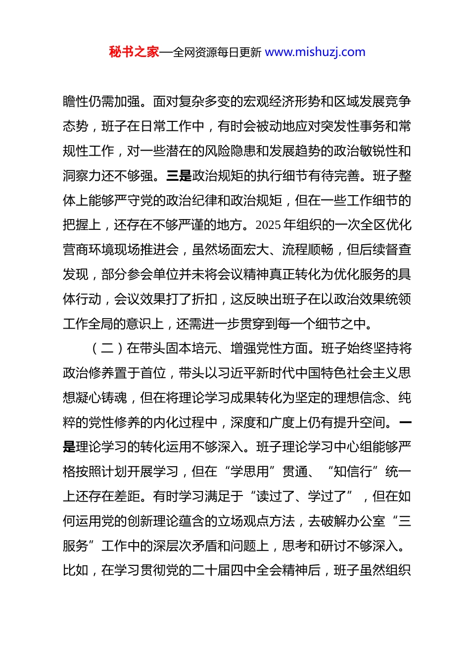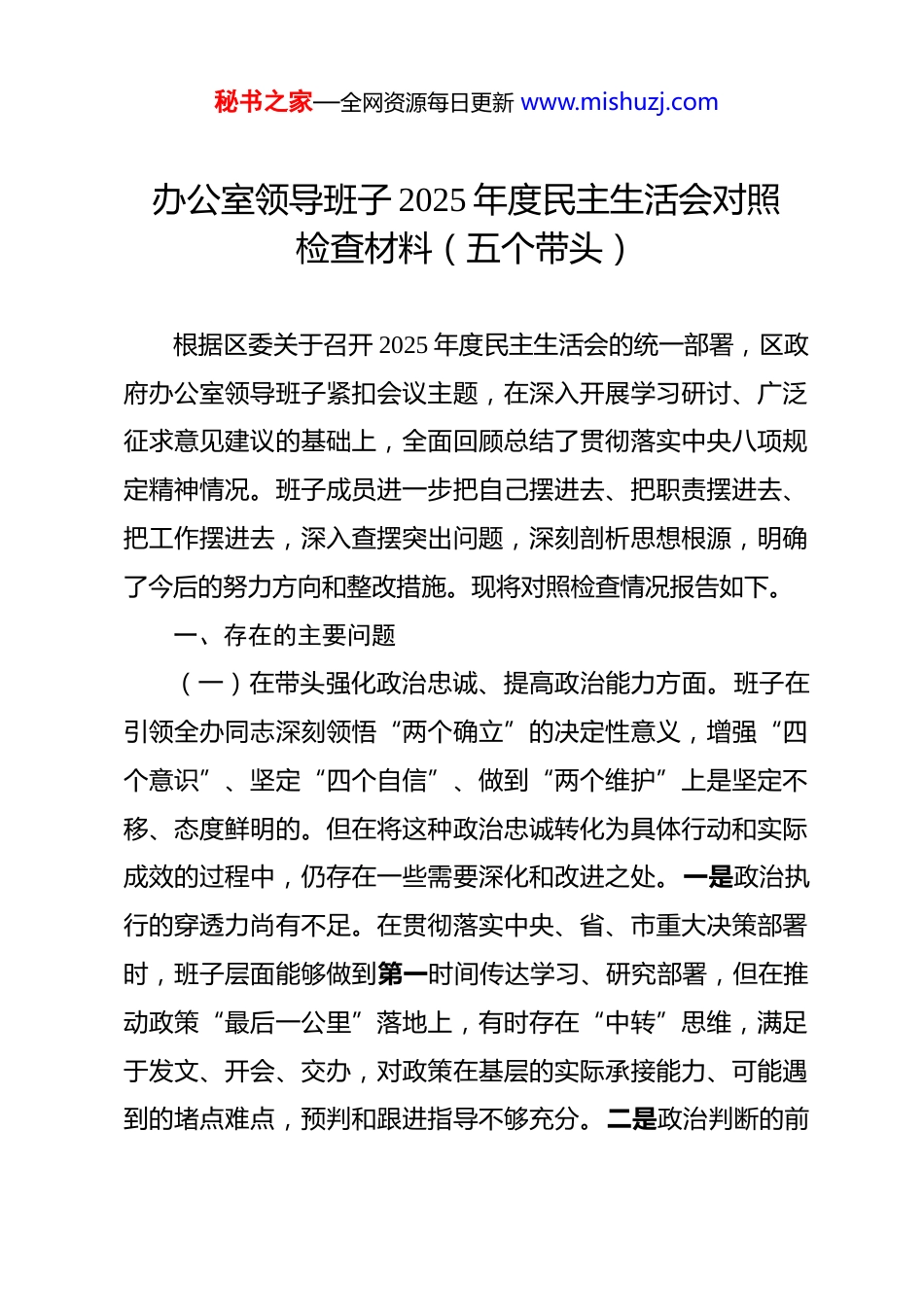 秘书之家—全网资源每日更新 www.mishuzj.com办公室领导班子 2025 年度民主生活会对照检查材料(五个带头)根据区委关于召开 2025 年度民主生活会的统一部署,区政府办公室领导班子紧扣会议主题,在深入开展学习研讨、广泛征求意见建议的基础上,全面回顾总结了贯彻落实中央八项规定精神情况。班子成员进一步把自己摆进去、把职责摆进去、把工作摆进去,深入查摆突出问题,深刻剖析思想根源,明确了今后的努力方向和整改措施。现将对照检查情况报告如下。一、存在的主要问题(一)在带头强化政治忠诚、提高政治能力方面。班子在引领全办同志深刻领悟“两个确立”的决定性意义,增强“四个意识”、坚定“四个自信”、做到“两个维护”上是坚定不移、态度鲜明的。但在将这种政治忠诚转化为具体行动和实际成效的过程中,仍存在一些需要深化和改进之处。一是政治执行的穿透力尚有不足。在贯彻落实中央、省、市重大决策部署时,班子层面能够做到第一时间传达学习、研究部署,但在推动政策“最后一公里”落地上,有时存在“中转”思维,满足于发文、开会、交办,对政策在基层的实际承接能力、可能遇到的堵点难点,预判和跟进指导不够充分。二是政治判断的前秘书之家—全网资源每日更新 www.mishuzj.com瞻性仍需加强。面对复杂多变的宏观经济形势和区域发展竞争态势,班子在日常工作中,有时会被动地应对突发性事务和常规性工作,对一些潜在的风险隐患和发展趋势的政治敏锐性和洞察力还不够强。三是政治规矩的执行细节有待完善。班子整体上能够严守党的政治纪律和政治规矩,但在一些工作细节的把握上,还存在不够严谨的地方。2025 年组织的一次全区优化营商环境现场推进会,虽然场面宏大、流程顺畅,但后续督查发现,部分参会单位并未将会议精神真正转化为优化服务的具体行动,会议效果打了折扣,这反映出班子在以政治效果统领工作全局的意识上,还需进一步贯穿到每一个细节之中。(二)在带头固本培元、增强党性方面。班子始终坚持将政治修养置于首位,带头以习近平新时代中国特色社会主义思想凝心铸魂,但在将理论学习成果转化为坚定的理想信念、纯粹的党性修养的内化过程中,深度和广度上仍有提升空间。一是理论学习的转化运用不够深入。班子理论学习中心组能够严格按照计划开展学习,但在“学思用”贯通、“知信行”统一上还存在差距。有时学习满足于“读过了、学过了”,但在如何运用党的创新理论蕴含的立场观点方法,去破解办公室“三服务”工作中的深层次矛盾和问题上,思考和研讨不够深入。比如,在学习贯彻党的二十届四中全会精神后,班子虽然组织秘书之家—全网资源每日更新 www.mishuzj.com了专题学习,但在结合我区实际,就如何优化政府办公室的督查督办机制,使其更有效地服务于提升基层治理效能这一具体课题,缺乏系统性的研究和创新性的实践探索,导致学习成果与推动工作高质量发展的结合度不够紧密。二是党性锤炼的自觉性有待提高。班子成员大多是长期从事机关工作的干部,容易在按部就班的工作节奏中,不自觉地放松了党性修养的持续锤炼。在日常工作中,更多地是从行政管理、业务运行的角度思考问题,主动对照党章党规党纪这面镜子,检视自身在党性原则、精神追求方面存在的差距和不足还不够经常。比如,在面对一些棘手的协调事项或信访难题时,第一反应有时是思考如何运用行政手段和工作技巧去“摆平”,而不是首先从践行党的根本宗旨、站稳人民立场的党性高度去审视和处理问题,这说明在灵魂深处解决“总开关”问题的功夫还下得不够扎实。三是理想信念教育的抓常抓长有所欠缺。班子在抓好自身学习的同时,对办公室全体党员干部的理想信念教育,方式方法还不够丰富,常态化、制度化的长效机制建设还有待加强。多以集中学习、专题党课等传统形式为主,利用本地红色资源、典型案例开展沉浸式、体验式教育做得不够。例如,在 2025 年开展的党纪学习教育中,虽然组织了条例的逐章逐条学习,但在挖掘和宣传身边恪尽职守、廉洁奉公的先进典型,用身边事教秘书之家—全网资源每日更新 www.mishuzj.com育身边人方面做得不够,导致教育的感染力和渗透力未能达到最佳效...