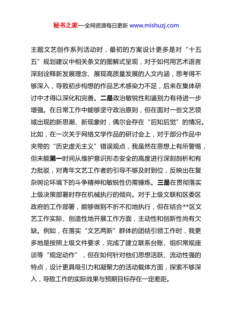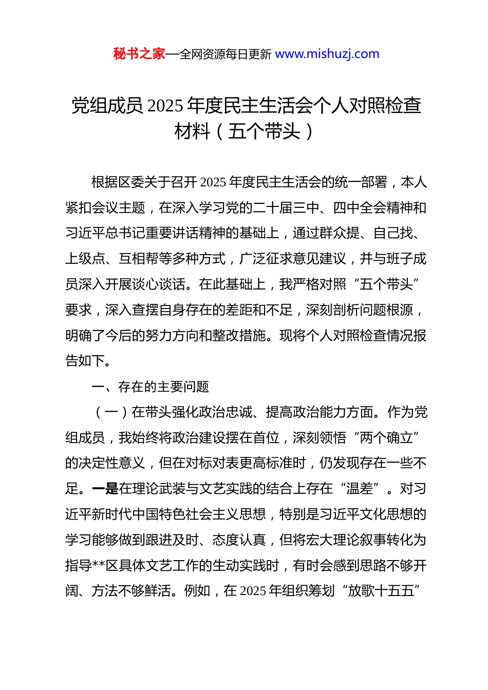 秘书之家—全网资源每日更新 www.mishuzj.com党组成员 2025 年度民主生活会个人对照检查材料(五个带头)根据区委关于召开 2025 年度民主生活会的统一部署,本人紧扣会议主题,在深入学习党的二十届三中、四中全会精神和习近平总书记重要讲话精神的基础上,通过群众提、自己找、上级点、互相帮等多种方式,广泛征求意见建议,并与班子成员深入开展谈心谈话。在此基础上,我严格对照“五个带头”要求,深入查摆自身存在的差距和不足,深刻剖析问题根源,明确了今后的努力方向和整改措施。现将个人对照检查情况报告如下。一、存在的主要问题(一)在带头强化政治忠诚、提高政治能力方面。作为党组成员,我始终将政治建设摆在首位,深刻领悟“两个确立”的决定性意义,但在对标对表更高标准时,仍发现存在一些不足。一是在理论武装与文艺实践的结合上存在“温差”。对习近平新时代中国特色社会主义思想,特别是习近平文化思想的学习能够做到跟进及时、态度认真,但将宏大理论叙事转化为指导**区具体文艺工作的生动实践时,有时会感到思路不够开阔、方法不够鲜活。例如,在 2025 年组织筹划“放歌十五五”秘书之家—全网资源每日更新 www.mishuzj.com主题文艺创作系列活动时,最初的方案设计更多是对“十五五”规划建议中相关条文的图解式呈现,对于如何用艺术语言深刻诠释新发展理念、展现高质量发展的人文内涵,思考得不够深入,导致初步构想的作品艺术感染力不足,后来在集体研讨中才得以深化和完善。二是政治敏锐性和鉴别力有待进一步增强。在日常工作中能够坚守政治原则,但在面对一些文艺领域出现的新思潮、新现象时,偶尔会存在“后知后觉”的情况。比如,在一次关于网络文学作品的研讨会上,对于部分作品中夹带的“历史虚无主义”错误观点,我虽然在思想上有所警惕,但未能第一时间从维护意识形态安全的高度进行深刻剖析和有力批驳,对青年文艺工作者的引导不够及时到位,反映出在复杂舆论环境下的斗争精神和敏锐性仍需锤炼。三是在贯彻落实上级决策部署时存在机械执行的倾向。对于上级文联和区委区政府的工作部署,能够做到不折不扣地执行,但在结合**区文艺工作实际、创造性地开展工作方面,主动性和创新性尚有欠缺。例如,在落实“文艺两新”群体的团结引领工作时,我更多地是按照上级文件要求,完成了建立联系台账、组织常规座谈等“规定动作”,但在如何针对他们思想活跃、流动性强的特点,设计更具吸引力和凝聚力的活动载体方面,探索不够深入,导致工作的实际效果与预期目标存在一定差距。秘书之家—全网资源每日更新 www.mishuzj.com(二)在带头固本培元、增强党性方面。我始终注重加强党性修养,但反躬自省,发现自己在“内功”修炼上还存在薄弱环节,党性锤炼的自觉性和彻底性有待提高。一是党性分析的深刻性不足。在参加组织生活时,能够坦诚地进行自我批评,但有时对问题的剖析习惯于从工作层面找原因,未能真正做到深挖思想根源、触及灵魂深处。在 2025 年上半年的一次组织生活会上,我反思某项文艺惠民活动群众参与度不高的问题时,将原因归结为宣传力度不够、活动形式单一,而没有进一步反思这背后是否是自己宗旨意识弱化、深入群众调研不够的体现,自我解剖的“手术刀”不够锋利。二是理想信念的淬炼不够持续。在日常工作中,能够坚定共产主义远大理想和中国特色社会主义共同理想,但在面对繁重琐碎的行政事务时,偶尔会产生“先完成任务再说”的念头,用事务工作的繁忙代替了党性锻炼的坚持。比如,在负责推进《大九华》文艺期刊的编辑出版工作时,我将主要精力投入到组稿、审校、印刷等具体流程中,有时会忽视通过编辑工作向广大文艺爱好者传播党的创新理论、弘扬社会主义核心价值观这一根本职责,把业务工作和党建工作割裂开来。三是在价值追求的坚守上偶有松懈。能够做到明大德、守公德、严私德,但在面对文艺界的一些不良风气时,有时态度不够鲜明、斗争不够坚决。例如,在一次文艺秘书之家—全网资源每日更新 www.mishuzj.com奖项的评审过程中,对于个别评委提出的“圈子化”“人情化”倾向的评审意见,我虽然内心不赞同,但考虑到“团结”...