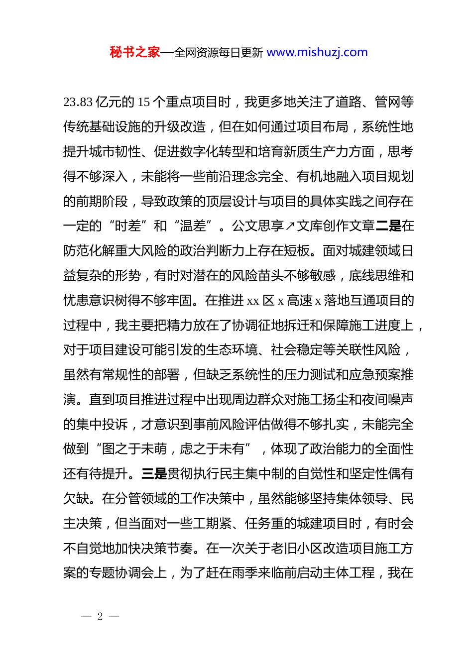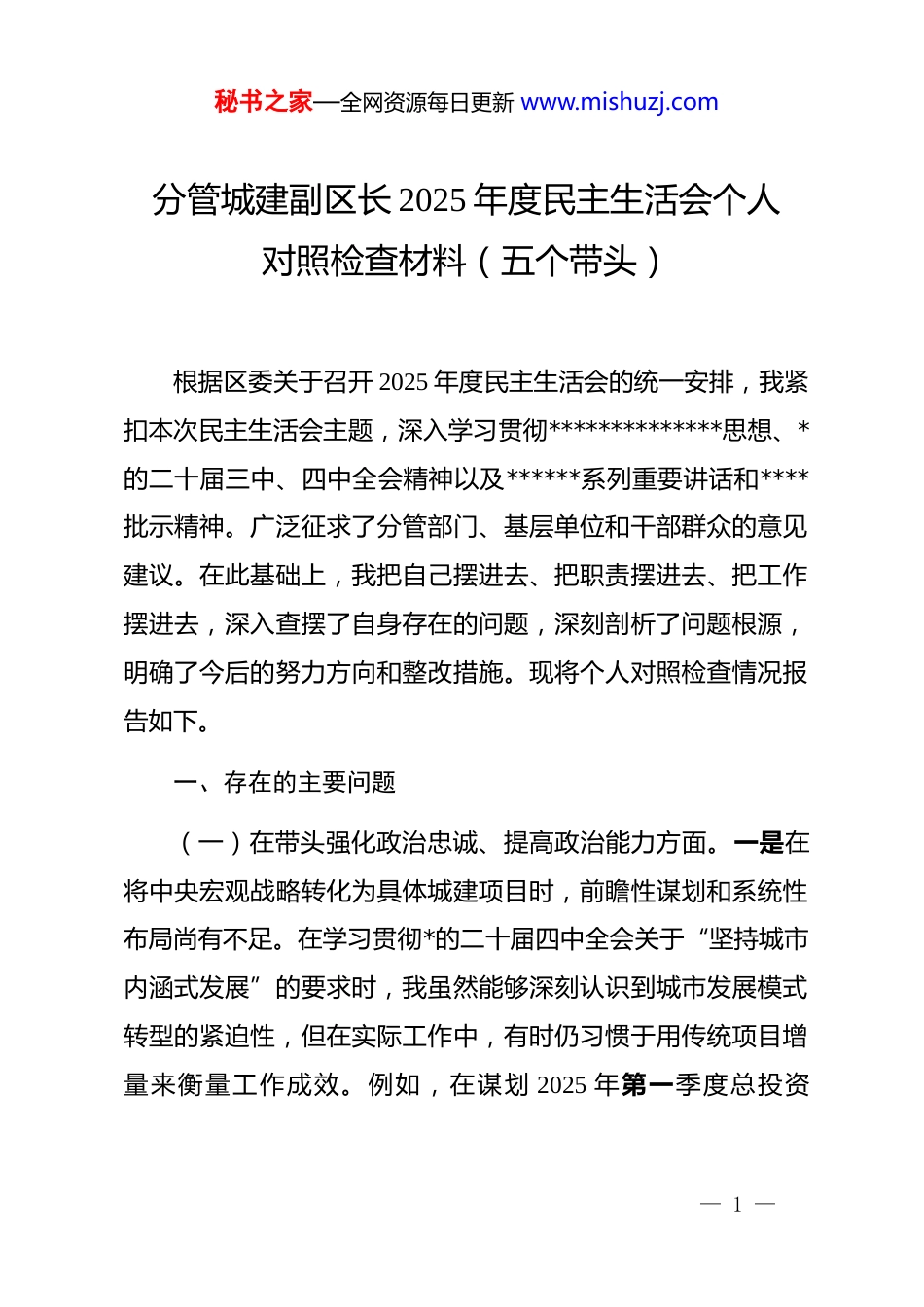 秘书之家—全网资源每日更新 www.mishuzj.com分管城建副区长 2025 年度民主生活会个人对照检查材料(五个带头)根据区委关于召开 2025 年度民主生活会的统一安排,我紧扣本次民主生活会主题,深入学习贯彻**************思想、*的二十届三中、四中全会精神以及******系列重要讲话和****批示精神。广泛征求了分管部门、基层单位和干部群众的意见建议。在此基础上,我把自己摆进去、把职责摆进去、把工作摆进去,深入查摆了自身存在的问题,深刻剖析了问题根源,明确了今后的努力方向和整改措施。现将个人对照检查情况报告如下。一、存在的主要问题(一)在带头强化政治忠诚、提高政治能力方面。一是在将中央宏观战略转化为具体城建项目时,前瞻性谋划和系统性布局尚有不足。在学习贯彻*的二十届四中全会关于“坚持城市内涵式发展”的要求时,我虽然能够深刻认识到城市发展模式转型的紧迫性,但在实际工作中,有时仍习惯于用传统项目增量来衡量工作成效。例如,在谋划 2025 年第一季度总投资— 1 —秘书之家—全网资源每日更新 www.mishuzj.com23.83 亿元的 15 个重点项目时,我更多地关注了道路、管网等传统基础设施的升级改造,但在如何通过项目布局,系统性地提升城市韧性、促进数字化转型和培育新质生产力方面,思考得不够深入,未能将一些前沿理念完全、有机地融入项目规划的前期阶段,导致政策的顶层设计与项目的具体实践之间存在一定的“时差”和“温差”。公文思享↗文库创作文章二是在防范化解重大风险的政治判断力上存在短板。面对城建领域日益复杂的形势,有时对潜在的风险苗头不够敏感,底线思维和忧患意识树得不够牢固。在推进 xx 区 x 高速 x 落地互通项目的过程中,我主要把精力放在了协调征地拆迁和保障施工进度上,对于项目建设可能引发的生态环境、社会稳定等关联性风险,虽然有常规性的部署,但缺乏系统性的压力测试和应急预案推演。直到项目推进过程中出现周边群众对施工扬尘和夜间噪声的集中投诉,才意识到事前风险评估做得不够扎实,未能完全做到“图之于未萌,虑之于未有”,体现了政治能力的全面性还有待提升。三是贯彻执行民主集中制的自觉性和坚定性偶有欠缺。在分管领域的工作决策中,虽然能够坚持集体领导、民主决策,但当面对一些工期紧、任务重的城建项目时,有时会不自觉地加快决策节奏。在一次关于老旧小区改造项目施工方案的专题协调会上,为了赶在雨季来临前启动主体工程,我在— 2 —秘书之家—全网资源每日更新 www.mishuzj.com听取了设计和施工单位的汇报后,便倾向于尽快拍板,对班子内个别同志提出的关于“管线集约化施工可能存在技术衔接难点”的疑虑,虽然也进行了讨论,但内心深处觉得是技术性问题,可以边施工边解决,未能给予充分的时间让大家把问题谈深谈透,在一定程度上影响了决策的周延性。(二)在带头固本培元、增强*性方面。一是理论学习的系统性和转化运用存在脱节现象。日常存在“以干代学”的倾向,常常因为忙于项目现场办公、参加各类调度会议,而挤占了原定的理论学习时间。虽然能够完成规定的学习任务,但多是“泛读”而非“精研”,对**************思想中蕴含的世界观、方法论,特别是关于城市高质量发展的一系列重要论述,未能做到常学常新、融会贯通。这导致在指导工作时,有时讲的还是老办法、老经验,用新思想新理论破解城建领域发展瓶颈的能力不足,未能完全把学习成果转化为推动工作的强大动力。二是*性锤炼的主动性和自觉性有所放松。随着工作阅历的增长,有时会不自觉地产生一种“经验主义”思想,认为自己在城建领域工作多年,情况熟、门道清,从而在*性修养上降低了标准、放松了要求。在日常工作中,参加组织生活的标准有时不够高,满足于“按时参加、按章办事”,但在开展批评与— 3 —秘书之家—全网资源每日更新 www.mishuzj.com自我批评时,有时“辣味”不足,碍于情面,对同志只谈工作建议,较少触及思想根源;对自己也多是谈一些普遍性、事务性的问题,缺乏“刀刃向内”的勇气,没有真正做到红脸出汗、排毒治病。三是为民情怀的根基扎得不够深实。虽然始终把“为人民建好城市...