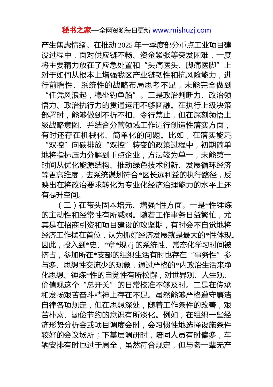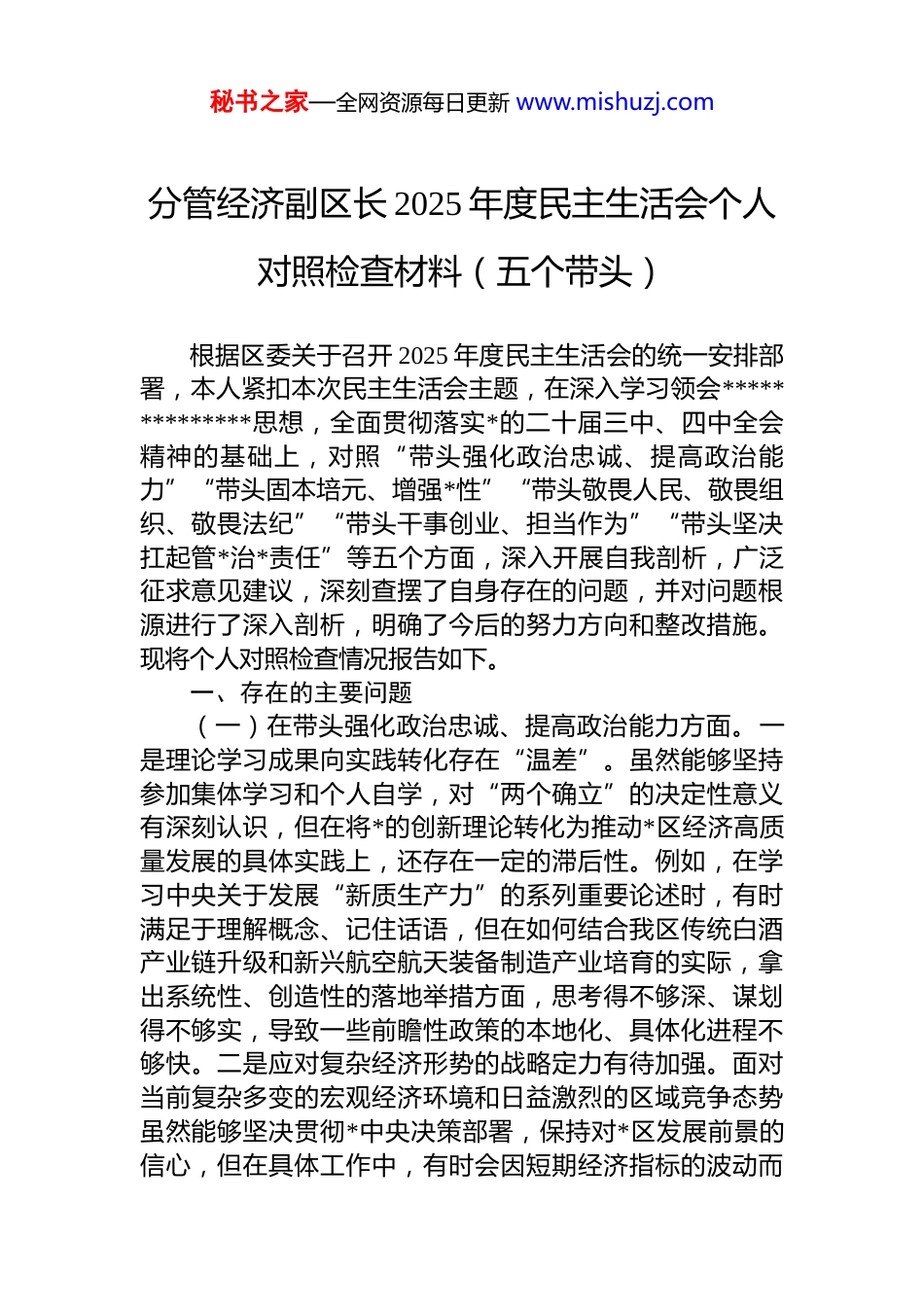 秘书之家—全网资源每日更新 www.mishuzj.com分管经济副区长 2025 年度民主生活会个人对照检查材料(五个带头)根据区委关于召开 2025 年度民主生活会的统一安排部署,本人紧扣本次民主生活会主题,在深入学习领会**************思想,全面贯彻落实*的二十届三中、四中全会精神的基础上,对照“带头强化政治忠诚、提高政治能力”“带头固本培元、增强*性”“带头敬畏人民、敬畏组织、敬畏法纪”“带头干事创业、担当作为”“带头坚决扛起管*治*责任”等五个方面,深入开展自我剖析,广泛征求意见建议,深刻查摆了自身存在的问题,并对问题根源进行了深入剖析,明确了今后的努力方向和整改措施。现将个人对照检查情况报告如下。一、存在的主要问题(一)在带头强化政治忠诚、提高政治能力方面。一是理论学习成果向实践转化存在“温差”。虽然能够坚持参加集体学习和个人自学,对“两个确立”的决定性意义有深刻认识,但在将*的创新理论转化为推动*区经济高质量发展的具体实践上,还存在一定的滞后性。例如,在学习中央关于发展“新质生产力”的系列重要论述时,有时满足于理解概念、记住话语,但在如何结合我区传统白酒产业链升级和新兴航空航天装备制造产业培育的实际,拿出系统性、创造性的落地举措方面,思考得不够深、谋划得不够实,导致一些前瞻性政策的本地化、具体化进程不够快。二是应对复杂经济形势的战略定力有待加强。面对当前复杂多变的宏观经济环境和日益激烈的区域竞争态势虽然能够坚决贯彻*中央决策部署,保持对*区发展前景的信心,但在具体工作中,有时会因短期经济指标的波动而秘书之家—全网资源每日更新 www.mishuzj.com产生焦虑情绪。在推动 2025 年一季度部分重点工业项目建设过程中,面对供应链不畅、资金紧张等突发困难,一度将主要精力放在了应急处置和“头痛医头、脚痛医脚”上对于如何从根本上增强我区产业链韧性和抗风险能力,进行前瞻性、系统性的战略布局思考不足,未能完全做到“任凭风浪起,稳坐钓鱼船”。三是政治判断力、政治领悟力、政治执行力的贯通运用不够圆融。在执行上级决策部署时,能够做到不折不扣、令行禁止,但在深刻领悟上级战略意图、并结合分管领域工作进行创造性落实方面,有时还存在机械化、简单化的问题。比如,在落实能耗“双控”向碳排放“双控”转变的政策过程中,初期简单地将指标压力分解到重点企业,方法较为单一,未能第一时间从优化能源结构、推动绿色技术创新、发展循环经济等更高维度,去系统谋划符合*区长远利益的执行路径,反映出在将政治要求转化为专业化经济治理能力的水平上还有提升空间。(二)在带头固本培元、增强*性方面。一是*性锤炼的主动性和经常性有所减弱。随着工作事务日益繁忙,尤其是在招商引资和项目建设的攻坚期,有时会不自觉地将经济工作摆在首位,认为抓好经济发展就是最大的*性体现。因此,投入到*史、*章*规 dj 的系统性、常态化学习时间被挤占,参加所在*支部的组织生活有时也存在“事务性”参与多、思想性交流少的现象,通过严格的*内政治生活来净化思想、锤炼*性的自觉性有所松懈,对世界观、人生观、价值观这个“总开关”的日常校准不够及时。二是在传承和发扬艰苦奋斗精神上存在不足。虽然能够严格遵守廉洁自律各项规定,但在思想深处,随着工作条件的改善,艰苦朴素、勤俭节约的意识有所淡化。例如,在组织一些经济形势分析会或项目调度会时,会习惯性地选择设施条件较好的会议场所;下基层调研时,陪同人员有时偏多,车辆安排有时也过于周全,虽然符合规定,但与老一辈无产秘书之家—全网资源每日更新 www.mishuzj.com阶级革命家那种“轻车简从、深入一线”的优良作风相比还是存在差距,反映出在思想上对享乐主义和奢靡之风的潜在侵蚀警惕性不够高。三是在为民情怀的践行上,有时未能完全做到“民之所忧,我必念之”。在工作中,虽然始终把为人民服务作为出发点和落脚点,但在处理一些涉及群众切身利益的经济问题时,有时会不自觉地更多从宏观经济数据、产业发展大局的角度去考量。比如,在推进一个老旧工业园区升级改造项目时,初期方案更侧重于土地集约利用效率和未来税...