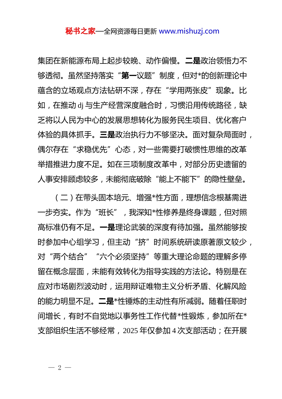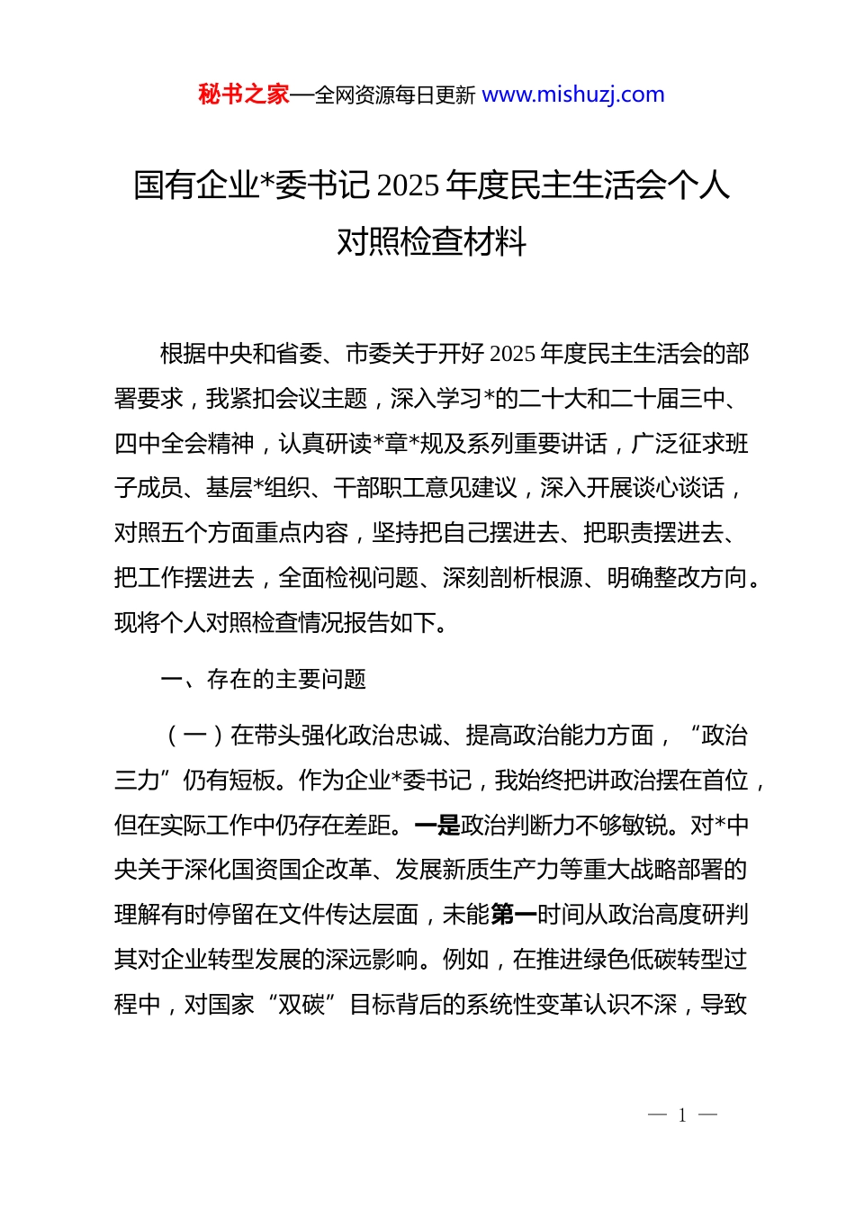 秘书之家—全网资源每日更新 www.mishuzj.com国有企业*委书记 2025 年度民主生活会个人对照检查材料根据中央和省委、市委关于开好 2025 年度民主生活会的部署要求,我紧扣会议主题,深入学习*的二十大和二十届三中、四中全会精神,认真研读*章*规及系列重要讲话,广泛征求班子成员、基层*组织、干部职工意见建议,深入开展谈心谈话,对照五个方面重点内容,坚持把自己摆进去、把职责摆进去、把工作摆进去,全面检视问题、深刻剖析根源、明确整改方向。现将个人对照检查情况报告如下。一、存在的主要问题(一)在带头强化政治忠诚、提高政治能力方面,“政治三力”仍有短板。作为企业*委书记,我始终把讲政治摆在首位,但在实际工作中仍存在差距。一是政治判断力不够敏锐。对*中央关于深化国资国企改革、发展新质生产力等重大战略部署的理解有时停留在文件传达层面,未能第一时间从政治高度研判其对企业转型发展的深远影响。例如,在推进绿色低碳转型过程中,对国家“双碳”目标背后的系统性变革认识不深,导致— 1 —秘书之家—全网资源每日更新 www.mishuzj.com集团在新能源布局上起步较晚、动作偏慢。二是政治领悟力不够透彻。虽然坚持落实“第一议题”制度,但对*的创新理论中蕴含的立场观点方法钻研不深,存在“学用两张皮”现象。比如,在推动 dj 与生产经营深度融合时,习惯沿用传统路径,缺乏将以人民为中心的发展思想转化为服务民生项目、优化客户体验的具体抓手。三是政治执行力不够坚决。面对复杂局面时,偶尔存在“求稳优先”心态,对一些需要打破惯性思维的改革举措推进力度不足。如在三项制度改革中,对部分历史遗留的人事安排顾虑较多,未能彻底破除“能上不能下”的隐性壁垒。(二)在带头固本培元、增强*性方面,理想信念根基需进一步夯实。作为“班长”,我深知*性修养是终身课题,但对照高标准仍有不足。一是理论武装的深度有待加强。虽然能够按时参加中心组学习,但主动“挤”时间系统研读原著原文较少,对“两个结合”“六个必须坚持”等重大理论命题的理解多停留在概念层面,未能有效转化为指导实践的方法论。特别是在应对市场剧烈波动时,运用辩证唯物主义分析矛盾、化解风险的能力明显不足。二是*性锤炼的主动性有所减弱。随着任职时间增长,有时不自觉地以事务性工作代替*性锻炼,参加所在*支部组织生活不够经常,2025 年仅参加 4 次支部活动;在开展— 2 —秘书之家—全网资源每日更新 www.mishuzj.com批评时,对班子成员存在的苗头性问题点到为止,怕影响团结,缺乏“红脸出汗”的勇气。三是宗旨意识在决策中体现不充分。在谋划企业发展战略时,更多关注营收、利润等硬指标,对职工群众关心的薪酬分配公平性、职业发展通道等问题研究不够深入。去年推进某子公司重组时,因前期调研不细,导致部分员工产生焦虑情绪,虽事后补救,但反映出“从群众中来、到群众中去”的工作方法有所弱化。(三)在带头敬畏人民、敬畏组织、敬畏法纪方面,纪律规矩意识需持续强化。作为*委书记,我始终强调“三个敬畏”,但在具体落实中仍有薄弱环节。一是服务人民的初心有所淡化。集团承担多项城市公共服务职能,但在解决群众急难愁盼问题上存在“重部署、轻问效”倾向。如智慧停车平台建设虽已立项,但因协调力度不够,至今未覆盖老旧小区密集区域,群众反映“叫好不叫座”。二是执行组织原则不够严格。在干部选拔任用中,有时过于倚重业务骨干,对其政治素质、道德品行的考察方式较为单一,主要依赖民主测评结果,缺乏深入细致的日常观察;在班子议事中,对个别临时动议事项未能坚决制止,存在“先讨论后补程序”的变通做法。三是廉洁风险防控存在盲区。对下属企业“一把手”监督手段有限,主要依靠听— 3 —秘书之家—全网资源每日更新 www.mishuzj.com取汇报、查看报表,未能有效嵌入业务流程开展穿透式监督。2025 年某子公司发生采购环节违规问题,暴露出我在压实“一岗双责”、推动监督下沉方面存在明显短板。(四)在带头干事创业、担当作为方面,攻坚克难锐气需进一步提振。面对新一轮国企改革深化提升行动,我深感责任重大,但对照“时时放心...