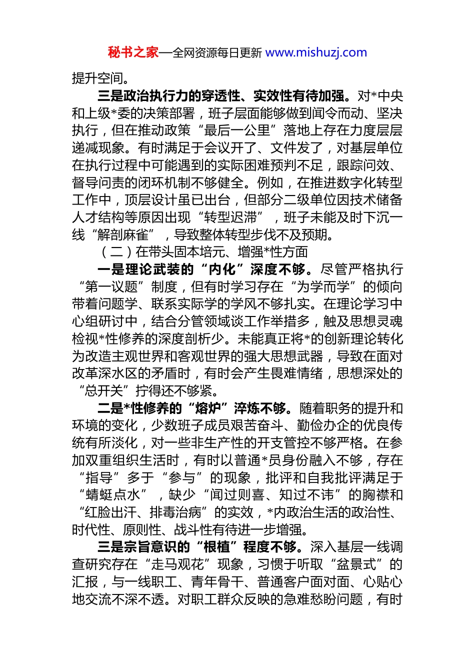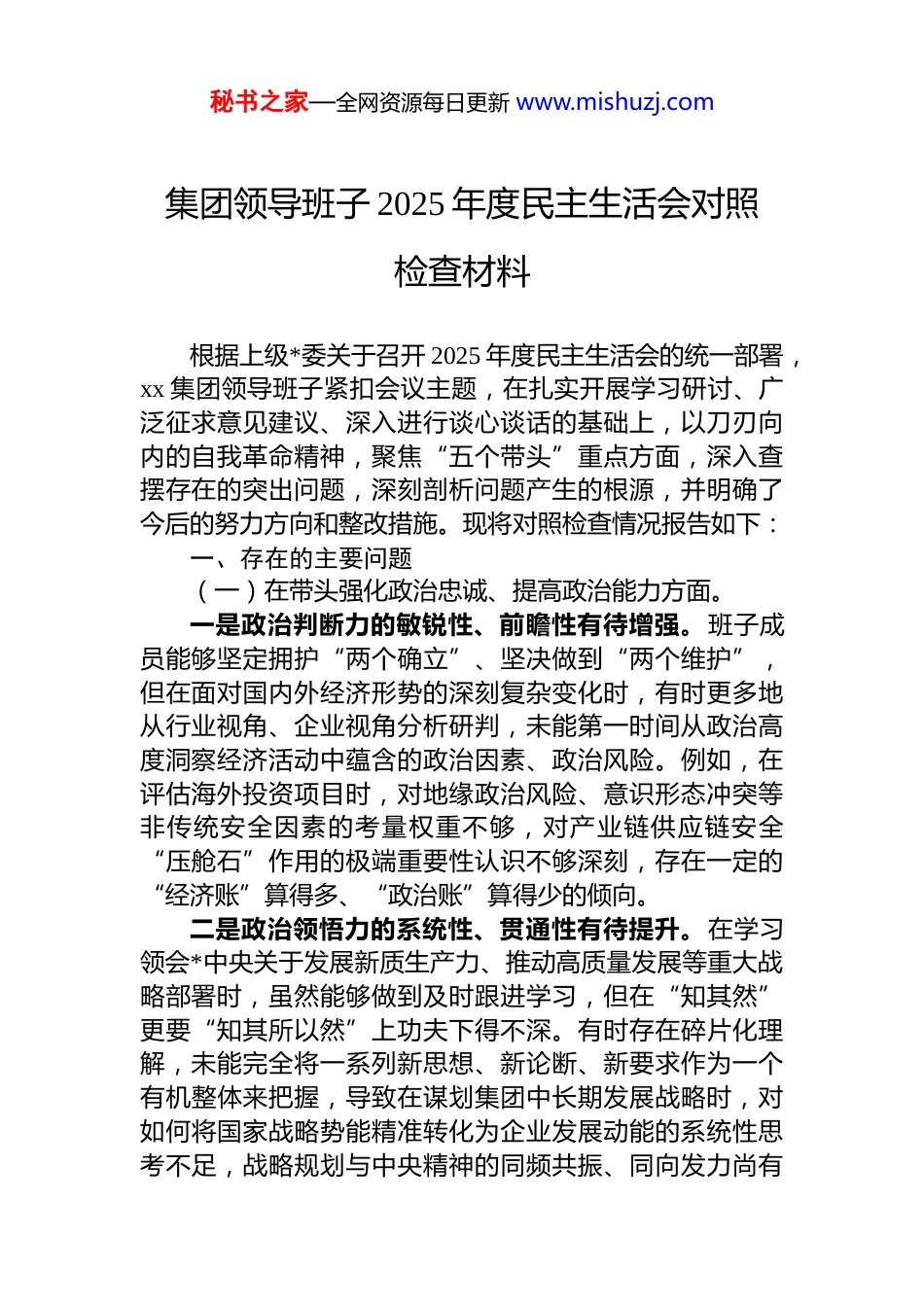 秘书之家—全网资源每日更新 www.mishuzj.com集团领导班子 2025 年度民主生活会对照检查材料根据上级*委关于召开 2025 年度民主生活会的统一部署,xx 集团领导班子紧扣会议主题,在扎实开展学习研讨、广泛征求意见建议、深入进行谈心谈话的基础上,以刀刃向内的自我革命精神,聚焦“五个带头”重点方面,深入查摆存在的突出问题,深刻剖析问题产生的根源,并明确了今后的努力方向和整改措施。现将对照检查情况报告如下:一、存在的主要问题(一)在带头强化政治忠诚、提高政治能力方面。一是政治判断力的敏锐性、前瞻性有待增强。班子成员能够坚定拥护“两个确立”、坚决做到“两个维护”,但在面对国内外经济形势的深刻复杂变化时,有时更多地从行业视角、企业视角分析研判,未能第一时间从政治高度洞察经济活动中蕴含的政治因素、政治风险。例如,在评估海外投资项目时,对地缘政治风险、意识形态冲突等非传统安全因素的考量权重不够,对产业链供应链安全“压舱石”作用的极端重要性认识不够深刻,存在一定的“经济账”算得多、“政治账”算得少的倾向。二是政治领悟力的系统性、贯通性有待提升。在学习领会*中央关于发展新质生产力、推动高质量发展等重大战略部署时,虽然能够做到及时跟进学习,但在“知其然”更要“知其所以然”上功夫下得不深。有时存在碎片化理解,未能完全将一系列新思想、新论断、新要求作为一个有机整体来把握,导致在谋划集团中长期发展战略时,对如何将国家战略势能精准转化为企业发展动能的系统性思考不足,战略规划与中央精神的同频共振、同向发力尚有秘书之家—全网资源每日更新 www.mishuzj.com提升空间。三是政治执行力的穿透性、实效性有待加强。对*中央和上级*委的决策部署,班子层面能够做到闻令而动、坚决执行,但在推动政策“最后一公里”落地上存在力度层层递减现象。有时满足于会议开了、文件发了,对基层单位在执行过程中可能遇到的实际困难预判不足,跟踪问效、督导问责的闭环机制不够健全。例如,在推进数字化转型工作中,顶层设计虽已出台,但部分二级单位因技术储备人才结构等原因出现“转型迟滞”,班子未能及时下沉一线“解剖麻雀”,导致整体转型步伐不及预期。(二)在带头固本培元、增强*性方面一是理论武装的“内化”深度不够。尽管严格执行“第一议题”制度,但有时学习存在“为学而学”的倾向带着问题学、联系实际学的学风不够扎实。在理论学习中心组研讨中,结合分管领域谈工作举措多,触及思想灵魂检视*性修养的深度剖析少。未能真正将*的创新理论转化为改造主观世界和客观世界的强大思想武器,导致在面对改革深水区的矛盾时,有时会产生畏难情绪,思想深处的“总开关”拧得还不够紧。二是*性修养的“熔炉”淬炼不够。随着职务的提升和环境的变化,少数班子成员艰苦奋斗、勤俭办企的优良传统有所淡化,对一些非生产性的开支管控不够严格。在参加双重组织生活时,有时以普通*员身份融入不够,存在“指导”多于“参与”的现象,批评和自我批评满足于“蜻蜓点水”,缺少“闻过则喜、知过不讳”的胸襟和“红脸出汗、排毒治病”的实效,*内政治生活的政治性、时代性、原则性、战斗性有待进一步增强。三是宗旨意识的“根植”程度不够。深入基层一线调查研究存在“走马观花”现象,习惯于听取“盆景式”的汇报,与一线职工、青年骨干、普通客户面对面、心贴心地交流不深不透。对职工群众反映的急难愁盼问题,有时秘书之家—全网资源每日更新 www.mishuzj.com批示转办多,亲自盯办、一抓到底少。例如,部分基层单位职工长期反映的职业发展通道狭窄、技能培训体系不健全等问题,虽有关注但未形成系统性解决方案,反映出我们以人民为中心的发展思想在企业治理中尚未得到全方位体现。(三)在带头敬畏人民、敬畏组织、敬畏法纪方面一是对权力来源的认识存在偏差。班子成员深知权力是*和人民赋予的,但在实际工作中,有时不自觉地将权力视为职务带来的“权威”,在决策过程中听取职工代表和工会组织意见不够充分、不够深入。在制定涉及职工切身利益的改革举措时,对政策的宣传解释工作做得不细,未能充分照顾到不同群体的利益关...