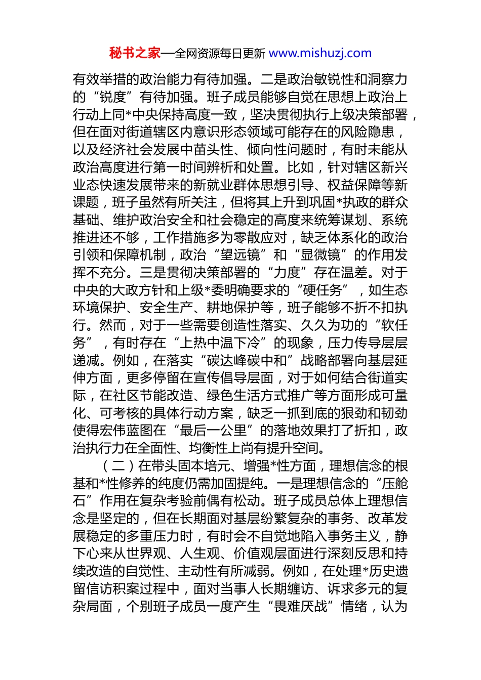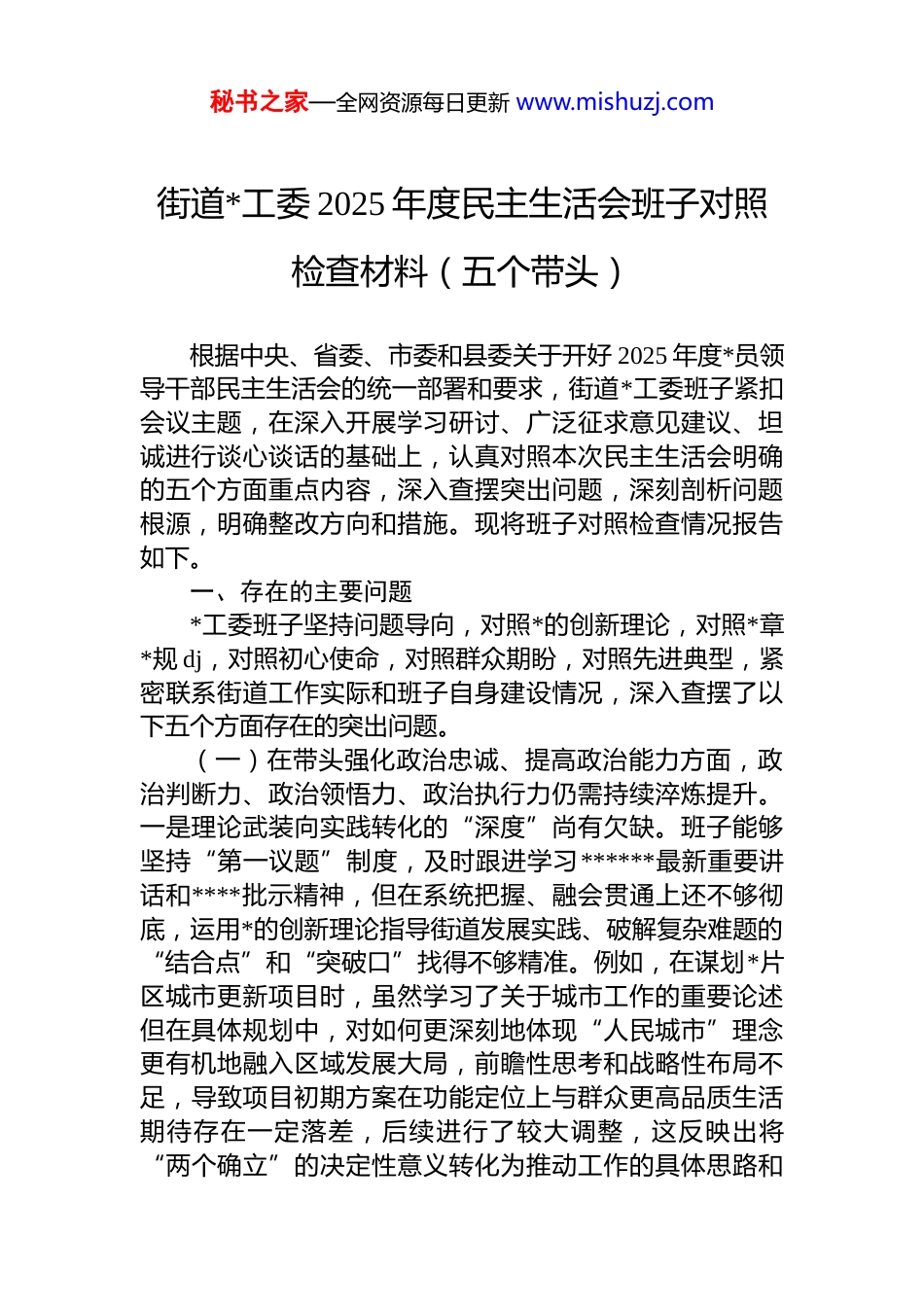 秘书之家—全网资源每日更新 www.mishuzj.com街道*工委 2025 年度民主生活会班子对照检查材料(五个带头)根据中央、省委、市委和县委关于开好 2025 年度*员领导干部民主生活会的统一部署和要求,街道*工委班子紧扣会议主题,在深入开展学习研讨、广泛征求意见建议、坦诚进行谈心谈话的基础上,认真对照本次民主生活会明确的五个方面重点内容,深入查摆突出问题,深刻剖析问题根源,明确整改方向和措施。现将班子对照检查情况报告如下。一、存在的主要问题*工委班子坚持问题导向,对照*的创新理论,对照*章*规 dj,对照初心使命,对照群众期盼,对照先进典型,紧密联系街道工作实际和班子自身建设情况,深入查摆了以下五个方面存在的突出问题。(一)在带头强化政治忠诚、提高政治能力方面,政治判断力、政治领悟力、政治执行力仍需持续淬炼提升。一是理论武装向实践转化的“深度”尚有欠缺。班子能够坚持“第一议题”制度,及时跟进学习******最新重要讲话和****批示精神,但在系统把握、融会贯通上还不够彻底,运用*的创新理论指导街道发展实践、破解复杂难题的“结合点”和“突破口”找得不够精准。例如,在谋划*片区城市更新项目时,虽然学习了关于城市工作的重要论述但在具体规划中,对如何更深刻地体现“人民城市”理念更有机地融入区域发展大局,前瞻性思考和战略性布局不足,导致项目初期方案在功能定位上与群众更高品质生活期待存在一定落差,后续进行了较大调整,这反映出将“两个确立”的决定性意义转化为推动工作的具体思路和秘书之家—全网资源每日更新 www.mishuzj.com有效举措的政治能力有待加强。二是政治敏锐性和洞察力的“锐度”有待加强。班子成员能够自觉在思想上政治上行动上同*中央保持高度一致,坚决贯彻执行上级决策部署,但在面对街道辖区内意识形态领域可能存在的风险隐患,以及经济社会发展中苗头性、倾向性问题时,有时未能从政治高度进行第一时间辨析和处置。比如,针对辖区新兴业态快速发展带来的新就业群体思想引导、权益保障等新课题,班子虽然有所关注,但将其上升到巩固*执政的群众基础、维护政治安全和社会稳定的高度来统筹谋划、系统推进还不够,工作措施多为零散应对,缺乏体系化的政治引领和保障机制,政治“望远镜”和“显微镜”的作用发挥不充分。三是贯彻决策部署的“力度”存在温差。对于中央的大政方针和上级*委明确要求的“硬任务”,如生态环境保护、安全生产、耕地保护等,班子能够不折不扣执行。然而,对于一些需要创造性落实、久久为功的“软任务”,有时存在“上热中温下冷”的现象,压力传导层层递减。例如,在落实“碳达峰碳中和”战略部署向基层延伸方面,更多停留在宣传倡导层面,对于如何结合街道实际,在社区节能改造、绿色生活方式推广等方面形成可量化、可考核的具体行动方案,缺乏一抓到底的狠劲和韧劲使得宏伟蓝图在“最后一公里”的落地效果打了折扣,政治执行力在全面性、均衡性上尚有提升空间。(二)在带头固本培元、增强*性方面,理想信念的根基和*性修养的纯度仍需加固提纯。一是理想信念的“压舱石”作用在复杂考验前偶有松动。班子成员总体上理想信念是坚定的,但在长期面对基层纷繁复杂的事务、改革发展稳定的多重压力时,有时会不自觉地陷入事务主义,静下心来从世界观、人生观、价值观层面进行深刻反思和持续改造的自觉性、主动性有所减弱。例如,在处理*历史遗留信访积案过程中,面对当事人长期缠访、诉求多元的复杂局面,个别班子成员一度产生“畏难厌战”情绪,认为秘书之家—全网资源每日更新 www.mishuzj.com这是历史原因造成,难以彻底解决,思想上出现了“绕道走”的苗头,未能始终秉持“人民至上”的初心和“事不避难”的*性原则去全力攻坚,这本质上是理想信念在具体矛盾挑战面前的“钝化”。二是*性锻炼的“大熔炉”温度时高时低。班子成员能够参加组织生活,但有时将民主生活会、组织生活会等同于一般工作会议,批评和自我批评的“辣味”不足,尤其是在相互批评时,“好人主义”思想仍有市场,怕伤和气、怕影响团结,点问题往往隔靴搔痒,未能真正达到“红脸出汗、排毒治病”的效果。在...