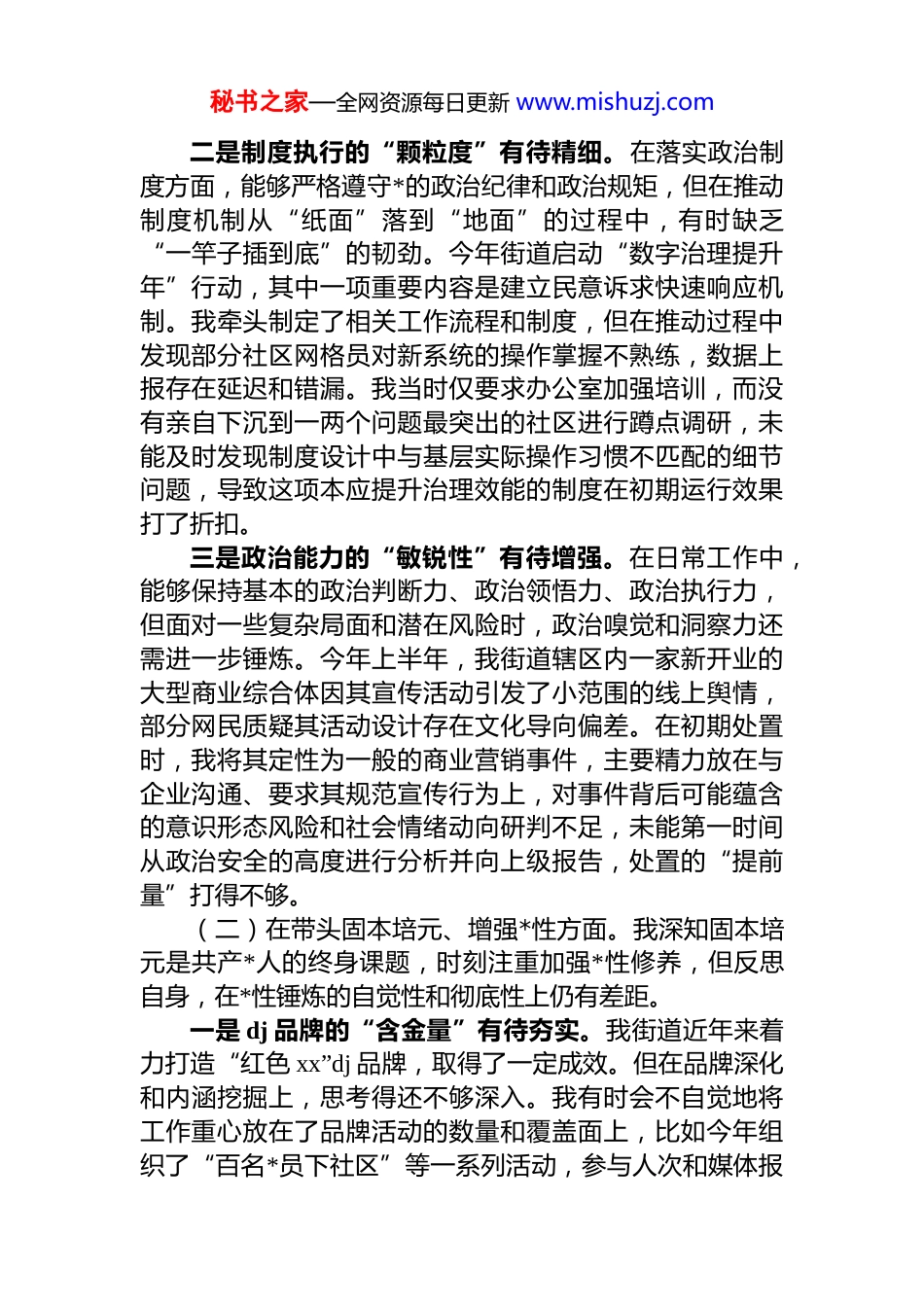 秘书之家—全网资源每日更新 www.mishuzj.com街道*工委副书记 2025 年度民主生活会对照检查材料(六个带头)根据区委关于召开 2025 年度民主生活会的统一部署和要求,我在深入学习*的二十大和二十届四中全会精神,认真领会******系列重要讲话精神,并广泛征求意见、深入开展谈心谈话的基础上,紧扣本次民主生活会主题,严格对照“六个带头”方面内容,紧密联系个人思想、学习和工作实际,进行了深刻的*性分析和自我剖析,深入查摆了自身存在的问题,剖析了问题产生的根源,并明确了今后的努力方向和整改措施。现将个人对照检查情况报告如下。一、存在的主要问题(一)在带头强化政治忠-诚、提高政治能力方面。作为*工委副书记,我始终将旗帜鲜明讲政治作为第一要求,但在对标对表、从严从实的要求下,仍发现自身存在一些不足和差距。一是理论武装的“转化率”有待提升。在理论学习上,虽然能够跟进学习**************思想和*的最新理论成果,特别是对*的二十届四中全会精神进行了系统学习,但有时满足于“学过了”“记下了”,在“消化、吸收、转化”上下的功夫还不够深。例如,在主持*工委理论学习中心组学习*的二十届四中全会精神关于“完善*中央重大决策部署落实机制”的专题研讨时,我更多地是传达了上级文件精神和通用解读,对于如何结合我街道老旧小区改造资金筹措难、跨部门协调多等具体实际,构建一个闭环式、可追溯的决策落实机制,未能组织进行更具针对性的深入研讨,导致学习成果与街道中心工作的结合度不够紧密,理论指导实践的效能未能完全发挥。秘书之家—全网资源每日更新 www.mishuzj.com二是制度执行的“颗粒度”有待精细。在落实政治制度方面,能够严格遵守*的政治纪律和政治规矩,但在推动制度机制从“纸面”落到“地面”的过程中,有时缺乏“一竿子插到底”的韧劲。今年街道启动“数字治理提升年”行动,其中一项重要内容是建立民意诉求快速响应机制。我牵头制定了相关工作流程和制度,但在推动过程中发现部分社区网格员对新系统的操作掌握不熟练,数据上报存在延迟和错漏。我当时仅要求办公室加强培训,而没有亲自下沉到一两个问题最突出的社区进行蹲点调研,未能及时发现制度设计中与基层实际操作习惯不匹配的细节问题,导致这项本应提升治理效能的制度在初期运行效果打了折扣。三是政治能力的“敏锐性”有待增强。在日常工作中,能够保持基本的政治判断力、政治领悟力、政治执行力,但面对一些复杂局面和潜在风险时,政治嗅觉和洞察力还需进一步锤炼。今年上半年,我街道辖区内一家新开业的大型商业综合体因其宣传活动引发了小范围的线上舆情,部分网民质疑其活动设计存在文化导向偏差。在初期处置时,我将其定性为一般的商业营销事件,主要精力放在与企业沟通、要求其规范宣传行为上,对事件背后可能蕴含的意识形态风险和社会情绪动向研判不足,未能第一时间从政治安全的高度进行分析并向上级报告,处置的“提前量”打得不够。(二)在带头固本培元、增强*性方面。我深知固本培元是共产*人的终身课题,时刻注重加强*性修养,但反思自身,在*性锤炼的自觉性和彻底性上仍有差距。一是 dj 品牌的“含金量”有待夯实。我街道近年来着力打造“红色 xx”dj 品牌,取得了一定成效。但在品牌深化和内涵挖掘上,思考得还不够深入。我有时会不自觉地将工作重心放在了品牌活动的数量和覆盖面上,比如今年组织了“百名*员下社区”等一系列活动,参与人次和媒体报秘书之家—全网资源每日更新 www.mishuzj.com道数量都很好看。然而,对于活动是否真正触及*员思想深处,是否有效提升了*员在群众中的先锋模范形象,缺乏一套科学、量化的评估体系。年底复盘时发现,部分参与活动的年轻*员反映,活动形式较为传统,未能充分激发他们的参与感和认同感,说明我在推动 dj 品牌建设上存在重形式、轻实效的倾向。二是组织建设的“覆盖面”有待拓展。面对城市基层dj 的新形势新任务,尤其是在新兴领域的*组织建设上,主动作为的意识和力度还不够。例如,我街道新就业形态劳动者数量逐年增多,我们虽然成立了外卖配送行业流动*支部,但后续工作中,我主要委托组织部门跟...