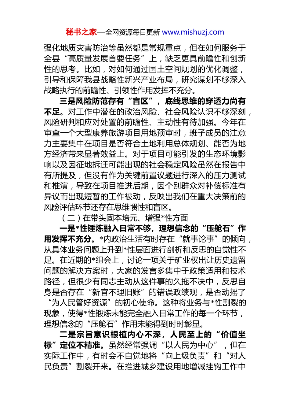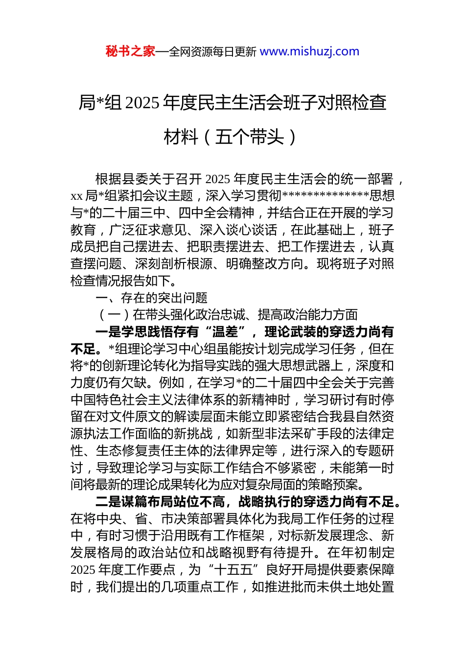 秘书之家—全网资源每日更新 www.mishuzj.com局*组 2025 年度民主生活会班子对照检查材料(五个带头)根据县委关于召开 2025 年度民主生活会的统一部署,xx 局*组紧扣会议主题,深入学习贯彻**************思想与*的二十届三中、四中全会精神,并结合正在开展的学习教育,广泛征求意见、深入谈心谈话,在此基础上,班子成员把自己摆进去、把职责摆进去、把工作摆进去,认真查摆问题、深刻剖析根源、明确整改方向。现将班子对照检查情况报告如下。一、存在的突出问题(一)在带头强化政治忠诚、提高政治能力方面一是学思践悟存有“温差”,理论武装的穿透力尚有不足。*组理论学习中心组虽能按计划完成学习任务,但在将*的创新理论转化为指导实践的强大思想武器上,深度和力度仍有欠缺。例如,在学习*的二十届四中全会关于完善中国特色社会主义法律体系的新精神时,学习研讨有时停留在对文件原文的解读层面未能立即紧密结合我县自然资源执法工作面临的新挑战,如新型非法采矿手段的法律定性、生态修复责任主体的法律界定等,进行深入的专题研讨,导致理论学习与实际工作结合不够紧密,未能第一时间将最新的理论成果转化为应对复杂局面的策略预案。二是谋篇布局站位不高,战略执行的穿透力尚有不足。在将中央、省、市决策部署具体化为我局工作任务的过程中,有时习惯于沿用既有工作框架,对标新发展理念、新发展格局的政治站位和战略视野有待提升。在年初制定2025 年度工作要点,为“十五五”良好开局提供要素保障时,我们提出的几项重点工作,如推进批而未供土地处置秘书之家—全网资源每日更新 www.mishuzj.com强化地质灾害防治等虽然都是常规重点,但在如何服务于全县“高质量发展首要任务”上,缺乏更具前瞻性和创新性的思考。比如,对如何通过国土空间规划的优化调整,引导和保障我县战略性新兴产业布局,研究谋划不够深入战略执行的前瞻性、引领性作用发挥不充分。三是风险防范存有“盲区”,底线思维的穿透力尚有不足。对工作中潜在的政治风险、社会风险认识不够深刻,风险研判和应对处置的前瞻性、主动性有待加强。今年在审查一个大型康养旅游项目用地预审时,班子成员的注意力主要集中在项目是否符合土地利用总体规划、能否为地方经济带来显著效益上。对于项目可能引发的生态环境影响以及因征地拆迁可能出现的社会稳定风险虽然在报告中有所提及,但没有作为关键前置议题进行深入的压力测试和推演,导致在项目推进后期,因个别群众对补偿标准有异议而出现短暂的工作被动,反映出我们在重大决策前的风险评估环节还存在思维惯性和盲区。(二)在带头固本培元、增强*性方面一是*性锤炼融入日常不够,理想信念的“压舱石”作用发挥不充分。*内政治生活有时存在“就事论事”的倾向,从具体业务问题上升到*性层面进行剖析和反思的自觉性不足。在近期的*组会上,讨论一项关于矿业权出让历史遗留问题的解决方案时,大家的发言多集中于政策适用和技术路径,但很少有同志主动从这件事的久拖不决中,反思自身是否存在“新官不理旧账”的错误政绩观,是否动摇了“为人民管好资源”的初心使命。这种将业务与*性割裂的现象,使得*性锻炼未能完全融入日常工作的每一个环节,理想信念的“压舱石”作用未能得到时时彰显。二是宗旨意识根植内心不深,人民至上的“价值坐标”定位不精准。虽然经常强调“以人民为中心”,但在实际工作中,有时会不自觉地将“向上级负责”和“对人民负责”割裂开来。在推进城乡建设用地增减挂钩工作中秘书之家—全网资源每日更新 www.mishuzj.com我们更关注项目进度、指标完成情况等上级考核的硬指标对于拆旧区群众的后续生计、新社区的融入情况等“软指标”,虽然也开展了工作,但投入的精力与情感深度明显不足。例如,个别项目区的群众反映,搬迁后就业渠道变窄,*组在了解到情况后,仅仅是按常规将其转交相关部门,缺乏主动跨前一步、多方协调,为群众解决实际困难的“婆婆嘴”和“跑断腿”精神。三是纪律规矩校准言行不严,自我革命的“思想利剑”锋利度不足。在执行 d 的纪律规矩上,有时存在“抓大放小”的倾向,对一些“小毛病”“微问题”提醒不...