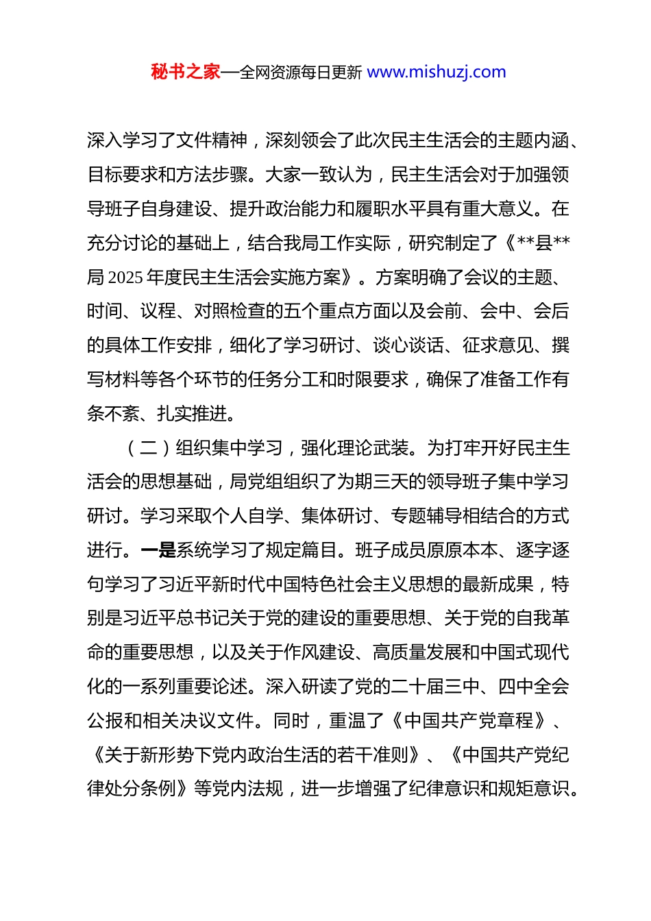 秘书之家—全网资源每日更新 www.mishuzj.com局党组 2025 年度民主生活会情况的报告 根据县委的统一部署和相关文件精神,**县**局党组于2026 年 12 月 31 日召开了 2025 年度民主生活会。会议紧扣“深入学习贯彻习近平新时代中国特色社会主义思想,全面贯彻落实党的二十届三中、四中全会精神,深入贯彻落实习近平总书记重要讲话和重要指示批示精神,以打攻坚战、持久战的决心和恒心,锲而不舍落实中央八项规定精神,推进作风建设常态化长效化,以优良作风凝心聚力、真抓实干,聚焦高质量发展首要任务,扎实推进中国式现代化,为实现‘十五五’良好开局奠定坚实基础”这一主题,严肃认真地开展了批评和自我批评,明确了整改方向和措施。现将具体情况报告如下。一、周密部署精心筹备,筑牢思想理论根基局党组对开好此次民主生活会高度重视,将其作为一次深刻的党性锻炼和政治体检,严格按照上级要求,扎实细致地做好各项会前准备工作,为会议的高质量召开奠定了坚实基础。(一)深化思想认识,制定周详方案。局党组在收到县委组织部、县纪委监委联合下发的《关于开好 2025 年度党员领导干部民主生活会的通知》后,第一时间召开党组会议进行专题学习和研究部署。会议由党组书记**同志主持,全体班子成员秘书之家—全网资源每日更新 www.mishuzj.com深入学习了文件精神,深刻领会了此次民主生活会的主题内涵、目标要求和方法步骤。大家一致认为,民主生活会对于加强领导班子自身建设、提升政治能力和履职水平具有重大意义。在充分讨论的基础上,结合我局工作实际,研究制定了《**县**局 2025 年度民主生活会实施方案》。方案明确了会议的主题、时间、议程、对照检查的五个重点方面以及会前、会中、会后的具体工作安排,细化了学习研讨、谈心谈话、征求意见、撰写材料等各个环节的任务分工和时限要求,确保了准备工作有条不紊、扎实推进。(二)组织集中学习,强化理论武装。为打牢开好民主生活会的思想基础,局党组组织了为期三天的领导班子集中学习研讨。学习采取个人自学、集体研讨、专题辅导相结合的方式进行。一是系统学习了规定篇目。班子成员原原本本、逐字逐句学习了习近平新时代中国特色社会主义思想的最新成果,特别是习近平总书记关于党的建设的重要思想、关于党的自我革命的重要思想,以及关于作风建设、高质量发展和中国式现代化的一系列重要论述。深入研读了党的二十届三中、四中全会公报和相关决议文件。同时,重温了《中国共产党章程》、《关于新形势下党内政治生活的若干准则》、《中国共产党纪律处分条例》等党内法规,进一步增强了纪律意识和规矩意识。秘书之家—全网资源每日更新 www.mishuzj.com二是深入开展专题研讨。围绕民主生活会主题,班子成员结合**工作的实际,就“如何以自我革命精神推进作风建设常态化长效化”、“如何完整准确全面贯彻新发展理念,服务保障全县高质量发展大局”、“如何践行正确政绩观,为‘十五五’良好开局贡献力量”等议题展开了热烈讨论和深入交流。通过研讨,大家进一步统一了思想、深化了认识,增强了贯彻落实党中央决策部署及省、市、县委工作要求的政治自觉、思想自觉和行动自觉。三是扎实开展警示教育。为深刻汲取教训,筑牢拒腐防变的思想防线,局党组组织班子成员集中观看了省纪委监委制作的警示教育片《歧路上的沉沦》,并就近期省内外通报的违反中央八项规定精神、形式主义官僚主义等典型案例进行了深入剖析和反思。党组书记**同志以案说纪、以案说法,要求班子成员深刻反思案例暴露出的理想信念滑坡、党性原则不强、纪法观念淡薄等问题,把自己摆进去、把职责摆进去、把工作摆进去,举一反三,引以为戒,时刻保持清醒和警惕,永葆共产党人清正廉廉洁的政治本色。(三)广泛征求意见,深入谈心谈话。为了把问题找准、找实、找全,局党组坚持开门纳谏,通过多种渠道广泛征求意见建议。一是书面征求。向县直各单位、各乡镇以及我局服务的重点对象发放征求意见函 60 余份。二是座谈访谈。组织召开秘书之家—全网资源每日更新 www.mishuzj.com了服务对象代表、退休老干部、本单位干部职工等 3 个层面的...