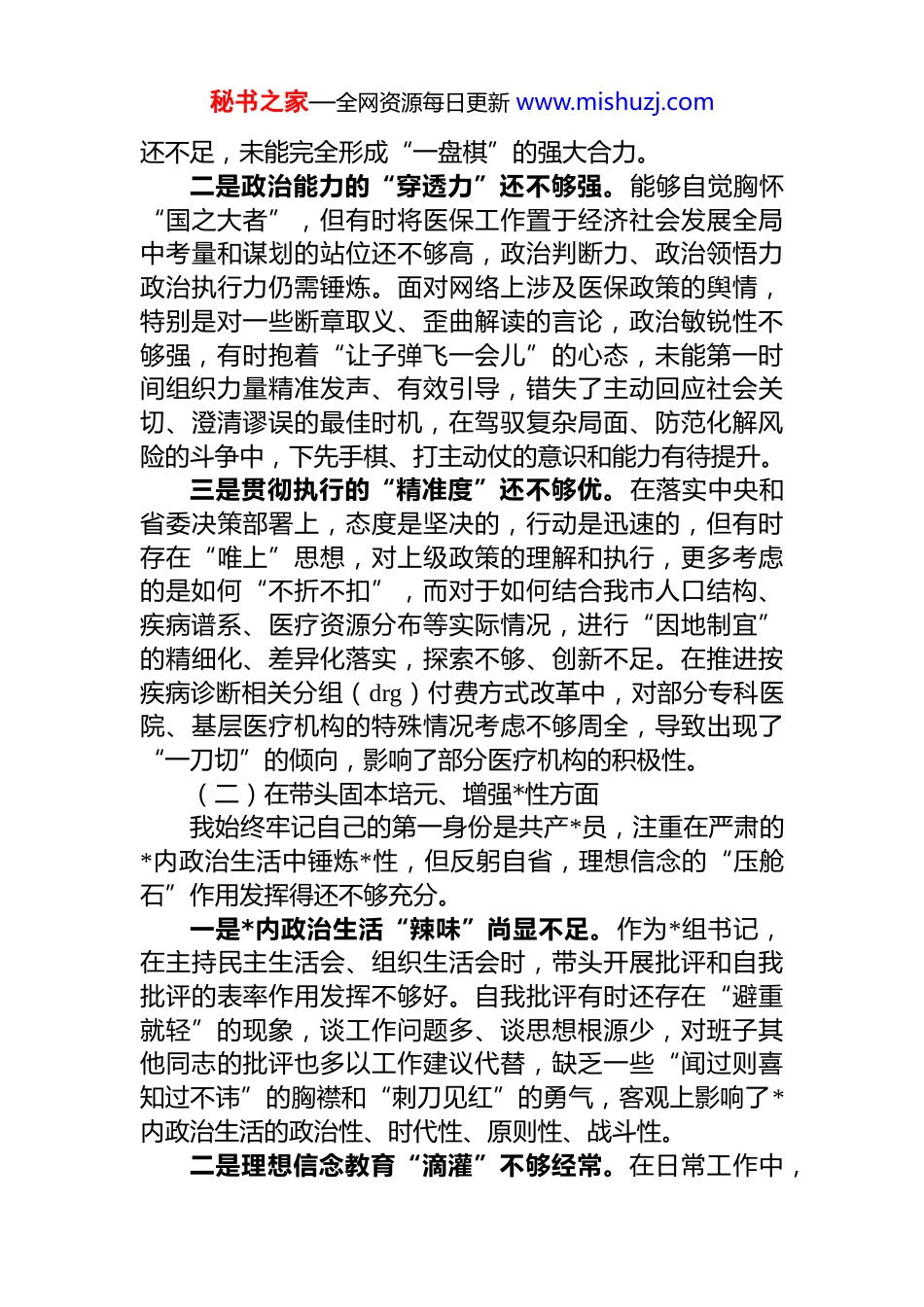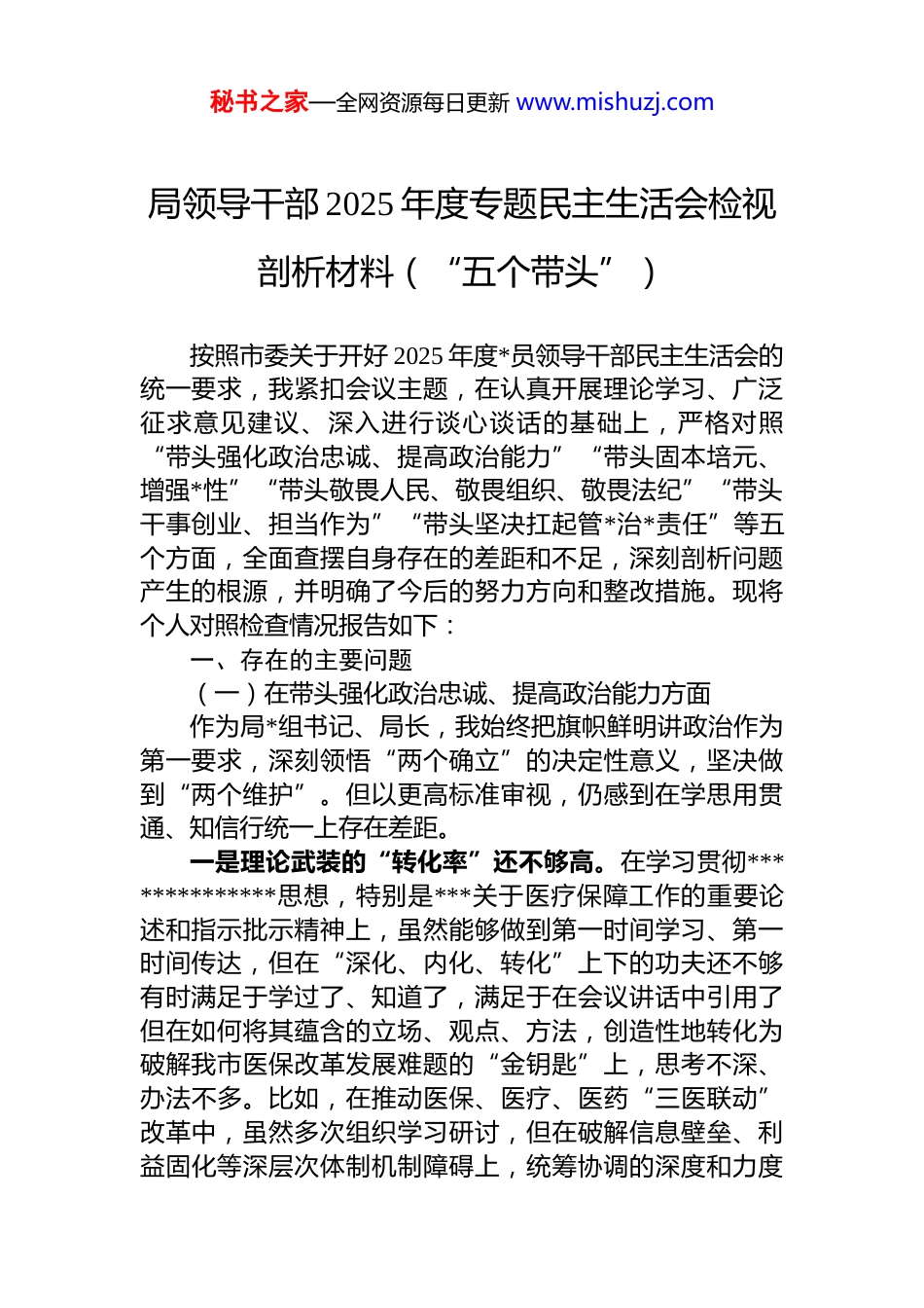 秘书之家—全网资源每日更新 www.mishuzj.com局领导干部 2025 年度专题民主生活会检视剖析材料(“五个带头”)按照市委关于开好 2025 年度*员领导干部民主生活会的统一要求,我紧扣会议主题,在认真开展理论学习、广泛征求意见建议、深入进行谈心谈话的基础上,严格对照“带头强化政治忠诚、提高政治能力”“带头固本培元、增强*性”“带头敬畏人民、敬畏组织、敬畏法纪”“带头干事创业、担当作为”“带头坚决扛起管*治*责任”等五个方面,全面查摆自身存在的差距和不足,深刻剖析问题产生的根源,并明确了今后的努力方向和整改措施。现将个人对照检查情况报告如下:一、存在的主要问题(一)在带头强化政治忠诚、提高政治能力方面作为局*组书记、局长,我始终把旗帜鲜明讲政治作为第一要求,深刻领悟“两个确立”的决定性意义,坚决做到“两个维护”。但以更高标准审视,仍感到在学思用贯通、知信行统一上存在差距。一是理论武装的“转化率”还不够高。在学习贯彻**************思想,特别是***关于医疗保障工作的重要论述和指示批示精神上,虽然能够做到第一时间学习、第一时间传达,但在“深化、内化、转化”上下的功夫还不够有时满足于学过了、知道了,满足于在会议讲话中引用了但在如何将其蕴含的立场、观点、方法,创造性地转化为破解我市医保改革发展难题的“金钥匙”上,思考不深、办法不多。比如,在推动医保、医疗、医药“三医联动”改革中,虽然多次组织学习研讨,但在破解信息壁垒、利益固化等深层次体制机制障碍上,统筹协调的深度和力度秘书之家—全网资源每日更新 www.mishuzj.com还不足,未能完全形成“一盘棋”的强大合力。二是政治能力的“穿透力”还不够强。能够自觉胸怀“国之大者”,但有时将医保工作置于经济社会发展全局中考量和谋划的站位还不够高,政治判断力、政治领悟力政治执行力仍需锤炼。面对网络上涉及医保政策的舆情,特别是对一些断章取义、歪曲解读的言论,政治敏锐性不够强,有时抱着“让子弹飞一会儿”的心态,未能第一时间组织力量精准发声、有效引导,错失了主动回应社会关切、澄清谬误的最佳时机,在驾驭复杂局面、防范化解风险的斗争中,下先手棋、打主动仗的意识和能力有待提升。三是贯彻执行的“精准度”还不够优。在落实中央和省委决策部署上,态度是坚决的,行动是迅速的,但有时存在“唯上”思想,对上级政策的理解和执行,更多考虑的是如何“不折不扣”,而对于如何结合我市人口结构、疾病谱系、医疗资源分布等实际情况,进行“因地制宜”的精细化、差异化落实,探索不够、创新不足。在推进按疾病诊断相关分组(drg)付费方式改革中,对部分专科医院、基层医疗机构的特殊情况考虑不够周全,导致出现了“一刀切”的倾向,影响了部分医疗机构的积极性。(二)在带头固本培元、增强*性方面我始终牢记自己的第一身份是共产*员,注重在严肃的*内政治生活中锤炼*性,但反躬自省,理想信念的“压舱石”作用发挥得还不够充分。一是*内政治生活“辣味”尚显不足。作为*组书记,在主持民主生活会、组织生活会时,带头开展批评和自我批评的表率作用发挥不够好。自我批评有时还存在“避重就轻”的现象,谈工作问题多、谈思想根源少,对班子其他同志的批评也多以工作建议代替,缺乏一些“闻过则喜知过不讳”的胸襟和“刺刀见红”的勇气,客观上影响了*内政治生活的政治性、时代性、原则性、战斗性。二是理想信念教育“滴灌”不够经常。在日常工作中,秘书之家—全网资源每日更新 www.mishuzj.com投入大量精力抓医保基金监管、药品集中采购等具体业务静下心来补精神之“钙”、固思想之“元”的时间相对较少。面对医保基金收支平衡的巨大压力、与医药企业谈判的艰难博弈,偶尔会产生畏难发愁的情绪,艰苦奋斗、攻坚克难的革命精神和斗争意志有所弱化。在对*员干部的教育中,讲政策、讲业务多,讲*的奋斗史、讲革命先辈的崇高精神少,理想信念教育未能真正做到春风化雨、润物无声。三是*员先锋作用“引领”不够突出。在日常工作中,对自己的要求有时等同于一般*员干部,先锋模范的标杆作用树得不够高。在一些急难险重任务面前,虽然能够靠...
