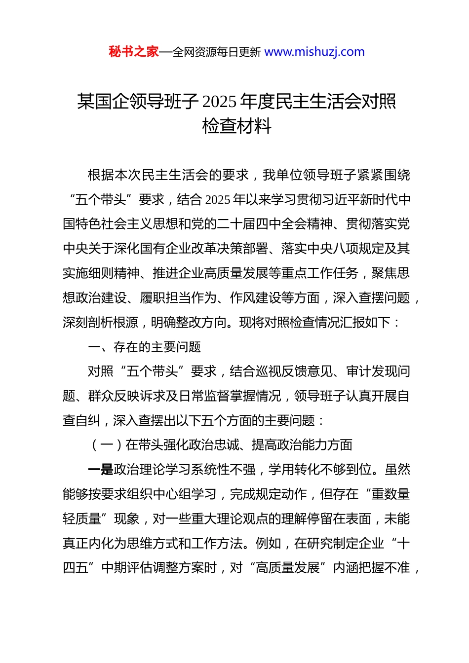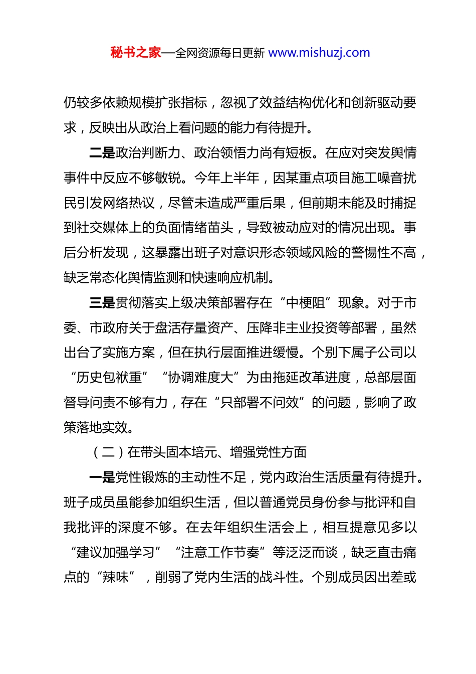 秘书之家—全网资源每日更新 www.mishuzj.com某国企领导班子 2025 年度民主生活会对照检查材料 根据本次民主生活会的要求,我单位领导班子紧紧围绕“五个带头”要求,结合 2025 年以来学习贯彻习近平新时代中国特色社会主义思想和党的二十届四中全会精神、贯彻落实党中央关于深化国有企业改革决策部署、落实中央八项规定及其实施细则精神、推进企业高质量发展等重点工作任务,聚焦思想政治建设、履职担当作为、作风建设等方面,深入查摆问题,深刻剖析根源,明确整改方向。现将对照检查情况汇报如下:一、存在的主要问题对照“五个带头”要求,结合巡视反馈意见、审计发现问题、群众反映诉求及日常监督掌握情况,领导班子认真开展自查自纠,深入查摆出以下五个方面的主要问题:(一)在带头强化政治忠诚、提高政治能力方面一是政治理论学习系统性不强,学用转化不够到位。虽然能够按要求组织中心组学习,完成规定动作,但存在“重数量轻质量”现象,对一些重大理论观点的理解停留在表面,未能真正内化为思维方式和工作方法。例如,在研究制定企业“十四五”中期评估调整方案时,对“高质量发展”内涵把握不准,秘书之家—全网资源每日更新 www.mishuzj.com仍较多依赖规模扩张指标,忽视了效益结构优化和创新驱动要求,反映出从政治上看问题的能力有待提升。二是政治判断力、政治领悟力尚有短板。在应对突发舆情事件中反应不够敏锐。今年上半年,因某重点项目施工噪音扰民引发网络热议,尽管未造成严重后果,但前期未能及时捕捉到社交媒体上的负面情绪苗头,导致被动应对的情况出现。事后分析发现,这暴露出班子对意识形态领域风险的警惕性不高,缺乏常态化舆情监测和快速响应机制。三是贯彻落实上级决策部署存在“中梗阻”现象。对于市委、市政府关于盘活存量资产、压降非主业投资等部署,虽然出台了实施方案,但在执行层面推进缓慢。个别下属子公司以“历史包袱重”“协调难度大”为由拖延改革进度,总部层面督导问责不够有力,存在“只部署不问效”的问题,影响了政策落地实效。(二)在带头固本培元、增强党性方面一是党性锻炼的主动性不足,党内政治生活质量有待提升。班子成员虽能参加组织生活,但以普通党员身份参与批评和自我批评的深度不够。在去年组织生活会上,相互提意见多以“建议加强学习”“注意工作节奏”等泛泛而谈,缺乏直击痛点的“辣味”,削弱了党内生活的战斗性。个别成员因出差或秘书之家—全网资源每日更新 www.mishuzj.com会议冲突全年缺席支部活动达 4 次以上,示范作用发挥不充分。二是理想信念根基需进一步夯实。面对企业经营压力加大、绩效考核趋严的现实,个别班子成员出现“重业绩轻党建”“怕出错少干事”的消极心态。如在推动一项技术改造项目时,因担心短期内影响利润指标,迟迟未予立项,实质上是担当精神弱化的表现。说明在处理短期利益与长远发展关系上,党性原则坚守还不够坚定。三是宗旨意识树得不牢,服务基层一线不够扎实。虽然建立了领导班子联系点制度,但调研存在“走流程”倾向。一次赴子公司调研安全生产工作,行程安排紧凑,主要听取管理层汇报,未深入车间班组与一线员工面对面交流,未能发现个别岗位存在疲劳作业隐患。反映出“从群众中来、到群众中去”的工作方法践行不到位。(三)在带头敬畏人民、敬畏组织、敬畏法纪方面一是对职工群众关切回应不够及时有效。近年来公司推进薪酬制度改革,总体方向正确,但在具体操作中对部分老员工心理落差关注不够,沟通解释工作不细致,导致个别单位出现匿名信反映“同工不同酬”问题。虽经查证不属实,但也暴露出我们在涉及职工切身利益事项上,民主协商程序执行不到位,群众工作精细化程度不高。秘书之家—全网资源每日更新 www.mishuzj.com二是在组织纪律执行上存在“好人主义”倾向。对于个别中层干部长期不在岗、兼职取酬等问题,虽掌握线索但处理迟缓,顾虑过多,担心影响队伍稳定的状况。直到上级纪委提醒后才启动核查程序,反映出对组织纪律的敬畏意识有所淡化,执纪刚性不足。三是依法合规经营意识有待强化。在某工程项目招投标过程中,为加快进度,曾允许一家关联单...