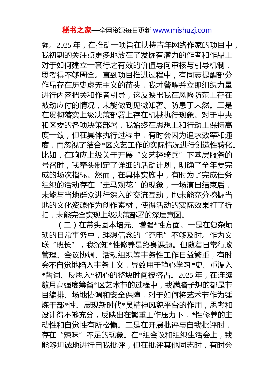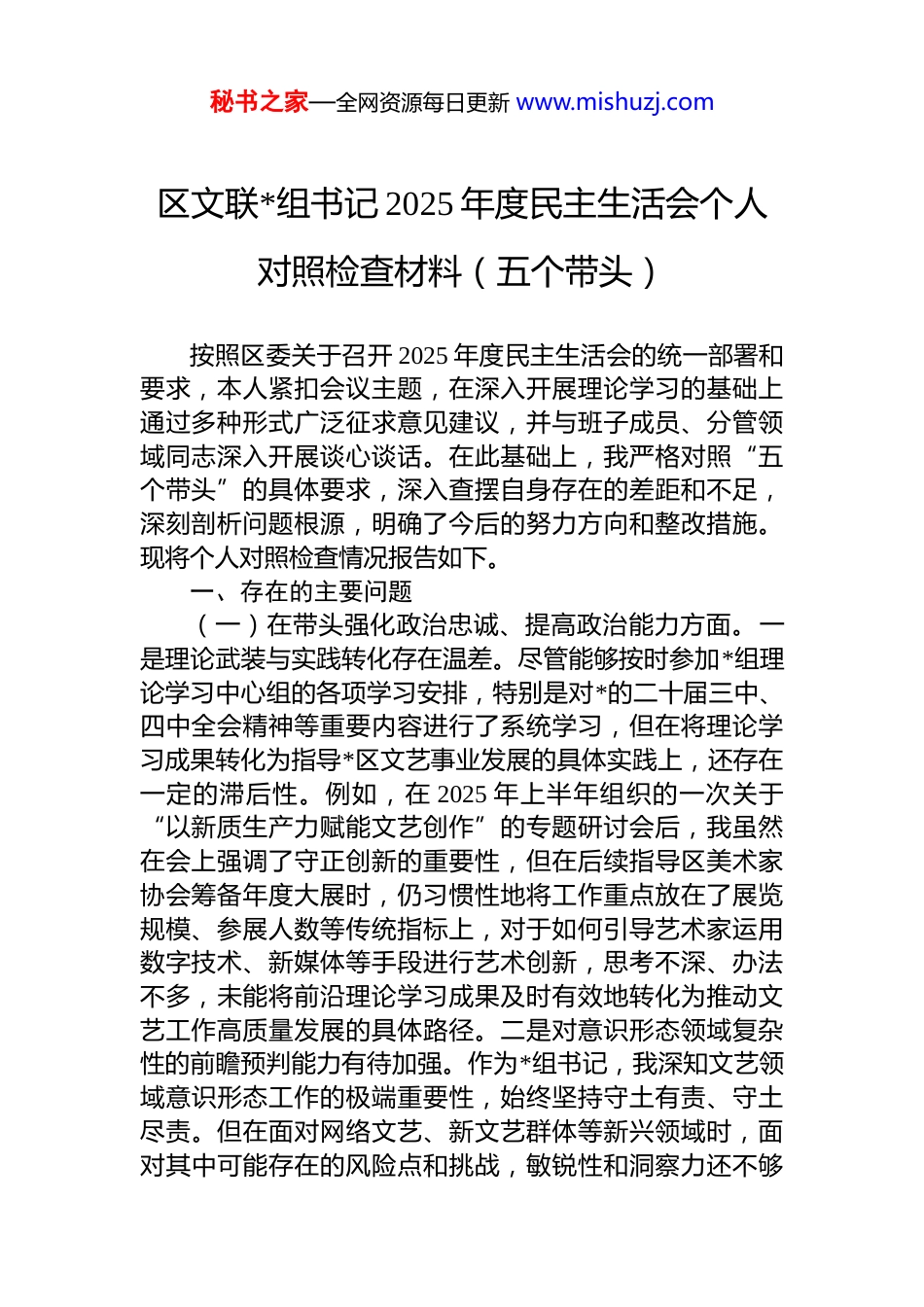 秘书之家—全网资源每日更新 www.mishuzj.com区文联*组书记 2025 年度民主生活会个人对照检查材料(五个带头)按照区委关于召开 2025 年度民主生活会的统一部署和要求,本人紧扣会议主题,在深入开展理论学习的基础上通过多种形式广泛征求意见建议,并与班子成员、分管领域同志深入开展谈心谈话。在此基础上,我严格对照“五个带头”的具体要求,深入查摆自身存在的差距和不足,深刻剖析问题根源,明确了今后的努力方向和整改措施。现将个人对照检查情况报告如下。一、存在的主要问题(一)在带头强化政治忠诚、提高政治能力方面。一是理论武装与实践转化存在温差。尽管能够按时参加*组理论学习中心组的各项学习安排,特别是对*的二十届三中、四中全会精神等重要内容进行了系统学习,但在将理论学习成果转化为指导*区文艺事业发展的具体实践上,还存在一定的滞后性。例如,在 2025 年上半年组织的一次关于“以新质生产力赋能文艺创作”的专题研讨会后,我虽然在会上强调了守正创新的重要性,但在后续指导区美术家协会筹备年度大展时,仍习惯性地将工作重点放在了展览规模、参展人数等传统指标上,对于如何引导艺术家运用数字技术、新媒体等手段进行艺术创新,思考不深、办法不多,未能将前沿理论学习成果及时有效地转化为推动文艺工作高质量发展的具体路径。二是对意识形态领域复杂性的前瞻预判能力有待加强。作为*组书记,我深知文艺领域意识形态工作的极端重要性,始终坚持守土有责、守土尽责。但在面对网络文艺、新文艺群体等新兴领域时,面对其中可能存在的风险点和挑战,敏锐性和洞察力还不够秘书之家—全网资源每日更新 www.mishuzj.com强。2025 年,在推动一项旨在扶持青年网络作家的项目中,我初期的关注点更多地放在了发掘有潜力的作者和作品上对于如何建立一套行之有效的价值导向审核与引导机制,思考得不够周全。直到项目推进过程中,有同志提醒部分作品存在历史虚无主义的苗头,我才警醒并立即组织力量进行内容把关和作者引导,这反映出我在风险防范上存在被动应付的情况,未能做到见微知著、防患于未然。三是在贯彻落实上级决策部署上存在机械执行现象。对于中央和区委的各项决策部署,我始终在思想上和行动上保持高度一致,但在具体执行过程中,有时会因为追求效率和速度,而忽视了结合*区文艺工作的实际情况进行创造性转化。比如,在响应上级关于开展“文艺轻骑兵”下基层服务的号召时,我牵头制定了详细的活动计划,明确了全年要完成的场次指标。然而,在具体实施中,有时为了完成任务组织的活动存在“走马观花”的现象,一场演出结束后,未能与当地群众进行深入的交流互动,也未能充分挖掘当地的文化资源作为创作素材,使得活动的实际效果打了折扣,未能完全实现上级决策部署的深层意图。(二)在带头固本培元、增强*性方面。一是在复杂烦琐的日常事务中,理想信念的“充电”不够及时。作为文联“班长”,我深知*性修养是终身课题。但随着日常行政管理、会议协调、活动组织等事务性工作日益繁重,有时会不自觉地陷入事务主义,导致用于静心学习*史、重温入*誓词、反思入*初心的整块时间被挤占。2025 年,在连续数月高强度筹备*区艺术节的过程中,我满脑子想的都是节目编排、场地协调和安全保障,对于如何将艺术节作为锤炼干部*性、展现新时代*员精神风貌平台的作用,思考和设计得不够充分,反映出在繁重工作压力下,*性修养的主动性和自觉性有所松懈。二是在开展批评与自我批评时,存在“辣味”不足的现象。在*组会议和组织生活会上,我能够坦诚地进行自我批评,但在批评其他同志时,有时会秘书之家—全网资源每日更新 www.mishuzj.com出于维护班子团结和个人情面的考虑,话说得比较委婉、含蓄,点问题时“隔靴搔痒”,未能真正达到“红脸出汗排毒治病”的效果。比如,在一次讨论干部作风问题的会议上,我观察到某位班子成员在联系服务基层文艺家方面存在深入不够的问题,但在提出批评意见时,我只是笼统地建议他“要多下去走走”,而没有具体指出他调研报告中存在的问题和改进方向,批评的锋芒和力度都有所欠缺三是服务文艺工作者的“最后一公里”尚...