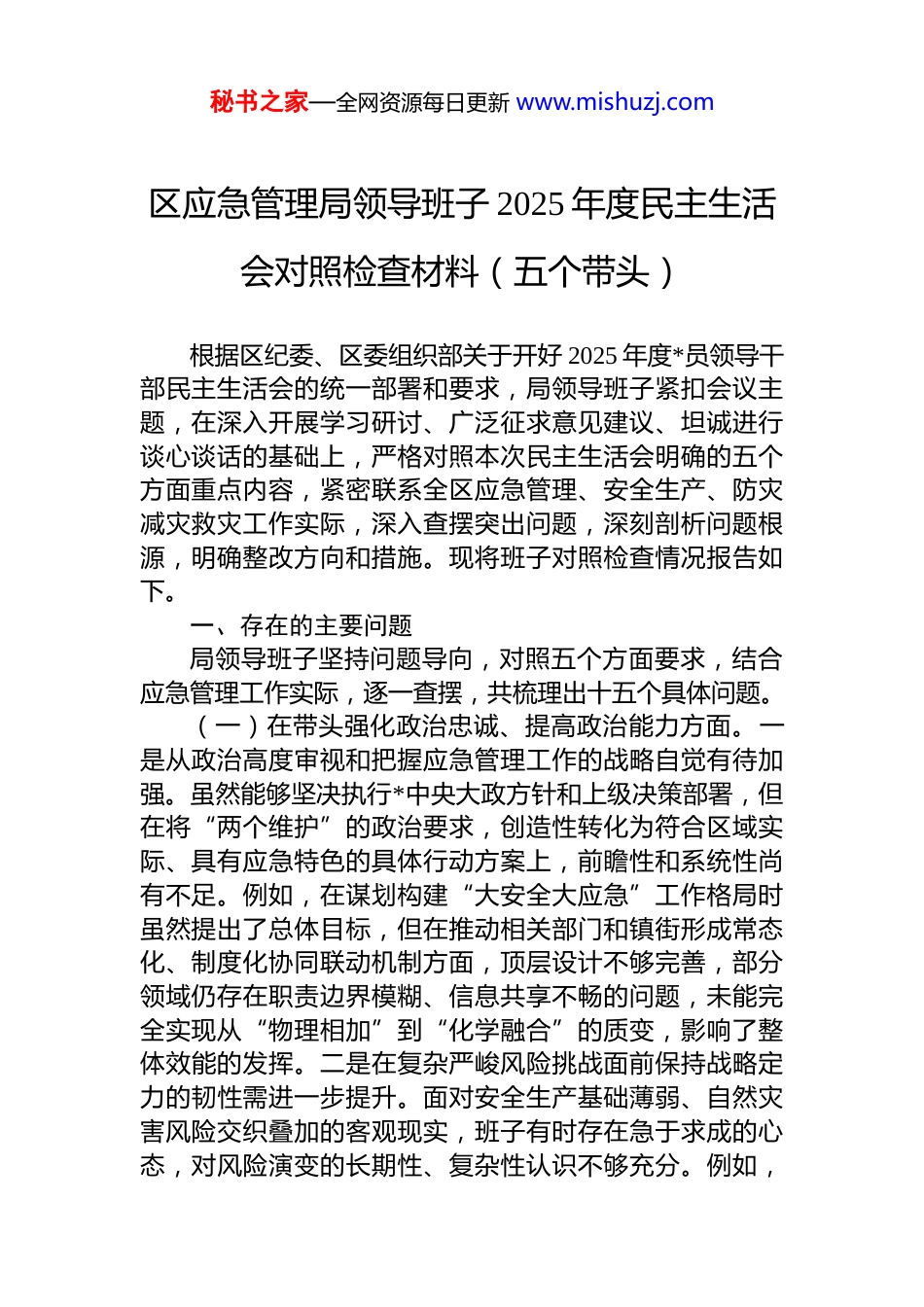 秘书之家—全网资源每日更新 www.mishuzj.com区应急管理局领导班子 2025 年度民主生活会对照检查材料(五个带头)根据区纪委、区委组织部关于开好 2025 年度*员领导干部民主生活会的统一部署和要求,局领导班子紧扣会议主题,在深入开展学习研讨、广泛征求意见建议、坦诚进行谈心谈话的基础上,严格对照本次民主生活会明确的五个方面重点内容,紧密联系全区应急管理、安全生产、防灾减灾救灾工作实际,深入查摆突出问题,深刻剖析问题根源,明确整改方向和措施。现将班子对照检查情况报告如下。一、存在的主要问题局领导班子坚持问题导向,对照五个方面要求,结合应急管理工作实际,逐一查摆,共梳理出十五个具体问题。(一)在带头强化政治忠诚、提高政治能力方面。一是从政治高度审视和把握应急管理工作的战略自觉有待加强。虽然能够坚决执行*中央大政方针和上级决策部署,但在将“两个维护”的政治要求,创造性转化为符合区域实际、具有应急特色的具体行动方案上,前瞻性和系统性尚有不足。例如,在谋划构建“大安全大应急”工作格局时虽然提出了总体目标,但在推动相关部门和镇街形成常态化、制度化协同联动机制方面,顶层设计不够完善,部分领域仍存在职责边界模糊、信息共享不畅的问题,未能完全实现从“物理相加”到“化学融合”的质变,影响了整体效能的发挥。二是在复杂严峻风险挑战面前保持战略定力的韧性需进一步提升。面对安全生产基础薄弱、自然灾害风险交织叠加的客观现实,班子有时存在急于求成的心态,对风险演变的长期性、复杂性认识不够充分。例如,秘书之家—全网资源每日更新 www.mishuzj.com在推进化工园区安全整治提升专项行动中,虽然部署了排查任务,但在面对部分企业因历史遗留问题整改难度大、投入高而产生的抵触情绪和进度滞后时,班子在统筹发展与安全、平衡监管力度与企业承受度方面,未能始终做到精准施策、久久为功,一定程度上存在“运动式”整治的倾向,与“打攻坚战、持久战”的要求存在差距。三是运用*的创新理论指导应急实践、破解深层次矛盾的能力有待增强。对**************思想,特别是关于总体国家安全观、防范化解重大风险的重要论述,学习领会多停留在理论层面,将其蕴含的立场观点方法转化为有效工作举措的“桥梁”搭建得不够牢固。例如,在运用科技信息化手段提升监管效能方面,虽然认识到其重要性,也推动了智慧应急平台建设,但在如何利用 ai、大数据等技术实现风险智能研判、预警信息精准直达基层责任人等关键环节,缺乏深入研究和突破性应用方案,导致部分工作仍依赖于传统人海战术,前瞻性风险防控能力不足。(二)在带头固本培元、增强*性方面。一是理论武装的深度与转化效率有待提高。班子集体学习能够按时开展但在读原著、学原文、悟原理上下的功夫还不够深,满足于“已学习”,在“真领会”、“善运用”上存在短板。学习内容与应急管理主责主业结合不够紧密,未能完全将学习成果系统性地转化为提升*性修养、指导工作实践的强大动力。例如,在组织学习*的二十届四中全会精神时,更多关注了宏观部署,对于如何将其精神实质具体化为完善我区应急管理体系、提升依法应急能力的可操作路径,研讨不够深入,形成的指导性意见较为原则。二是*性锻炼的主动性和常态化机制有待健全。班子成员能够以普通*员身份参加组织生活,但在运用批评和自我批评武器打扫思想灰尘、增强政治免疫力方面,有时存在“好人主义”思想辣味不足。班子成员之间工作交流多,思想交锋少;谈具体业务多,触及灵魂深处的*性分析少。例如,在年度述职秘书之家—全网资源每日更新 www.mishuzj.com或专题组织生活会上,自我批评往往谈工作问题多、谈思想根源少,相互批评也多以工作建议代替思想帮助,未能真正达到红脸出汗、排毒治病的效果,影响了*性修养的持续锤炼。三是在弘扬共产*人精神追求、筑牢信仰之基上示范引领作用有待强化。班子能够坚守廉洁底线,但在以自身过硬*性引领全局*员干部筑牢世界观、人生观、价值观“总开关”方面,载体和抓手不够丰富。应急管理工作压力大、风险高,班子成员在繁重任务面前,有时更多强调履职尽责,对*员干部的思...