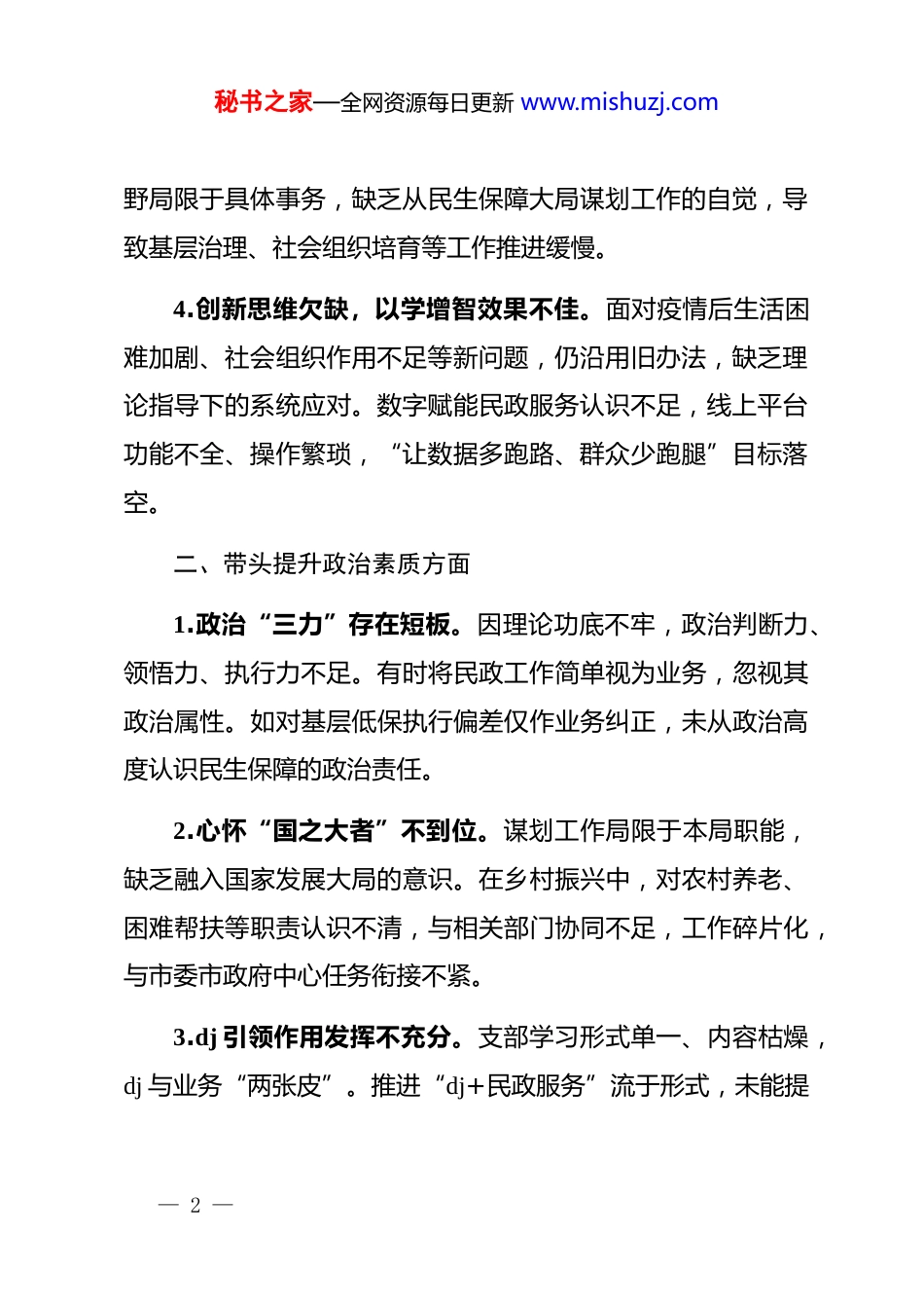 秘书之家—全网资源每日更新 www.mishuzj.com生活会查摆问题清单(6 方面共 24 条)一、带头强化理论学习方面1.学懂弄通缺乏系统性。zt 教育中存在“实用主义”倾向,急用急学、现用现学,对**************思想特别是关于民政工作的****精神理解不深。虽能按时参加集中学习,但缺乏主动钻研,对“健全多层次社会保障体系”“弱有所扶、老有所养”等重大论述的整体逻辑把握不清,课后未结合养老服务、社会救助等实际深入思考,理论储备薄弱。2.学用结合不够紧密。理论未能有效转化为破解难题的举措。如在推进养老服务体系建设中,虽学习了“居家社区机构相协调、医养康养相结合”方向,但实践中仍沿用传统模式,智慧养老、互助养老探索不足,社区站点功能单一;社会救助中对“精准救助”理解不透,入户核查粗放,信息化手段运用滞后,部分困难群众未能及时获助。3.思想解放不足,认知有偏差。存在“重业务轻学习”倾向,未将政治理论学习置于推动民政事业发展的战略高度。对民政工作“政治性、群众性、时代性、协同性”认识不深,视— 1 —秘书之家—全网资源每日更新 www.mishuzj.com野局限于具体事务,缺乏从民生保障大局谋划工作的自觉,导致基层治理、社会组织培育等工作推进缓慢。4.创新思维欠缺,以学增智效果不佳。面对疫情后生活困难加剧、社会组织作用不足等新问题,仍沿用旧办法,缺乏理论指导下的系统应对。数字赋能民政服务认识不足,线上平台功能不全、操作繁琐,“让数据多跑路、群众少跑腿”目标落空。二、带头提升政治素质方面1.政治“三力”存在短板。因理论功底不牢,政治判断力、领悟力、执行力不足。有时将民政工作简单视为业务,忽视其政治属性。如对基层低保执行偏差仅作业务纠正,未从政治高度认识民生保障的政治责任。2.心怀“国之大者”不到位。谋划工作局限于本局职能,缺乏融入国家发展大局的意识。在乡村振兴中,对农村养老、困难帮扶等职责认识不清,与相关部门协同不足,工作碎片化,与市委市政府中心任务衔接不紧。3.dj 引领作用发挥不充分。支部学习形式单一、内容枯燥,dj 与业务“两张皮”。推进“dj+民政服务”流于形式,未能提— 2 —秘书之家—全网资源每日更新 www.mishuzj.com升服务质效;对基层干部关心关爱不足,群众路线践行不深,政策制定脱离群众实际需求。4.min 主集中制落实不严。决策征求意见范围窄、形式单一,尤其在绩效考核、岗位调整等涉及干部切身利益事项上,听取意见不充分,激励作用弱化。班子议事中存在“事不关己”心态,对非分管领域缺乏建言,影响决策科学性。三、带头提升能力本领方面1.业务学习主动性不足。对《养老机构管理办法》等法规仅满足于了解条款,操作细节研究不深,指导基层时政策解读不准。工作中求快不求精,专业素养难以支撑高质量发展。2.基层调研不深入。调研多为“听汇报、开座谈”,深入困难群众家中少,对真实需求掌握不全。zt 教育期间收集 43 条建议,11 条因跟踪督办不力仍未解决,“上面热、下面冷”现象突出。3.开拓创新意识不强。智慧民政建设缺乏系统规划,仅简单升级旧系统,数据壁垒未破,信息共享不畅。面对老龄化、家庭结构变化等挑战,政策缺乏前瞻性,多为被动应对。4.攻坚破难能力欠缺。思想保守,怕出错、不敢闯。殡葬— 3 —秘书之家—全网资源每日更新 www.mishuzj.com改革中因顾虑群众情绪,整治散埋乱葬不彻底;历史遗留问题久拖不决,缺乏“啃硬骨头”的韧劲。四、带头强化担当作为方面1.斗争精神弱化。对意识形态风险警惕性不高,社会组织监管中对违规政治活动排查不力;低保等领域廉政风险防控流于制度,监督检查不严。2.畏难情绪明显。面对老旧小区养老设施落地难等问题,习惯等待上级支持,主动破解不足;社会组织重数量轻质量,服务能力提升乏力。3.责任意识不强。工作缺乏系统规划,事务性任务常出现材料错误、信息录入不准等问题;临时救助政策执行不细,导致该救未救、不该救却救,损害公平性。4.创先争优意识缺失。满足于完成指标,缺乏争先进位勇气。殡葬改革因不敢动真碰硬,公益性供给不足、价格虚高问题长期存在,未形成有辨识度的工作品牌...