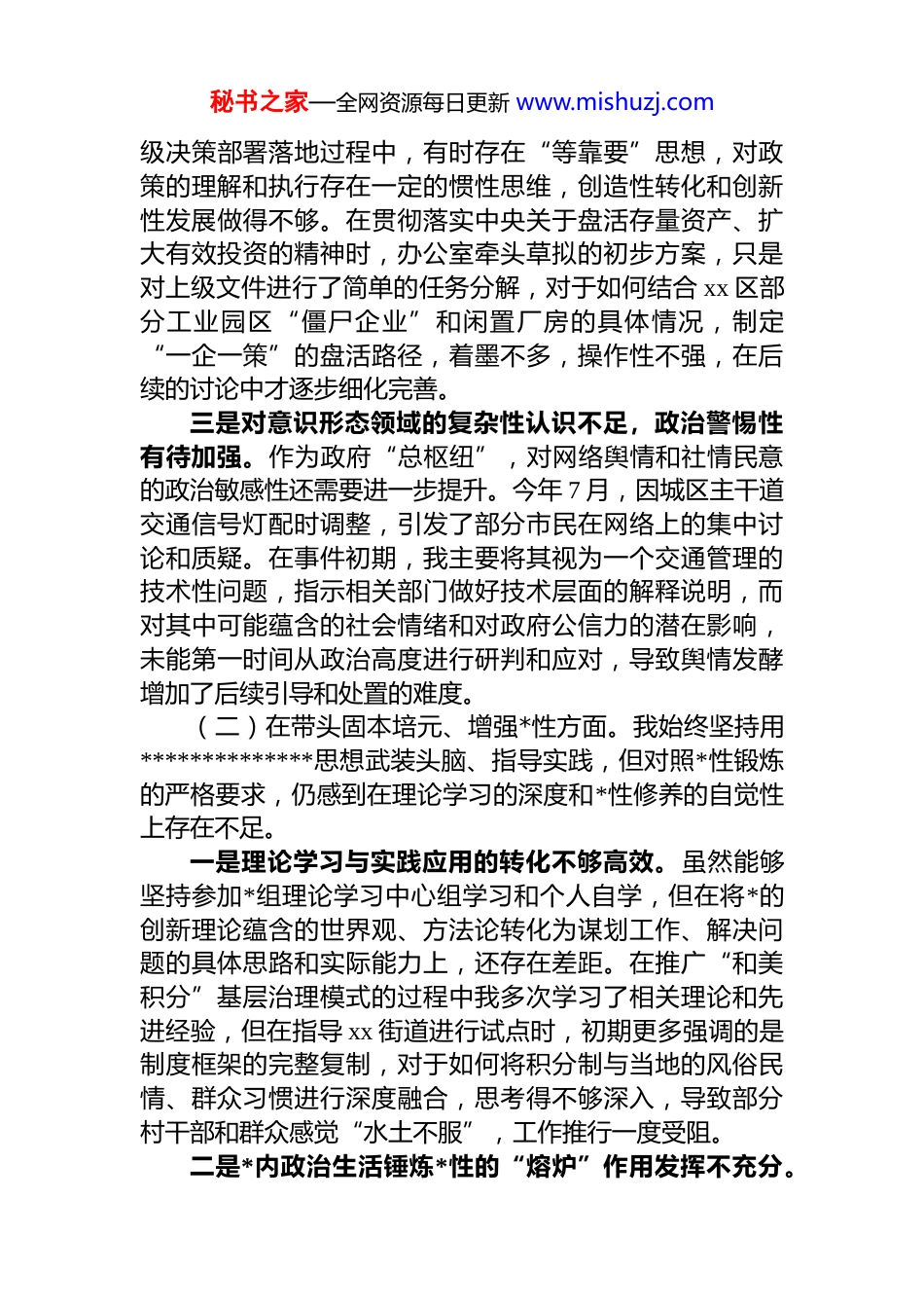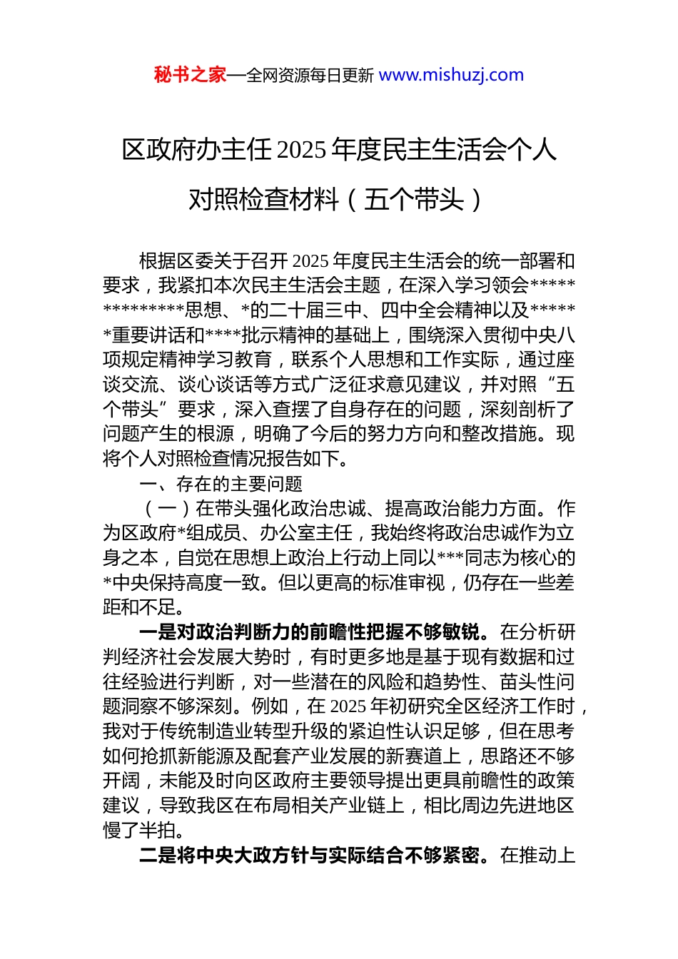 秘书之家—全网资源每日更新 www.mishuzj.com区政府办主任 2025 年度民主生活会个人对照检查材料(五个带头)根据区委关于召开 2025 年度民主生活会的统一部署和要求,我紧扣本次民主生活会主题,在深入学习领会**************思想、*的二十届三中、四中全会精神以及******重要讲话和****批示精神的基础上,围绕深入贯彻中央八项规定精神学习教育,联系个人思想和工作实际,通过座谈交流、谈心谈话等方式广泛征求意见建议,并对照“五个带头”要求,深入查摆了自身存在的问题,深刻剖析了问题产生的根源,明确了今后的努力方向和整改措施。现将个人对照检查情况报告如下。一、存在的主要问题(一)在带头强化政治忠诚、提高政治能力方面。作为区政府*组成员、办公室主任,我始终将政治忠诚作为立身之本,自觉在思想上政治上行动上同以***同志为核心的*中央保持高度一致。但以更高的标准审视,仍存在一些差距和不足。一是对政治判断力的前瞻性把握不够敏锐。在分析研判经济社会发展大势时,有时更多地是基于现有数据和过往经验进行判断,对一些潜在的风险和趋势性、苗头性问题洞察不够深刻。例如,在 2025 年初研究全区经济工作时,我对于传统制造业转型升级的紧迫性认识足够,但在思考如何抢抓新能源及配套产业发展的新赛道上,思路还不够开阔,未能及时向区政府主要领导提出更具前瞻性的政策建议,导致我区在布局相关产业链上,相比周边先进地区慢了半拍。二是将中央大政方针与实际结合不够紧密。在推动上秘书之家—全网资源每日更新 www.mishuzj.com级决策部署落地过程中,有时存在“等靠要”思想,对政策的理解和执行存在一定的惯性思维,创造性转化和创新性发展做得不够。在贯彻落实中央关于盘活存量资产、扩大有效投资的精神时,办公室牵头草拟的初步方案,只是对上级文件进行了简单的任务分解,对于如何结合 xx 区部分工业园区“僵尸企业”和闲置厂房的具体情况,制定“一企一策”的盘活路径,着墨不多,操作性不强,在后续的讨论中才逐步细化完善。三是对意识形态领域的复杂性认识不足,政治警惕性有待加强。作为政府“总枢纽”,对网络舆情和社情民意的政治敏感性还需要进一步提升。今年 7 月,因城区主干道交通信号灯配时调整,引发了部分市民在网络上的集中讨论和质疑。在事件初期,我主要将其视为一个交通管理的技术性问题,指示相关部门做好技术层面的解释说明,而对其中可能蕴含的社会情绪和对政府公信力的潜在影响,未能第一时间从政治高度进行研判和应对,导致舆情发酵增加了后续引导和处置的难度。(二)在带头固本培元、增强*性方面。我始终坚持用**************思想武装头脑、指导实践,但对照*性锻炼的严格要求,仍感到在理论学习的深度和*性修养的自觉性上存在不足。一是理论学习与实践应用的转化不够高效。虽然能够坚持参加*组理论学习中心组学习和个人自学,但在将*的创新理论蕴含的世界观、方法论转化为谋划工作、解决问题的具体思路和实际能力上,还存在差距。在推广“和美积分”基层治理模式的过程中我多次学习了相关理论和先进经验,但在指导 xx 街道进行试点时,初期更多强调的是制度框架的完整复制,对于如何将积分制与当地的风俗民情、群众习惯进行深度融合,思考得不够深入,导致部分村干部和群众感觉“水土不服”,工作推行一度受阻。二是*内政治生活锤炼*性的“熔炉”作用发挥不充分。秘书之家—全网资源每日更新 www.mishuzj.com在参加所在*支部的组织生活会时,开展相互批评有时还不够“辣味”。出于维护班子团结和保护同志积极性的考虑我在对其他同志提出批评意见时,有时点到为止,讲工作建议多、点思想问题少;在听取他人对自己的批评时,虽然能做到虚心接受,但内心深处有时还是习惯于先作一番解释,说明客观原因,自我革命的勇气和决心仍需加强。三是面对繁重工作任务时,对*性修养的日常坚守有所松懈。作为办公室主任,事务性工作千头万绪,常常需要加班加点。在这种高强度的工作节奏下,有时会产生“先忙完工作再说”的念头,不自觉地放松了对个人*性修养的持续锤炼。比如,偶尔会因为晚上有紧急文件要处理,就忽略了当天...