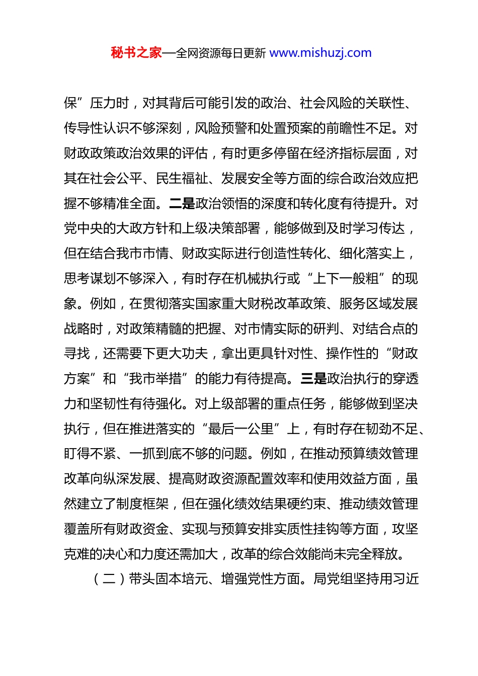 秘书之家—全网资源每日更新 www.mishuzj.com市财政局党组领导班子 2025 年度民主生活会对照检查材料 根据市委《关于开好 2025 年度党员领导干部民主生活会的通知》要求,市财政局党组高度重视,紧紧围绕会议主题,在深入学习研讨、广泛征求意见、普遍开展谈心谈话的基础上,严格对照通知明确的重点方面,结合我市财政工作实际,深入查摆问题,深刻剖析根源,明确整改方向。现将局党组领导班子对照检查情况报告如下。一、查摆的主要问题局党组紧扣本次民主生活会主题,坚持把自己摆进去、把职责摆进去、把工作摆进去,通过自己找、群众提、上级点、互相帮等方式,共查摆出 5 个方面 15 项具体问题。(一)带头强化政治忠诚、提高政治能力方面。局党组始终坚持把党的政治建设摆在首位,深刻领悟“两个确立”的决定性意义,坚决做到“两个维护”,但在政治判断力、政治领悟力、政治执行力上仍需持续提升。一是政治判断的前瞻性和敏锐性有待增强。对财政工作的政治属性认识还需进一步深化,从政治高度观察、分析和处理财政经济问题的能力有待加强。例如,在研判财政运行风险、地方政府债务风险、基层“三秘书之家—全网资源每日更新 www.mishuzj.com保”压力时,对其背后可能引发的政治、社会风险的关联性、传导性认识不够深刻,风险预警和处置预案的前瞻性不足。对财政政策政治效果的评估,有时更多停留在经济指标层面,对其在社会公平、民生福祉、发展安全等方面的综合政治效应把握不够精准全面。二是政治领悟的深度和转化度有待提升。对党中央的大政方针和上级决策部署,能够做到及时学习传达,但在结合我市市情、财政实际进行创造性转化、细化落实上,思考谋划不够深入,有时存在机械执行或“上下一般粗”的现象。例如,在贯彻落实国家重大财税改革政策、服务区域发展战略时,对政策精髓的把握、对市情实际的研判、对结合点的寻找,还需要下更大功夫,拿出更具针对性、操作性的“财政方案”和“我市举措”的能力有待提高。三是政治执行的穿透力和坚韧性有待强化。对上级部署的重点任务,能够做到坚决执行,但在推进落实的“最后一公里”上,有时存在韧劲不足、盯得不紧、一抓到底不够的问题。例如,在推动预算绩效管理改革向纵深发展、提高财政资源配置效率和使用效益方面,虽然建立了制度框架,但在强化绩效结果硬约束、推动绩效管理覆盖所有财政资金、实现与预算安排实质性挂钩等方面,攻坚克难的决心和力度还需加大,改革的综合效能尚未完全释放。(二)带头固本培元、增强党性方面。局党组坚持用习近秘书之家—全网资源每日更新 www.mishuzj.com平新时代中国特色社会主义思想凝心铸魂,不断加强党性修养,但在理论学习的系统性、转化运用的自觉性、党性锤炼的经常性上仍有不足。一是理论武装“学思用贯通”存在温差。党组理论学习中心组学习制度落实到位,但在学习的系统性、深入性上还需加强,存在“应景式”“任务式”学习的现象。对党的创新理论,特别是关于财政经济工作的重要论述,满足于“学过了”,但在“学懂弄通做实”、把握其世界观和方法论、运用其立场观点方法分析和解决实际问题方面,深度和广度都有待拓展。班子成员运用党的创新理论指导财政实践、破解发展难题的意识和能力不均衡,存在“学用脱节”的情况。二是理想信念“内化于心、外化于行”存在落差。班子成员能够坚定理想信念,但在将其转化为锐意进取、开拓创新的精气神和埋头苦干、真抓实干的实际行动方面,仍有提升空间。面对财政收支矛盾突出、改革攻坚任务繁重等挑战,有时存在求稳怕乱、按部就班的思想,主动担当、勇于创新的劲头有所减弱。在弘扬艰苦奋斗、勤俭节约优良传统方面,虽然多次强调,但在预算编制审核、经费支出管理、机关运行保障等具体环节,精打细算、“过紧日子”的要求落实得还不够严格、不够彻底。三是党性修养“常态化锤炼”存在时差。严肃党内政治生活有时不够严格,批评和自我批评的武器运用不够经常、不够有力,秘书之家—全网资源每日更新 www.mishuzj.com“辣味”不足,存在“好人主义”倾向。对照党章党规党纪进行自我检视、自我净化、自我提高的主动性和自...