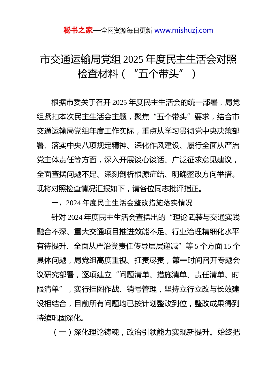 秘书之家—全网资源每日更新 www.mishuzj.com市交通运输局党组 2025 年度民主生活会对照检查材料(“五个带头”)根据市委关于召开 2025 年度民主生活会的统一部署,局党组紧扣本次民主生活会主题,聚焦“五个带头”要求,结合市交通运输局党组年度工作实际,重点从学习贯彻党中央决策部署、落实中央八项规定精神、深化作风建设、履行全面从严治党主体责任等方面,深入开展谈心谈话、广泛征求意见建议,全面查摆问题不足、深刻剖析根源症结、明确整改方向举措。现将对照检查情况汇报如下,请各位同志批评指正。一、2024 年度民主生活会整改措施落实情况针对 2024 年度民主生活会查摆出的“理论武装与交通实践融合不深、重大交通项目推进效能不足、行业治理精细化水平有待提升、全面从严治党责任传导层层递减”等 5 个方面 15 个具体问题,局党组高度重视、扛责尽责,第一时间召开专题会议研究部署,逐项建立“问题清单、措施清单、责任清单、时限清单”,实行挂图作战、销号管理,坚持立行立改与长效建设相结合,目前所有问题均已按计划整改到位,整改成果得到持续巩固深化。(一)深化理论铸魂,政治引领能力实现新提升。始终把秘书之家—全网资源每日更新 www.mishuzj.com学习贯彻习近平新时代中国特色社会主义思想作为首要政治任务,严格落实“第一议题”制度,修订完善《局党组理论学习中心组学习制度》,全年主持召开党组理论学习中心组学习会15 次,专题学习习近平总书记关于交通运输工作的重要论述、指示批示精神 23 次,带头开展研讨交流 12 人次。围绕“加快建设交通强国”“以新质生产力赋能交通运输高质量发展”等主题,党组书记带头讲授专题党课 4 次,班子成员到分管领域、联系单位讲党课 8 次,推动理论学习与交通工作实践深度融合。通过开展“学思想、强党性、重实践、建新功”主题教育,组织全局党员干部开展专题培训 6 场、实地研学 4 次,引导干部职工不断提高政治判断力、政治领悟力、政治执行力,自觉在思想上政治上行动上同以习近平同志为核心的党中央保持高度一致,确保党中央关于交通运输高质量发展的各项决策部署在全市交通系统落地生根、开花结果。(二)聚焦主责主业,交通发展动能得到新增强。锚定“打造区域综合交通枢纽”目标,将整改落实与履职尽责紧密结合,全力推动交通运输事业高质量发展。一是攻坚重大项目建设。建立“领导包联、专班推进、定期调度”机制,统筹推进高速公路、国省干线、港口航运、城乡客运等重点项目建设,2025 年全市交通固定资产投资完成*亿元,同比增长*%;*高秘书之家—全网资源每日更新 www.mishuzj.com速公路主线贯通,*国道改线工程竣工通车,*港口集装箱吞吐量突破*万标箱,交通基础设施网络持续完善。二是提升运输服务质效。深化城乡客运一体化改革,新增城乡公交线路*条,优化调整线路*条,行政村通公交率保持 100%;推进“交邮融合”发展,建成乡镇综合运输服务站*个,农村物流覆盖率提升至*%;规范网约车、货运车辆管理,道路运输违法行为查处率提升*%,运输市场秩序持续向好。三是赋能产业融合发展。主动对接制造业、旅游业等重点产业需求,开通工业园区定制公交*条、旅游专线*条;推进多式联运发展,完成集装箱多式联运量*万吨,降低物流成本约*亿元,为全市经济社会发展提供了坚实交通保障。(三)践行初心使命,为民服务质效展现新面貌。牢固树立以人民为中心的发展思想,把解决群众急难愁盼问题作为整改落脚点。一是深化“放管服”改革。梳理交通政务服务事项*项,实现*项“一网通办”、*项“免申即享”、*项“最多跑一次”,审批时限平均压缩*%。二是开展专项整治行动。聚焦群众反映强烈的公路“三乱”、出租车拒载议价等问题,开展专项整治*次,查处违规行为*起,退还违规收费*万元,群众满意度提升至*%。三是畅通诉求反馈渠道。依托 12345 政务服务热线、交通服务监督电话等平台,建立“接诉即办、闭环管理”秘书之家—全网资源每日更新 www.mishuzj.com机制,全年受理群众诉求*件,办结率*%、满意率*%。四是深入基层调研走访。班子成员带头深入项目工地、运输企业、乡镇...
