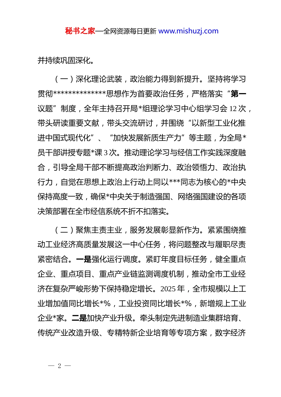 秘书之家—全网资源每日更新 www.mishuzj.com市经信局*组书记 2025 年度民主生活会个人对照检查材料(“五个带头”)按照市委统一部署和局*组工作安排,会前,本人聚焦本次民主生活会主题,坚持个人自学与集中研讨相结合,深入学习了**************思想,认真研读了《***谈治国理政》第五卷、《***著作选读》等重点文献,特别是系统学习了******关于新型工业化、制造强国、网络强国、数字经济发展等一系列重要论述和对本地本领域工作的****批示精神,为开好民主生活会打牢了思想基础。同时,通过发放征求意见函、深入基层调研、开展谈心谈话等多种方式,广泛听取了各方面的意见建议,并结合自身思想和工作实际,对照中央要求的“五个方面”内容,深入查摆问题,深刻剖析根源,明确了今后的努力方向和改进措施。现将对照检查情况报告如下。一、2024 年民主生活会整改措施落实情况针对 2024 年度民主生活会查摆出的 6 个方面 11 个具体问题,本人高度重视,逐项建立了整改台账,明确了整改时限和责任人,坚持立行立改、长期坚持,目前均已按计划整改到位— 1 —秘书之家—全网资源每日更新 www.mishuzj.com并持续巩固深化。(一)深化理论武装,政治能力得到新提升。坚持将学习贯彻**************思想作为首要政治任务,严格落实“第一议题”制度,全年主持召开局*组理论学习中心组学习会 12 次,带头研读重要文献,带头交流研讨,并围绕“以新型工业化推进中国式现代化”、“加快发展新质生产力”等主题,为全局*员干部讲授专题*课 3 次。推动理论学习与经信工作实践深度融合,引导全局干部不断提高政治判断力、政治领悟力、政治执行力,自觉在思想上政治上行动上同以***同志为核心的*中央保持高度一致,确保*中央关于制造强国、网络强国建设的各项决策部署在全市经信系统不折不扣落实。(二)聚焦主责主业,服务发展彰显新作为。紧紧围绕推动工业经济高质量发展这一中心任务,将问题整改与履职尽责紧密结合。一是强化运行调度。紧盯年度目标任务,健全重点企业、重点项目、重点产业链监测调度机制,推动全市工业经济在复杂严峻形势下保持稳定增长。2025 年,全市规模以上工业增加值同比增长*%,工业投资同比增长*%,新增规上工业企业*家。二是加快产业升级。牵头制定先进制造业集群培育、传统产业改造升级、专精特新企业培育等专项方案,数字经济— 2 —秘书之家—全网资源每日更新 www.mishuzj.com核心产业增加值占 gdp 比重提升至*%,新增省级以上“专精特新”企业*家。三是优化企业服务。深入开展“解难题、稳增长、促发展”企业帮扶活动,牵头协调解决企业反映的用地、用工、用能、融资等各类问题**余个,落实各项惠企政策,降低实体经济企业成本约*亿元。(三)践行初心使命,服务企业展现新面貌。牢固树立以人民为中心的发展思想,将服务企业、服务群众作为工作的出发点和落脚点。持续优化营商环境,深化“放管服”改革,推动更多政务服务事项“一网通办”、“免申即享”。开展涉企违规收费专项整治,对发现的*个问题全部督促整改到位。畅通企业诉求反映渠道,依托“12345”热线、“企业直通车”等平台,高效处理企业诉求。深入基层一线调研*次,形成高质量调研报告*篇,推动解决了一批企业急难愁盼问题。(四)坚持严实作风,政治生态呈现新气象。认真履行全面从严治*第一责任人职责,主持召开*风廉政建设专题会议*次,开展廉政谈话*人次。坚决贯彻落实中央八项规定及其实施细则精神,带头改进调研方式,大力精文减会。深入开展形式主义、官僚主义问题排查整治,推动机关效能持续提升。支持驻局纪检监察组履行监督责任,强化对项目申报、资金安排、行政执— 3 —秘书之家—全网资源每日更新 www.mishuzj.com法等关键环节的廉政风险防控,推动全局政治生态持续向好。二、对照检查发现的主要问题(一)带头强化政治忠诚、提高政治能力方面。一是理论武装的深度和转化度有待加强。虽然能够坚持学习*的创新理论,但在全面系统、融会贯通上还有差距。对**************思想,特别是关于发展新质生产力、推进新型工业化等最新重要论述的学习,有时满足于...