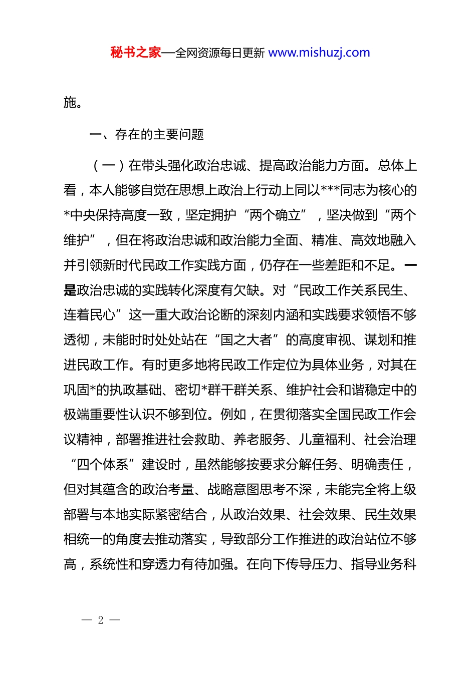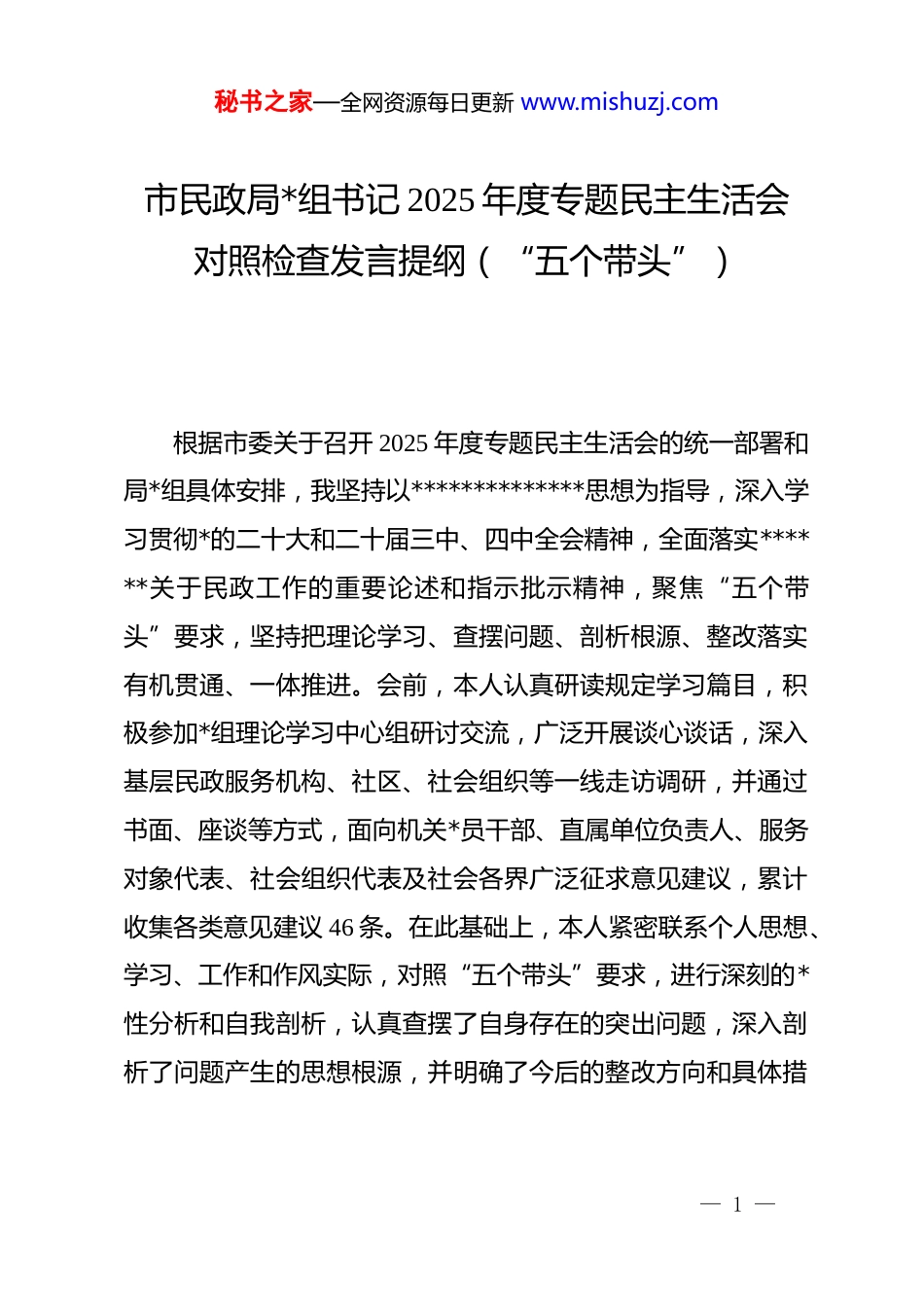 秘书之家—全网资源每日更新 www.mishuzj.com市民政局*组书记 2025 年度专题民主生活会对照检查发言提纲(“五个带头”) 根据市委关于召开 2025 年度专题民主生活会的统一部署和局*组具体安排,我坚持以**************思想为指导,深入学习贯彻*的二十大和二十届三中、四中全会精神,全面落实******关于民政工作的重要论述和指示批示精神,聚焦“五个带头”要求,坚持把理论学习、查摆问题、剖析根源、整改落实有机贯通、一体推进。会前,本人认真研读规定学习篇目,积极参加*组理论学习中心组研讨交流,广泛开展谈心谈话,深入基层民政服务机构、社区、社会组织等一线走访调研,并通过书面、座谈等方式,面向机关*员干部、直属单位负责人、服务对象代表、社会组织代表及社会各界广泛征求意见建议,累计收集各类意见建议 46 条。在此基础上,本人紧密联系个人思想、学习、工作和作风实际,对照“五个带头”要求,进行深刻的*性分析和自我剖析,认真查摆了自身存在的突出问题,深入剖析了问题产生的思想根源,并明确了今后的整改方向和具体措— 1 —秘书之家—全网资源每日更新 www.mishuzj.com施。一、存在的主要问题(一)在带头强化政治忠诚、提高政治能力方面。总体上看,本人能够自觉在思想上政治上行动上同以***同志为核心的*中央保持高度一致,坚定拥护“两个确立”,坚决做到“两个维护”,但在将政治忠诚和政治能力全面、精准、高效地融入并引领新时代民政工作实践方面,仍存在一些差距和不足。一是政治忠诚的实践转化深度有欠缺。对“民政工作关系民生、连着民心”这一重大政治论断的深刻内涵和实践要求领悟不够透彻,未能时时处处站在“国之大者”的高度审视、谋划和推进民政工作。有时更多地将民政工作定位为具体业务,对其在巩固*的执政基础、密切*群干群关系、维护社会和谐稳定中的极端重要性认识不够到位。例如,在贯彻落实全国民政工作会议精神,部署推进社会救助、养老服务、儿童福利、社会治理“四个体系”建设时,虽然能够按要求分解任务、明确责任,但对其蕴含的政治考量、战略意图思考不深,未能完全将上级部署与本地实际紧密结合,从政治效果、社会效果、民生效果相统一的角度去推动落实,导致部分工作推进的政治站位不够高,系统性和穿透力有待加强。在向下传导压力、指导业务科— 2 —秘书之家—全网资源每日更新 www.mishuzj.com室时,有时过于强调量化指标和进度要求,对其中蕴含的政治标准、政治要求强调不够、融合不紧,未能充分彰显民政工作的鲜明政治属性。二是政治“三力”的锤炼运用有短板。政治判断力不够敏锐。对社会转型期民政领域可能出现的风险挑战预见性不足,对苗头性、倾向性问题特别是其背后潜藏的政治风险缺乏足够的洞察力和鉴别力。政治领悟力不够精准。对*中央的重大决策部署和上级指示精神,有时满足于“知道了”“传达了”,但在结合本市经济社会发展实际和民政工作具体情况进行创造性转化、落实上思考不深、办法不多。存在一定的“本本主义”和路径依赖,习惯于照搬照抄上级文件,未能真正做到吃透精神、把握实质、因地制宜。政治执行力不够坚决。对中央及省、市关于民生保障、基层治理等方面的重大决策部署,能够做到不折不扣地执行,但在推动落地见效的“最后一公里”上,缺乏一抓到底的韧劲和闭环管理的硬招。存在“重部署、轻跟踪,重开头、轻结尾”的现象,对于一些周期长、难度大的工作,后续的督导检查、效果评估、问题纠偏不够及时有力。三是理论武装与政治实践融合有差距。学习**************思想,特别是其中关于民生保障、共同富裕、基层治理、积极应对人口老龄化等重要论述,存在碎片化、浅层化现象,系统研读、深入思考不够,对其核心要义、精神实质、实— 3 —秘书之家—全网资源每日更新 www.mishuzj.com践要求的理解把握不够透彻,未能完全做到融会贯通、知行合一。参加中心组学习有时存在“被动接受”心态,研讨交流的深度和碰撞不够,将*的创新理论转化为指导民政实践、破解工作难题的思路、方法、举措的能力有待提升。例如,在理解和落实“积极应对人口老龄化国家战略”时,对战略的全局性、...