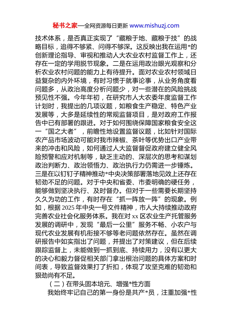 秘书之家—全网资源每日更新 www.mishuzj.com市人大常委会副主任 2025 年度民主生活会个人对照检查材料(五个带头)根据市人大常委会*组关于召开 2025 年度民主生活会的统一部署,我紧扣本次民主生活会主题,在深入学习**************思想,全面贯彻落实*的二十届三中、四中全会精神,通过群众提、自己找、上级点、互相帮等多种方式广泛征求意见建议,并与班子成员、分管部门同志深入开展谈心谈话。在此基础上,我围绕“五个带头”要求,紧密联系个人思想、学习和工作实际,深入查摆自身存在的差距和不足,深刻剖析问题产生的根源,明确了今后的努力方向和整改措施。现将个人对照检查情况报告如下。一、存在的主要问题(一)在带头强化政治忠诚、提高政治能力方面作为一名受*培养多年的领导干部,我始终将政治忠诚作为立身之本,自觉在思想上政治上行动上同以***同志为核心的*中央保持高度一致。但以更高的标准、更严的要求审视,仍存在一些差距和不足。一是将理论学习成果转化为人大监督实效的敏锐性、深刻性还不够。虽然能够跟进学习贯彻******关于“三农”工作的重要论述和*中央的各项决策部署,但在结合分管工作创造性地开展监督方面,思考得不够深、谋划得不够远。例如,在学习领会新发展理念,特别是关于发展生态农业、绿色农业的要求时,认识停留在宏观层面较多,将其细化为具体监督议题、转化为精准监督抓手的能力尚有欠缺。在今年第二季度带队对xx 县高标准农田建设项目进行视察时,我更多地关注了项目建设的进度、投资完成率和建成面积等硬性指标,对于项目是否同步配套绿色防控、节水灌溉、土壤改良等生态秘书之家—全网资源每日更新 www.mishuzj.com技术体系,是否真正实现了“藏粮于地、藏粮于技”的战略目标,追得不够紧、问得不够深。这反映出我在运用*的创新理论指导、审视和推动人大农业农村监督工作上,还存在一定的学用脱节现象。二是在运用政治眼光观察和分析农业农村问题的能力上有待提升。面对农业农村领域日益复杂的内外环境,有时习惯于就事论事,从业务角度看问题多,从政治高度分析问题少,对一些潜在的风险挑战预见性不强。今年年初,在研究市人大农委年度监督工作计划时,我提出的几项议题,如粮食生产稳定、特色产业发展等,大多是延续性的常规监督项目,是对政府工作报告中已有部署的跟进。对于如何围绕保障国家粮食安全这一“国之大者”,前瞻性地设置监督议题,比如针对国际农产品市场波动可能对我市辣椒、茶叶等优势出口产业带来的冲击和风险,如何通过人大监督督促政府建立健全风险预警和应对机制等,缺乏主动的、深层次的思考和谋划政治判断力、政治领悟力、政治执行力仍需进一步锤炼。三是在以钉钉子精神推动*中央决策部署落地见效上还存在韧劲不足的问题。对于中央和省委、市委明确的硬任务,能够做到坚决执行、及时督办。但对于一些需要长期坚持久久为功的工作,有时存在“抓一阵放一阵”的现象。例如,根据 2025 年中央一号文件精神,市人大持续推动政府完善农业社会化服务体系。我在对 xx 区农业生产托管服务发展的调研中,发现“最后一公里”服务不畅、小农户与现代农业发展有机衔接不够等老问题依然存在。虽然在调研报告中如实指出了问题,并提出了对策建议,但在后续跟踪监督上,未能做到一抓到底、持续用力,没有以更大的决心和毅力督促相关部门拿出根治问题的具体方案和时间表,导致监督效果打了折扣,体现了攻坚克难的韧劲和狠劲尚有不足。(二)在带头固本培元、增强*性方面我始终牢记自己的第一身份是共产*员,注重加强*性秘书之家—全网资源每日更新 www.mishuzj.com修养,坚守精神家园。但对照共产*人应有的精神境界和*性要求,仍感到自身在固本培元、锤炼*性上做得还不够。一是世界观、人生观、价值观这个“总开关”拧得还不够紧。随着工作环境和岗位的变化,有时不自觉地产生了安于现状、不愿吃苦的思想。尤其是在一些对外交流和宣传活动中,潜意识里会把展示 xx 农业发展的成绩、争取上级肯定和项目支持作为主要目标,在介绍情况时报喜多、言忧少。这种对“政绩”的看重,虽然是推动工作的动力之一,但也掺杂...