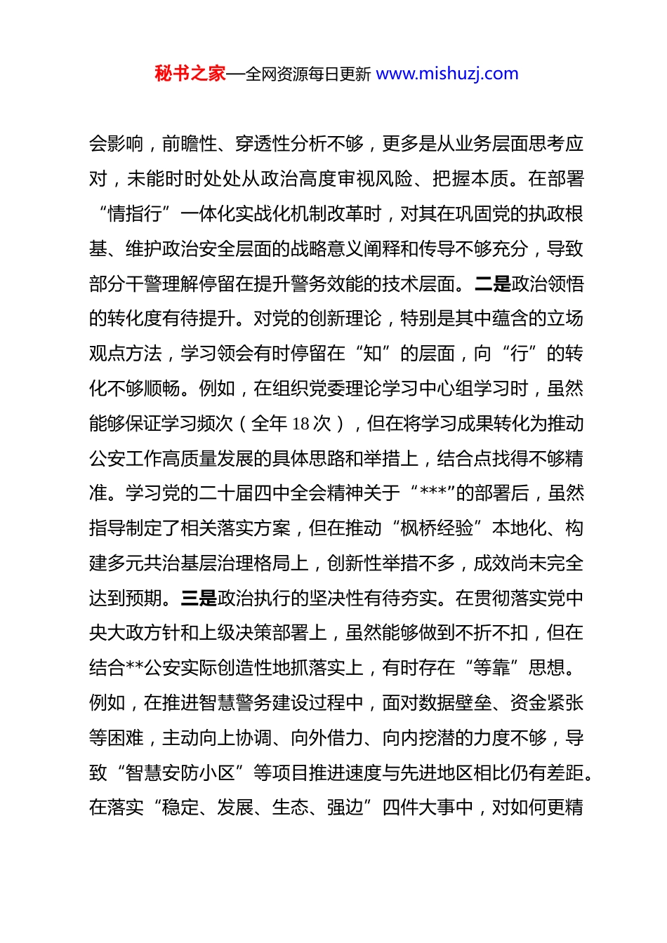 秘书之家—全网资源每日更新 www.mishuzj.com书记 2025 年度民主生活会个人对照检查材料 根据中央、省委、市委和县委关于开好 2025 年度民主生活会的统一部署,近期,我紧扣会议主题,聚焦学习贯彻习近平新时代中国特色社会主义思想,特别是深入领会党的二十届三中、四中全会精神和习近平总书记关于党的自我革命的重要思想,结合持续深化学习教育的心得体会,认真学习了规定篇目,并通过谈心谈话、基层调研等方式,广泛征求了意见建议。在此基础上,我严格对照本次民主生活会明确的五个方面重点内容,紧密联系个人思想、学习和工作实际,深入查摆自身存在的问题,深刻剖析问题根源,并明确了今后的努力方向和整改措施。现将个人对照检查情况报告如下。一、存在的主要问题我坚持把自己摆进去、把职责摆进去、把工作摆进去,对照五个方面要求,逐一检视反思,主要存在以下问题:(一)在带头强化政治忠诚、提高政治能力方面。一是政治判断的穿透力有待加强。对“两个确立”决定性意义的领悟,在将其转化为应对复杂公安斗争形势的敏锐洞察上,有时存在“温差”。例如,在研判县域社会治安风险时,虽然能够坚决贯彻上级部署,但对一些新型风险隐患背后可能潜藏的政治社秘书之家—全网资源每日更新 www.mishuzj.com会影响,前瞻性、穿透性分析不够,更多是从业务层面思考应对,未能时时处处从政治高度审视风险、把握本质。在部署“情指行”一体化实战化机制改革时,对其在巩固党的执政根基、维护政治安全层面的战略意义阐释和传导不够充分,导致部分干警理解停留在提升警务效能的技术层面。二是政治领悟的转化度有待提升。对党的创新理论,特别是其中蕴含的立场观点方法,学习领会有时停留在“知”的层面,向“行”的转化不够顺畅。例如,在组织党委理论学习中心组学习时,虽然能够保证学习频次(全年 18 次),但在将学习成果转化为推动公安工作高质量发展的具体思路和举措上,结合点找得不够精准。学习党的二十届四中全会精神关于“***”的部署后,虽然指导制定了相关落实方案,但在推动“枫桥经验”本地化、构建多元共治基层治理格局上,创新性举措不多,成效尚未完全达到预期。三是政治执行的坚决性有待夯实。在贯彻落实党中央大政方针和上级决策部署上,虽然能够做到不折不扣,但在结合**公安实际创造性地抓落实上,有时存在“等靠”思想。例如,在推进智慧警务建设过程中,面对数据壁垒、资金紧张等困难,主动向上协调、向外借力、向内挖潜的力度不够,导致“智慧安防小区”等项目推进速度与先进地区相比仍有差距。在落实“稳定、发展、生态、强边”四件大事中,对如何更精秘书之家—全网资源每日更新 www.mishuzj.com准地以公安工作服务保障县域经济社会高质量发展,系统性思考和整体性推进的力度还需加大。(二)在带头固本培元、增强党性方面。一是理论武装的深度有待拓展。虽然能够坚持参加集体学习和个人自学,但在“凝心铸魂”的实效上,距离“学思用贯通、知信行统一”的高标准还有差距。例如,运用习近平新时代中国特色社会主义思想指导公安队伍思想政治工作,有时方法还比较传统,针对“90 后”、“00 后”青年民警的思想特点,探索运用新媒体、新话语体系进行理想信念教育和价值引领的主动性不足,理论学习的吸引力和感染力有待提升。在解决世界观、人生观、价值观“总开关”问题上,对班子成员和基层党支部书记的督促引导,有时停留在会议要求和文件传达层面,跟踪问效、触及灵魂的举措不够硬。二是党性锤炼的硬度有待增强。对照党章党规党纪进行自我检视的主动性和经常性不足,有时存在“事务主义”倾向,以日常工作代替党性锻炼。例如,在落实双重组织生活制度上,虽然能够参加所在支部活动,但以普通党员身份开展严肃的批评与自我批评有时不够充分,听取普通民警意见的渠道和氛围还可以更开阔、更坦诚。在面对公安工作任务重、压力大的现实情况下,有时不自觉地降低了对自身精神境界提升的要求,艰苦奋斗、攻坚克难的锐气有所消磨,对一秘书之家—全网资源每日更新 www.mishuzj.com些长期存在的队伍管理“顽瘴痼疾”,缺乏“钉钉子”精神一抓到底。三...