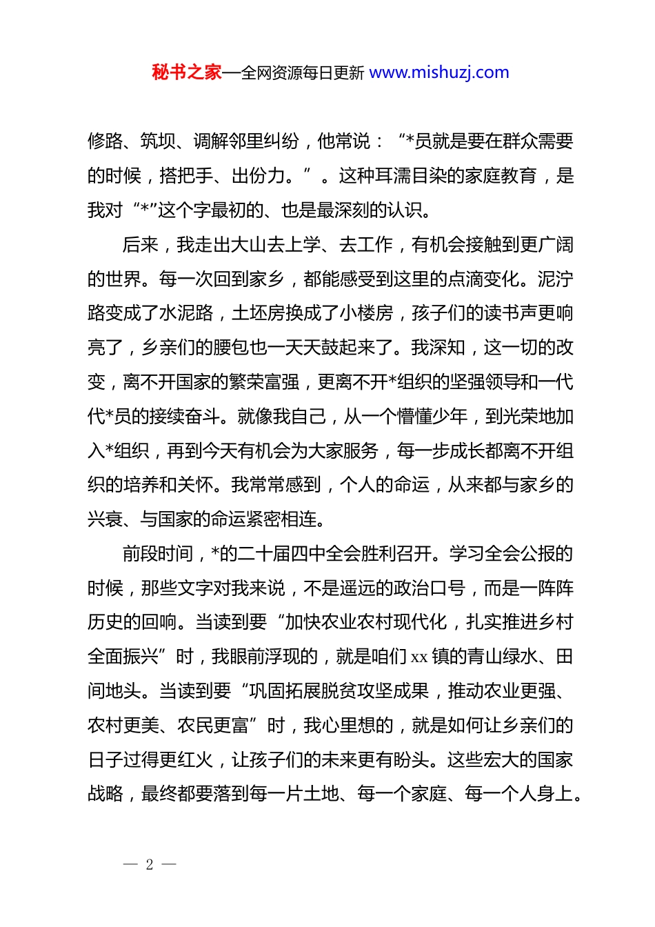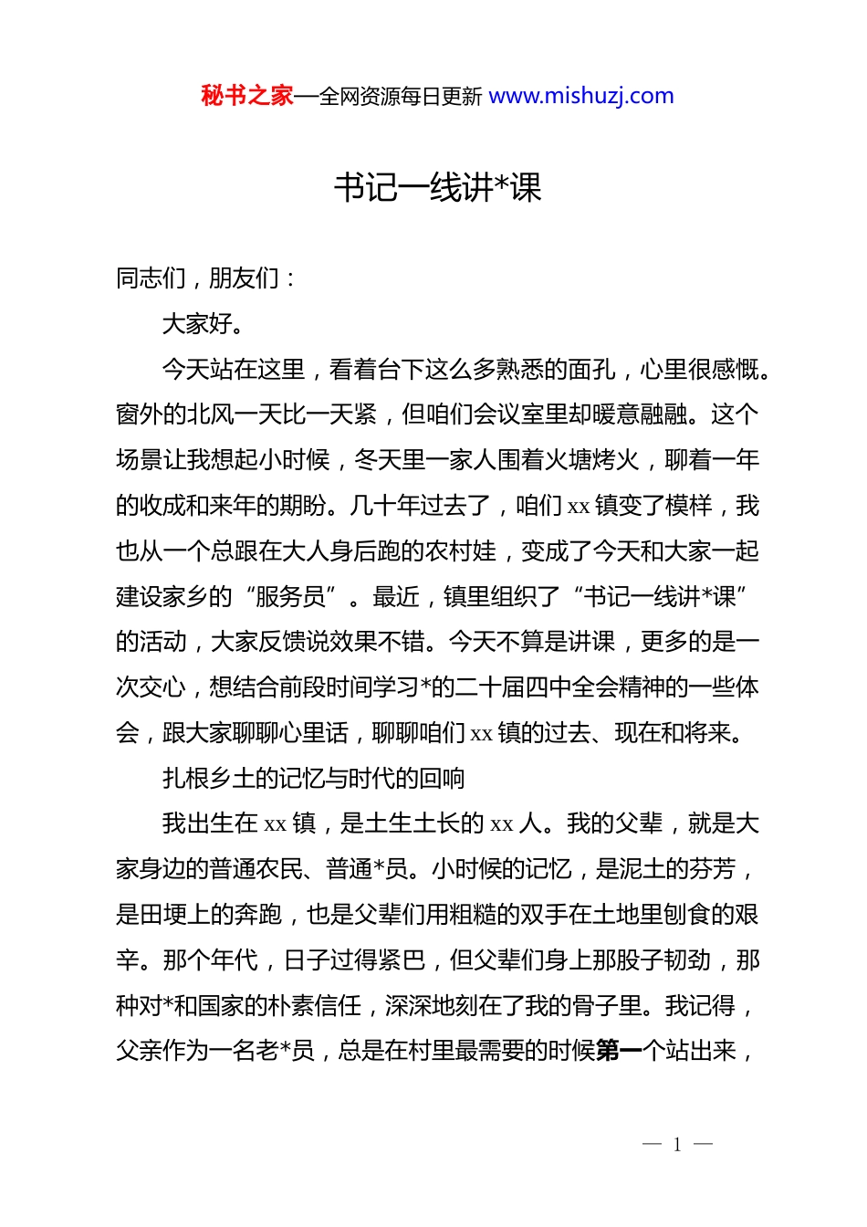秘书之家—全网资源每日更新 www.mishuzj.com书记一线讲*课同志们,朋友们:大家好。今天站在这里,看着台下这么多熟悉的面孔,心里很感慨。窗外的北风一天比一天紧,但咱们会议室里却暖意融融。这个场景让我想起小时候,冬天里一家人围着火塘烤火,聊着一年的收成和来年的期盼。几十年过去了,咱们 xx 镇变了模样,我也从一个总跟在大人身后跑的农村娃,变成了今天和大家一起建设家乡的“服务员”。最近,镇里组织了“书记一线讲*课”的活动,大家反馈说效果不错。今天不算是讲课,更多的是一次交心,想结合前段时间学习*的二十届四中全会精神的一些体会,跟大家聊聊心里话,聊聊咱们 xx 镇的过去、现在和将来。扎根乡土的记忆与时代的回响我出生在 xx 镇,是土生土长的 xx 人。我的父辈,就是大家身边的普通农民、普通*员。小时候的记忆,是泥土的芬芳,是田埂上的奔跑,也是父辈们用粗糙的双手在土地里刨食的艰辛。那个年代,日子过得紧巴,但父辈们身上那股子韧劲,那种对*和国家的朴素信任,深深地刻在了我的骨子里。我记得,父亲作为一名老*员,总是在村里最需要的时候第一个站出来,— 1 —秘书之家—全网资源每日更新 www.mishuzj.com修路、筑坝、调解邻里纠纷,他常说:“*员就是要在群众需要的时候,搭把手、出份力。”。这种耳濡目染的家庭教育,是我对“*”这个字最初的、也是最深刻的认识。后来,我走出大山去上学、去工作,有机会接触到更广阔的世界。每一次回到家乡,都能感受到这里的点滴变化。泥泞路变成了水泥路,土坯房换成了小楼房,孩子们的读书声更响亮了,乡亲们的腰包也一天天鼓起来了。我深知,这一切的改变,离不开国家的繁荣富强,更离不开*组织的坚强领导和一代代*员的接续奋斗。就像我自己,从一个懵懂少年,到光荣地加入*组织,再到今天有机会为大家服务,每一步成长都离不开组织的培养和关怀。我常常感到,个人的命运,从来都与家乡的兴衰、与国家的命运紧密相连。前段时间,*的二十届四中全会胜利召开。学习全会公报的时候,那些文字对我来说,不是遥远的政治口号,而是一阵阵历史的回响。当读到要“加快农业农村现代化,扎实推进乡村全面振兴”时,我眼前浮现的,就是咱们 xx 镇的青山绿水、田间地头。当读到要“巩固拓展脱贫攻坚成果,推动农业更强、农村更美、农民更富”时,我心里想的,就是如何让乡亲们的日子过得更红火,让孩子们的未来更有盼头。这些宏大的国家战略,最终都要落到每一片土地、每一个家庭、每一个人身上。— 2 —秘书之家—全网资源每日更新 www.mishuzj.com它与我的成长经历、与在座每一位的切身利益都息息相关。这正是我想和大家交流的第一个感悟:国家的大政方针,就是咱们小家庭幸福生活的“压舱石”和“指南针”,理解了它,就理解了咱们未来的方向。从发展蓝图到前行足迹让产业振兴深植脚下土地空谈误国,实干兴邦。全会的精神要如何从文件走进现实?我想,关键就在于“干”,在于找到适合咱们 xx 镇自己的路子。全会强调,产业是乡村振兴的基石。没有产业,乡村振兴就是无源之水、无本之木。回想过去,咱们 xx 镇守着好山好水,农业却长期停留在“靠天吃饭”的阶段,乡亲们辛辛苦苦一年,收入却很有限。如何把绿水青山变成金山银山,一直是摆在面前的一道难题。这些年,经过不断的摸索和尝试,大家开始认识到,必须走特色化、差异化的发展之路。就拿咱们洞心村的食用菌基地来说。前不久,我跟基地负责人和在那务工的*员代表们一起,在菌棚里开了一场别开生面的“现场*课”。当时,务工代表范锡曼大姐说的一句话让我印象特别深,她说:“书记把*课搬到菌棚里,讲的都是咱们关心的事,这下心里亮堂了,干活更有劲了!”其实,不是我讲得有多好,而是全会精神本身就带着力量,带着温度。我只是结合— 3 —秘书之家—全网资源每日更新 www.mishuzj.com咱们镇的实际,把全会关于发展乡村特色产业、拓宽农民增收渠道的决策部署,用大家听得懂的乡音翻译了一遍。我告诉他们,国家鼓励发展多元业态,推动农业与旅游、文化、康养等产业的深度融合。咱们的食用菌产业不能只满足于种植和初级销售,要朝着...