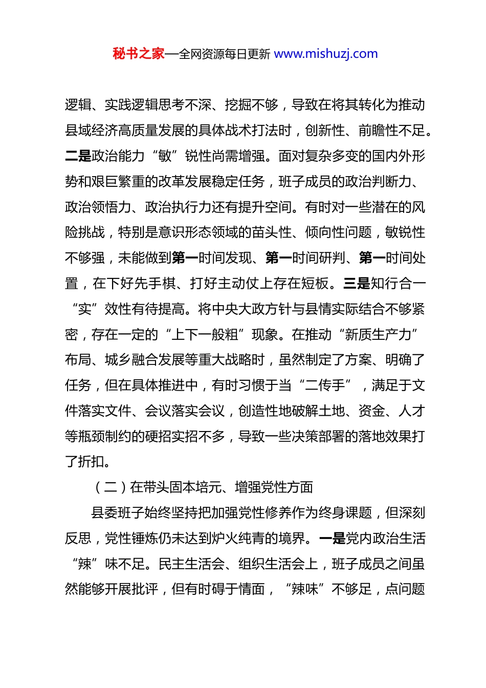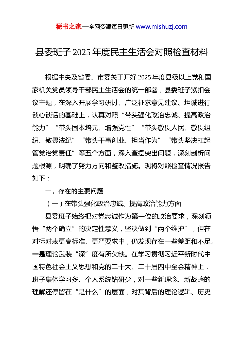 秘书之家—全网资源每日更新 www.mishuzj.com县委班子 2025 年度民主生活会对照检查材料 根据中央及省委、市委关于开好 2025 年度县级以上党和国家机关党员领导干部民主生活会的统一部署,县委班子紧扣会议主题,在深入开展学习研讨、广泛征求意见建议、坦诚进行谈心谈话的基础上,认真对照“带头强化政治忠诚、提高政治能力”“带头固本培元、增强党性”“带头敬畏人民、敬畏组织、敬畏法纪”“带头干事创业、担当作为”“带头坚决扛起管党治党责任”等五个方面,深入查摆突出问题,深刻剖析问题根源,明确了努力方向和整改措施。现将对照检查情况报告如下:一、存在的主要问题(一)在带头强化政治忠诚、提高政治能力方面县委班子始终把对党忠诚作为第一位的政治要求,深刻领悟“两个确立”的决定性意义,坚决做到“两个维护”,但在对标对表更高标准、更严要求中,仍发现存在一些差距和不足。一是理论武装“深”度有所欠缺。在学习贯彻习近平新时代中国特色社会主义思想和党的二十大、二十届四中全会精神上,班子集体学习多、个人系统钻研少,对一些新理念、新战略的理解还停留在“是什么”的层面,对其背后的理论逻辑、历史秘书之家—全网资源每日更新 www.mishuzj.com逻辑、实践逻辑思考不深、挖掘不够,导致在将其转化为推动县域经济高质量发展的具体战术打法时,创新性、前瞻性不足。二是政治能力“敏”锐性尚需增强。面对复杂多变的国内外形势和艰巨繁重的改革发展稳定任务,班子成员的政治判断力、政治领悟力、政治执行力还有提升空间。有时对一些潜在的风险挑战,特别是意识形态领域的苗头性、倾向性问题,敏锐性不够强,未能做到第一时间发现、第一时间研判、第一时间处置,在下好先手棋、打好主动仗上存在短板。三是知行合一“实”效性有待提高。将中央大政方针与县情实际结合不够紧密,存在一定的“上下一般粗”现象。在推动“新质生产力”布局、城乡融合发展等重大战略时,虽然制定了方案、明确了任务,但在具体推进中,有时习惯于当“二传手”,满足于文件落实文件、会议落实会议,创造性地破解土地、资金、人才等瓶颈制约的硬招实招不多,导致一些决策部署的落地效果打了折扣。(二)在带头固本培元、增强党性方面县委班子始终坚持把加强党性修养作为终身课题,但深刻反思,党性锤炼仍未达到炉火纯青的境界。一是党内政治生活“辣”味不足。民主生活会、组织生活会上,班子成员之间虽然能够开展批评,但有时碍于情面,“辣味”不够足,点问题秘书之家—全网资源每日更新 www.mishuzj.com多是“工作建议式”的,剖析根源多是“蜻蜓点水式”的,未能真正达到“红脸出汗、排毒治病”的效果,党内政治生活的政治性、时代性、原则性、战斗性有待进一步增强。二是理想信念“钙”质补充不够及时。在日常工作中,埋头于具体事务的时间多,静下心来固本培元、补钙壮骨的时间少。少数班子成员在面对长期积累的矛盾和困难时,偶尔会产生畏难情绪和“歇歇脚”的想法,理想信念的“压舱石”作用发挥不够充分,革命精神和斗争精神有所减弱。三是红色基因“融”合传承不够深入。对县丰富的红色文化资源挖掘、保护和利用的系统性谋划不足,未能将其有效转化为锤炼干部党性、教育引导群众的鲜活教材。在日常工作中,讲发展指标、经济数据多,讲光荣传统、革命精神少,红色基因的时代价值未能得到充分彰显和传承。(三)在带头敬畏人民、敬畏组织、敬畏法纪方面县委班子始终坚持人民至上,严格遵守党的纪律规矩,但在厚植为民情怀、严守纪律底线上仍有不足。一是宗旨意识“根”植不够牢固。虽然经常强调“以人民为中心”,但在决策过程中,有时存在“精英视角”,认为自己考虑得更专业、更长远,深入基层一线听取群众原汁原味的意见建议不够充分。比如,在去年某项老旧小区改造工程中,前期方案设计更多考秘书之家—全网资源每日更新 www.mishuzj.com虑了整体美观和施工便利,对部分居民提出的“增加晾晒区”“保留小菜园”等个性化需求未能充分吸纳,导致工程完成后群众满意度未达预期。二是组织观念“弦”绷得不够紧。在执行民主集中制上,总体是好的,但有时也存在一些偏...