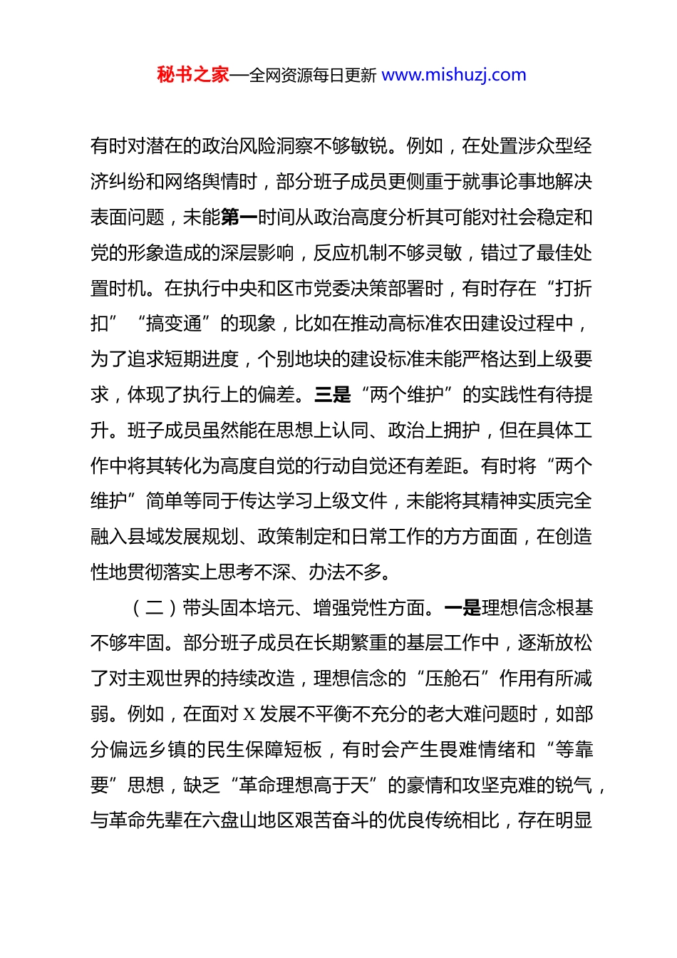 秘书之家—全网资源每日更新 www.mishuzj.com县委领导班子 2025 年度民主生活会对照检查材料 根据中央和区市党委关于开好 2025 年度民主生活会的统一部署,X 县委领导班子紧扣会议主题,在深入开展学习研讨、广泛征求意见建议、坦诚进行谈心谈话的基础上,严格对照“五个重点”方面要求,深入查摆问题、深刻剖析根源、明确整改方向。现将对照检查情况报告如下:一、存在的问题(一)带头强化政治忠诚、提高政治能力方面。一是政治理论学习的深度和转化度不足。班子在学习贯彻习近平新时代中国特色社会主义思想上,还存在“任务化”“碎片化”倾向,集中学习多、深入研讨少,对党的二十大及二十届历次全会精神的理解未能完全做到融会贯通。比如,在学习关于“新时代支持革命老区振兴发展”的重要论述时,虽然组织了专题学习,但在如何将其与 X 县“红色资源+生态旅游”的发展定位精准结合、转化为具体项目抓手方面,研究得不够透彻,导致部分政策红利未能充分释放,一些革命旧址的挖掘利用程度不深,与乡村振兴的衔接不够紧密。二是政治判断力、领悟力、执行力有待加强。面对复杂严峻的外部环境和县域发展内部矛盾,秘书之家—全网资源每日更新 www.mishuzj.com有时对潜在的政治风险洞察不够敏锐。例如,在处置涉众型经济纠纷和网络舆情时,部分班子成员更侧重于就事论事地解决表面问题,未能第一时间从政治高度分析其可能对社会稳定和党的形象造成的深层影响,反应机制不够灵敏,错过了最佳处置时机。在执行中央和区市党委决策部署时,有时存在“打折扣”“搞变通”的现象,比如在推动高标准农田建设过程中,为了追求短期进度,个别地块的建设标准未能严格达到上级要求,体现了执行上的偏差。三是“两个维护”的实践性有待提升。班子成员虽然能在思想上认同、政治上拥护,但在具体工作中将其转化为高度自觉的行动自觉还有差距。有时将“两个维护”简单等同于传达学习上级文件,未能将其精神实质完全融入县域发展规划、政策制定和日常工作的方方面面,在创造性地贯彻落实上思考不深、办法不多。(二)带头固本培元、增强党性方面。一是理想信念根基不够牢固。部分班子成员在长期繁重的基层工作中,逐渐放松了对主观世界的持续改造,理想信念的“压舱石”作用有所减弱。例如,在面对 X 发展不平衡不充分的老大难问题时,如部分偏远乡镇的民生保障短板,有时会产生畏难情绪和“等靠要”思想,缺乏“革命理想高于天”的豪情和攻坚克难的锐气,与革命先辈在六盘山地区艰苦奋斗的优良传统相比,存在明显秘书之家—全网资源每日更新 www.mishuzj.com差距。二是党性锤炼的主动性和自觉性不足。落实党内政治生活准则有时不够严格,批评与自我批评“辣味”不足,存在“你好我好大家好”的老好人思想。在民主生活会上,对他人批评往往点到为止,对自己问题则避重就轻,未能真正达到“红脸出汗、排毒治病”的效果。双重组织生活制度执行不到位,有的班子成员因工作忙等原因,参加所在支部组织生活次数偏少,与普通党员交流互动不深。三是宗旨意识树立得不够扎实。虽然经常强调“以人民为中心”,但在实际工作中,“官本位”思想仍有残留,未能始终将群众满意度作为衡量工作的最高标准。比如,在推进城市更新项目中,对拆迁户的实际困难和诉求调研不够细致,政策解释不够耐心,导致个别项目推进受阻,引发群众不满。深入基层调研存在“走马观花”现象,下乡镇多、进村入户少,与普通群众特别是困难群体面对面交流不够,对群众的真实想法和急难愁盼问题掌握不全面、不精准。(三)带头敬畏人民、敬畏组织、敬畏法纪方面。一是对“敬畏人民”的理解停留在概念层面。未能真正将人民群众放在心中最高位置,为民服务的主动性不够强。例如,对于“12345”政务服务便民热线反馈的问题,有时批转办理了事,缺乏跟踪问效和举一反三,导致同类问题反复出现,群众获得秘书之家—全网资源每日更新 www.mishuzj.com感不强。在制定涉及群众切身利益的政策时,公开征求意见不够广泛深入,未能完全做到“从群众中来,到群众中去”。二是对“敬畏组织”的践行不够到位。有的班子成员组织观念有所淡...