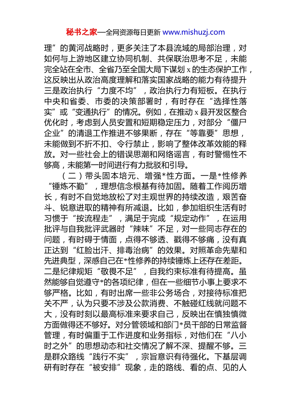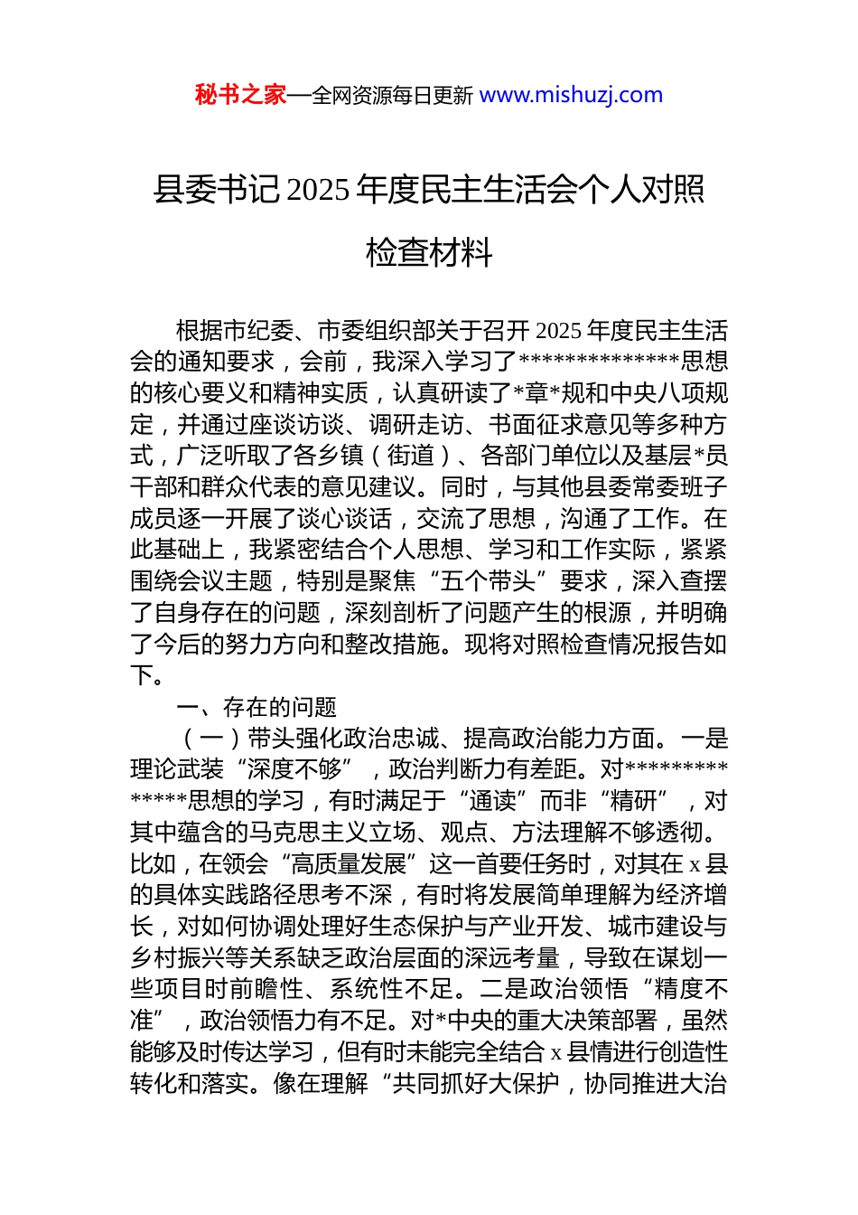 秘书之家—全网资源每日更新 www.mishuzj.com县委书记 2025 年度民主生活会个人对照检查材料根据市纪委、市委组织部关于召开 2025 年度民主生活会的通知要求,会前,我深入学习了**************思想的核心要义和精神实质,认真研读了*章*规和中央八项规定,并通过座谈访谈、调研走访、书面征求意见等多种方式,广泛听取了各乡镇(街道)、各部门单位以及基层*员干部和群众代表的意见建议。同时,与其他县委常委班子成员逐一开展了谈心谈话,交流了思想,沟通了工作。在此基础上,我紧密结合个人思想、学习和工作实际,紧紧围绕会议主题,特别是聚焦“五个带头”要求,深入查摆了自身存在的问题,深刻剖析了问题产生的根源,并明确了今后的努力方向和整改措施。现将对照检查情况报告如下。一、存在的问题(一)带头强化政治忠诚、提高政治能力方面。一是理论武装“深度不够”,政治判断力有差距。对**************思想的学习,有时满足于“通读”而非“精研”,对其中蕴含的马克思主义立场、观点、方法理解不够透彻。比如,在领会“高质量发展”这一首要任务时,对其在 x 县的具体实践路径思考不深,有时将发展简单理解为经济增长,对如何协调处理好生态保护与产业开发、城市建设与乡村振兴等关系缺乏政治层面的深远考量,导致在谋划一些项目时前瞻性、系统性不足。二是政治领悟“精度不准”,政治领悟力有不足。对*中央的重大决策部署,虽然能够及时传达学习,但有时未能完全结合 x 县情进行创造性转化和落实。像在理解“共同抓好大保护,协同推进大治秘书之家—全网资源每日更新 www.mishuzj.com理”的黄河战略时,更多关注了本县流域的局部治理,对如何与上游地区建立协同机制、共保联治思考不足,未能完全站在全市、全省乃至全国大局下谋划 x 的生态保护工作,这反映出从政治高度理解和落实国家战略的能力有待提升三是政治执行“力度不均”,政治执行力有短板。在执行中央和省委、市委的决策部署时,有时存在“选择性落实”或“变通执行”的情况。例如,在推动 x 县开发区整合优化时,考虑到人员安置和短期稳定压力,对部分“僵尸企业”的清退工作推进不够果断,存在“等靠要”思想,未能做到不折不扣、令行禁止,影响了整体改革效能的释放。对一些社会上的错误思潮和网络谣言,有时警惕性不够高,未能第一时间进行有力批驳和引导。(二)带头固本培元、增强*性方面。一是*性修养“锤炼不勤”,理想信念根基有待加固。随着工作阅历增长,有时不自觉地放松了对主观世界的持续改造,艰苦奋斗、锐意进取的精神有所减退。比如,参加组织生活有时习惯于“按流程走”,满足于完成“规定动作”,在运用批评与自我批评武器时“辣味”不足,对一些同志存在的问题,有时碍于情面,点得不够透、戳得不够痛,没有真正达到“红脸出汗、排毒治病”的效果。对照革命先辈和先进典型,深感自己在*性修养的持续锤炼上还存在差距。二是纪律规矩“敬畏不足”,自我约束标准有待提高。虽然能够自觉遵守*的各项纪律,但在一些细节小事上要求不够严格。比如,有时出席一些非公务场合,对接待标准把关不严,认为只要不涉及公款消费、不触碰红线就问题不大,没有时刻以最高标准来要求自己,反映出在慎独慎微方面做得还不够好。对分管领域和部门*员干部的日常监督管理,有时偏重于工作进度和业务指标,对他们在“八小时之外”的思想动态和社交情况了解不深、提醒不够。三是群众路线“践行不实”,宗旨意识有待强化。下基层调研有时存在“被安排”现象,走的路线、看的点、见的人秘书之家—全网资源每日更新 www.mishuzj.com都是事先准备好的,虽然也到了田间地头、农户家里,但真正静下心来与群众同坐一条板凳、倾听原汁原味意见的时候不多。比如,在处理 x 县老城区供暖管道改造引发的群众投诉时,起初只是批转给分管领导和住建局处理,自己没有第一时间深入到居民家中实地查看、了解冷暖,导致问题解决不够彻底,直到部分群众再次反映才引起重视,这说明“从群众中来、到群众中去”的根本工作方法坚持得不够好。(三)带头敬畏人民、敬畏组织、敬畏法纪方面。一是敬畏人民“情怀不深”...