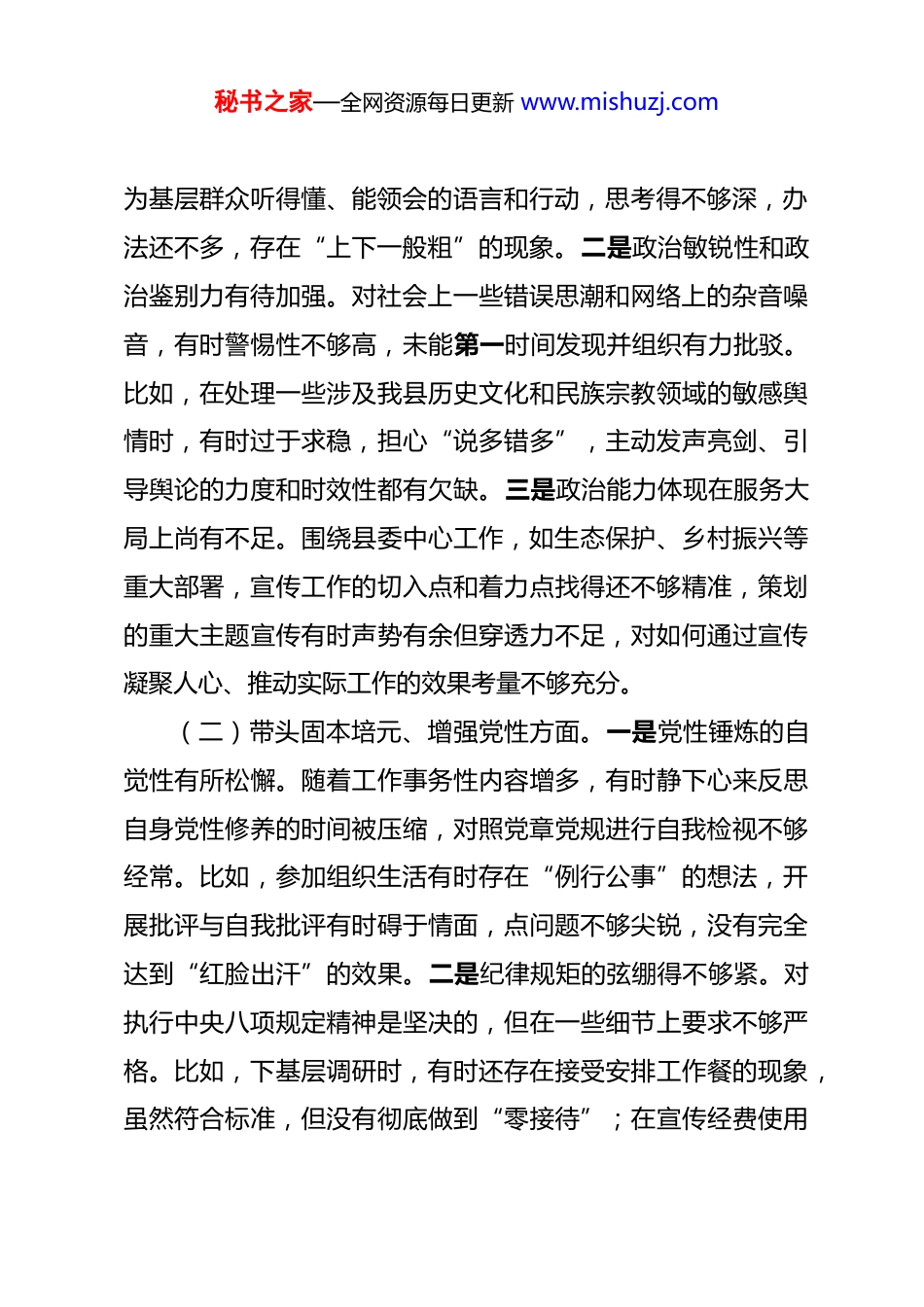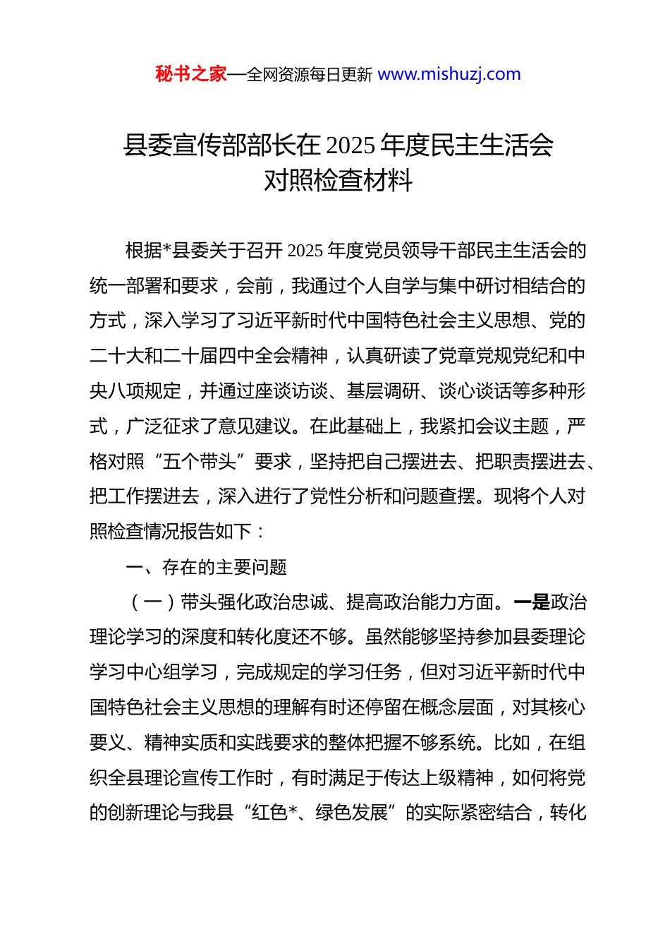 秘书之家—全网资源每日更新 www.mishuzj.com县委宣传部部长在 2025 年度民主生活会对照检查材料 根据*县委关于召开 2025 年度党员领导干部民主生活会的统一部署和要求,会前,我通过个人自学与集中研讨相结合的方式,深入学习了习近平新时代中国特色社会主义思想、党的二十大和二十届四中全会精神,认真研读了党章党规党纪和中央八项规定,并通过座谈访谈、基层调研、谈心谈话等多种形式,广泛征求了意见建议。在此基础上,我紧扣会议主题,严格对照“五个带头”要求,坚持把自己摆进去、把职责摆进去、把工作摆进去,深入进行了党性分析和问题查摆。现将个人对照检查情况报告如下:一、存在的主要问题(一)带头强化政治忠诚、提高政治能力方面。一是政治理论学习的深度和转化度还不够。虽然能够坚持参加县委理论学习中心组学习,完成规定的学习任务,但对习近平新时代中国特色社会主义思想的理解有时还停留在概念层面,对其核心要义、精神实质和实践要求的整体把握不够系统。比如,在组织全县理论宣传工作时,有时满足于传达上级精神,如何将党的创新理论与我县“红色*、绿色发展”的实际紧密结合,转化秘书之家—全网资源每日更新 www.mishuzj.com为基层群众听得懂、能领会的语言和行动,思考得不够深,办法还不多,存在“上下一般粗”的现象。二是政治敏锐性和政治鉴别力有待加强。对社会上一些错误思潮和网络上的杂音噪音,有时警惕性不够高,未能第一时间发现并组织有力批驳。比如,在处理一些涉及我县历史文化和民族宗教领域的敏感舆情时,有时过于求稳,担心“说多错多”,主动发声亮剑、引导舆论的力度和时效性都有欠缺。三是政治能力体现在服务大局上尚有不足。围绕县委中心工作,如生态保护、乡村振兴等重大部署,宣传工作的切入点和着力点找得还不够精准,策划的重大主题宣传有时声势有余但穿透力不足,对如何通过宣传凝聚人心、推动实际工作的效果考量不够充分。(二)带头固本培元、增强党性方面。一是党性锤炼的自觉性有所松懈。随着工作事务性内容增多,有时静下心来反思自身党性修养的时间被压缩,对照党章党规进行自我检视不够经常。比如,参加组织生活有时存在“例行公事”的想法,开展批评与自我批评有时碍于情面,点问题不够尖锐,没有完全达到“红脸出汗”的效果。二是纪律规矩的弦绷得不够紧。对执行中央八项规定精神是坚决的,但在一些细节上要求不够严格。比如,下基层调研时,有时还存在接受安排工作餐的现象,虽然符合标准,但没有彻底做到“零接待”;在宣传经费使用秘书之家—全网资源每日更新 www.mishuzj.com上,虽然大的方向把得住,但对一些项目的绩效评估不够精细,存在“重投入、轻问效”的情况。三是艰苦奋斗精神有所弱化。思想上认为现在条件好了,在一些非原则性的工作上,有时会不自觉地放松要求。比如,在策划宣传活动时,有时更倾向于选择容易出彩、见效快的“显绩”,而对一些需要久久为功的基础性工作,如农村精神文明创建、农家书屋的实效化管理等,投入的精力和支持力度相对不足。(三)带头敬畏人民、敬畏组织、敬畏法纪方面。一是践行群众路线不够深入。虽然经常下基层,但“身入”有余,“心至”不足。比如,到乡镇调研宣传文化工作,多是听汇报、看点位,与普通群众坐下来拉拉家常、听听他们真实想法的时候不多,对群众在精神文化需求上的新期待,比如对优质短视频内容、接地气的文艺活动渴望,了解得不够透彻,导致我们提供的文化服务有时与群众需求存在“错位”。二是组织观念有待强化。在执行民主集中制方面,有时在部务会上讨论问题,对自己分管领域的工作说得较多,对其他同志分管的工作发表意见不够主动,存在一定的“本位主义”思想。对上级的决策部署,虽然能够执行,但有时未能完全从全局高度去理解和推动,偶尔会有“宣传部门主要是敲边鼓”的片面认识。三是法治思维和依法办事能力需提升。对法律法规的学习不够系统,秘书之家—全网资源每日更新 www.mishuzj.com运用法治方式处理宣传领域问题的能力有待加强。比如,在管理县域新媒体平台、处理网络谣言时,有时更依赖行政手段和经验判断,对相关法律法规的...