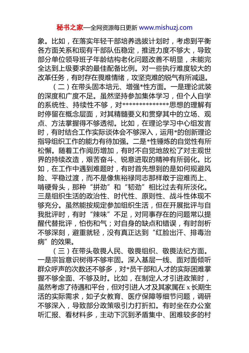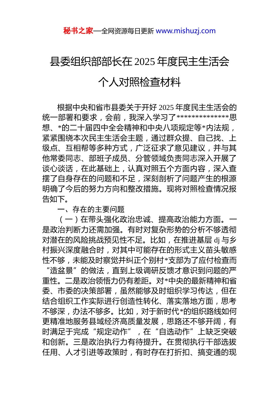 秘书之家—全网资源每日更新 www.mishuzj.com县委组织部部长在 2025 年度民主生活会个人对照检查材料根据中央和省市县委关于开好 2025 年度民主生活会的统一部署和要求,会前,我深入学习了**************思想、*的二十届四中全会精神和中央八项规定等*内法规,紧紧围绕本次民主生活会主题,通过群众提、自己找、上级点、互相帮等多种方式,广泛征求了意见建议,并与其他常委同志、部班子成员、分管领域负责同志深入开展了谈心谈话,在此基础上,认真对照五个方面内容,深入查摆了自身存在的问题和不足,深刻剖析了问题产生的根源明确了今后的努力方向和整改措施。现将对照检查情况报告如下。一、存在的主要问题(一)在带头强化政治忠诚、提高政治能力方面。一是政治判断力还需加强。有时对复杂形势的分析不够透彻对潜在的风险挑战预见性不足。比如,在推进基层 dj 与乡村振兴深度融合时,对其中可能存在的形式主义苗头敏感性不够,未能及时察觉并纠正个别村*支部为了应付检查而“造盆景”的做法,直到上级调研反馈才意识到问题的严重性。二是政治领悟力仍有差距。对*中央的最新精神和省委、市委的决策部署,虽然能够及时组织学习传达,但在结合组织工作实际进行创造性转化、落实落地方面,思考不够深,办法不够多。比如,对于新时代*的组织路线如何更精准地服务县域经济高质量发展,思路还不够开阔,有时满足于完成“规定动作”,在“自选动作”上缺乏突破和创新。三是政治执行力有待提升。在贯彻执行干部选拔任用、人才引进等政策时,有时存在打折扣、搞变通的现秘书之家—全网资源每日更新 www.mishuzj.com象。比如,在落实年轻干部培养选拔计划时,考虑到平衡各方面关系和现有干部队伍稳定,推进力度不够大,导致部分单位领导班子年龄结构老化问题改善不明显,未能完全达到上级要求的最佳配备比例。对一些执行难度较大的改革任务,有时存在畏难情绪,攻坚克难的锐气有所减退。(二)在带头固本培元、增强*性方面。一是理论武装的深度和广度不足。虽然坚持参加集体学习,但个人自学的系统性、持续性不够,对**************思想的理解有时停留在概念层面,对其精髓要义和贯穿其中的立场、观点、方法掌握得不够透彻。比如,在理论学习中心组发言时,有时结合工作实际谈体会不够深入,运用*的创新理论指导组织工作的能力有待加强。二是*性锤炼的自觉性有所松懈。随着工作阅历增加,有时不自觉地放松了对主观世界的持续改造,艰苦奋斗、锐意进取的精神有所弱化。比如,在工作中遇到难题时,有时首先想到的是如何规避风险、平稳过渡,而不是像焦裕禄同志那样敢于迎难而上、啃硬骨头,那种“拼劲”和“韧劲”相比过去有所淡化。三是组织生活的政治性、时代性、原则性、战斗性体现不够充分。虽然能按规定参加组织生活,但在开展批评与自我批评时,有时“辣味”不足,对同事存在的问题常以提醒代替批评,怕伤和气;对自身的缺点和错误,有时剖析不够深刻,避重就轻,没有真正达到“红脸出汗、排毒治病”的效果。(三)在带头敬畏人民、敬畏组织、敬畏法纪方面。一是宗旨意识树得不够牢固。深入基层一线、面对面倾听群众呼声的次数还不够多,对*员干部和人才的实际困难掌握不够全面、不够及时。比如,在制定人才引进政策时,虽然考虑了待遇和平台,但对引进人才及其家属在 x 长期生活的实际需求,如子女教育、医疗保障等细节问题,调研不够深入,导致部分政策吸引力打折扣。有时坐在办公室听汇报、看材料多,主动下沉到矛盾集中、困难较多的村秘书之家—全网资源每日更新 www.mishuzj.com社和企业调研解决实际问题少。二是对组织的敬畏感需要进一步强化。在执行民主集中制方面,有时在干部调整等重大事项决策前,征求意见不够充分,酝酿沟通不够透彻对*组织赋予的权力,虽然能够认识到是责任和信任,但有时在具体工作中,程序意识、规矩意识不够强,比如在个别紧急性事务处理上,存在先办事后补手续的现象。三是对法纪的敬畏心有待加强。虽然能够带头学习 dj 法规,但在日常工作中,对一些“擦边球”行为的警惕性不够高,提醒、制止不够坚决。比如,对分管部门和联系单位存...